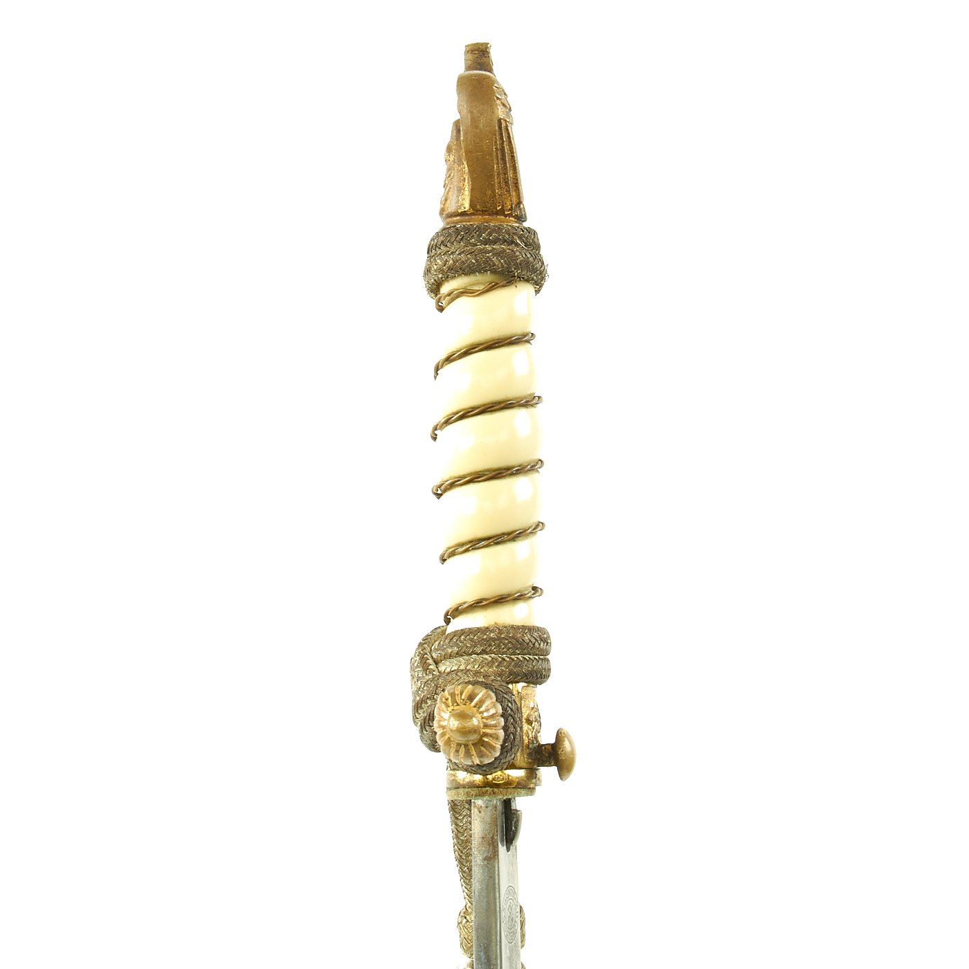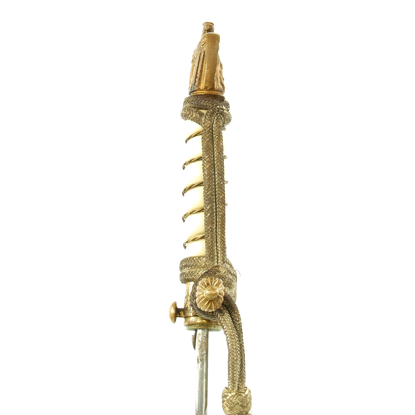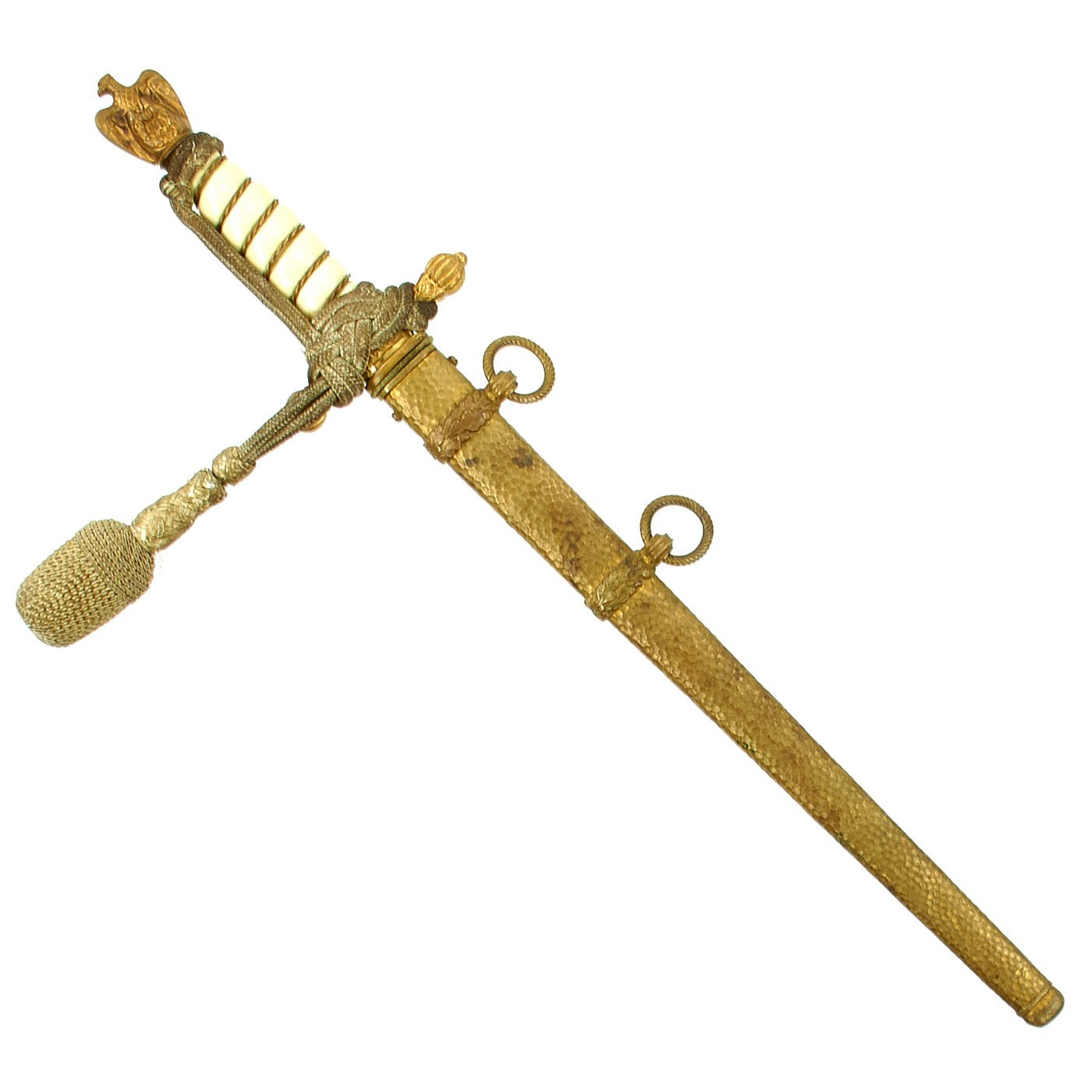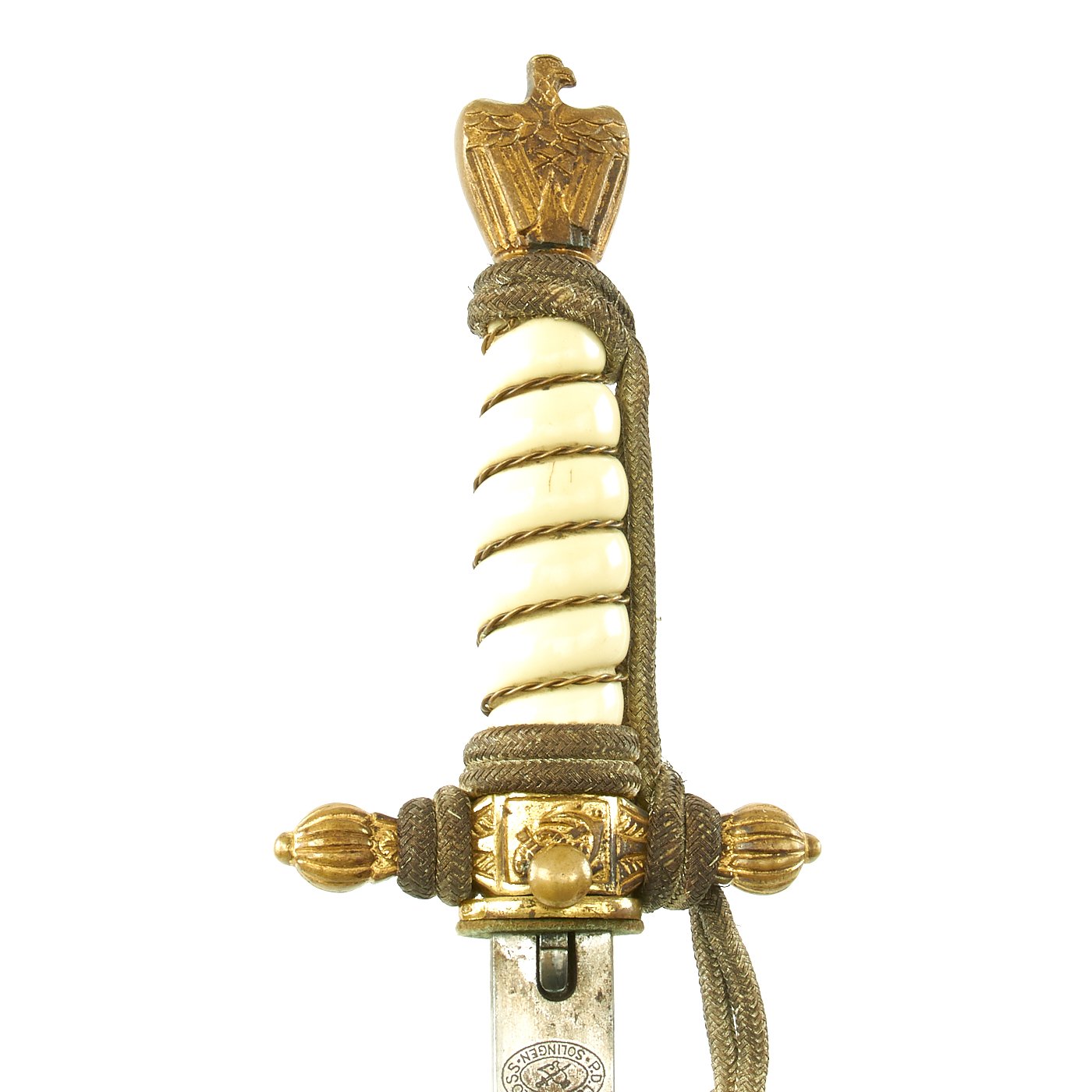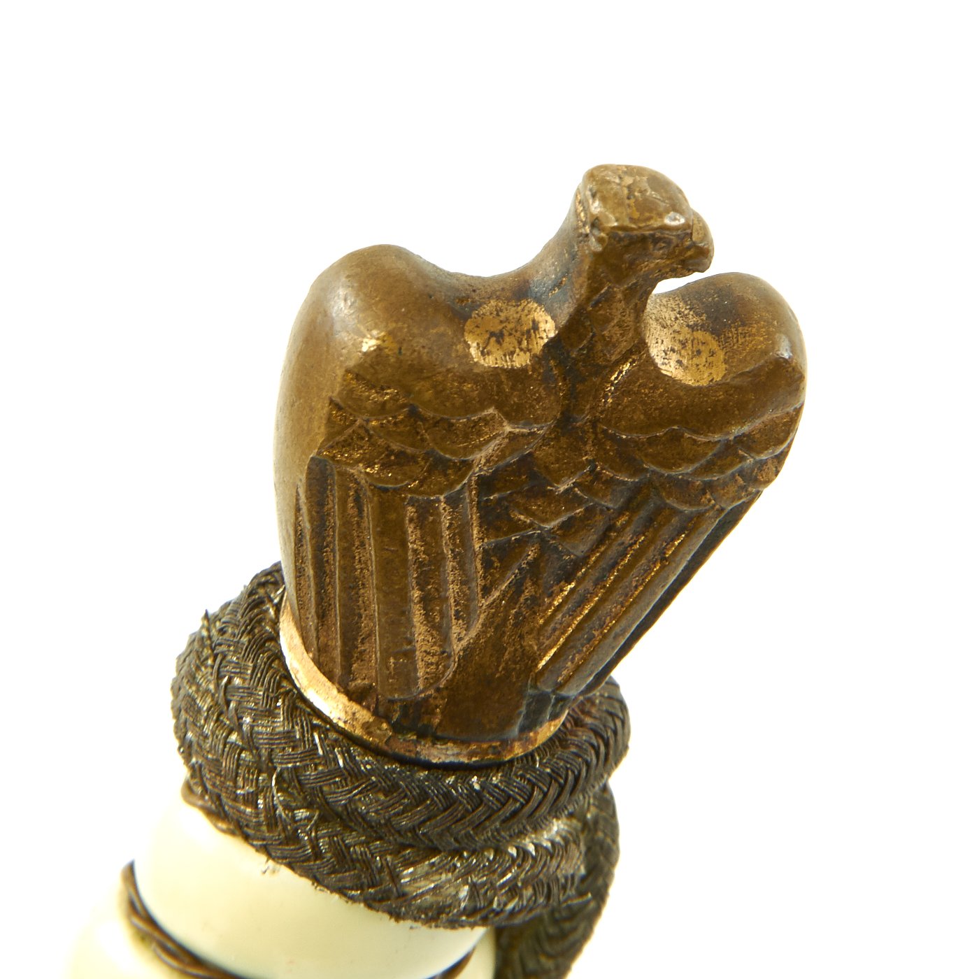 This example was almost certainly purchased by a high ranking officer early in the wartime period, as the pommel is a 1938 changeover type. It has very deeply inset wings and an impressive vault wreath. The details to this bird are also choice, with a striking eye, beak and breast. The crossguard is the standard type, and has the portepee wrapped around it. The grip is in excellent condition with a bit of age, and a few small surface cracks and staining, but still has a great ivory color. The twisted brass wire wrapping is in very good tight condition. Overall the grip shows some wear on the plating, so this was a dagger that was worn in service.