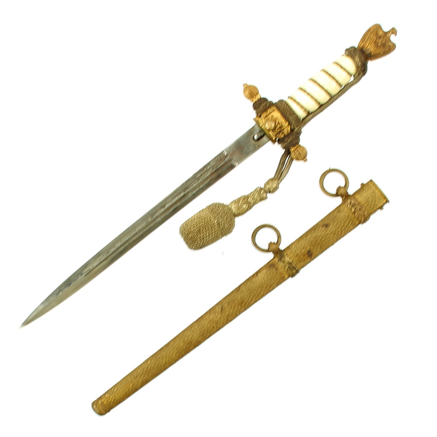 Original Item: Only One Available. This is a fine Solingen-Produced totally original WWII German 2nd Model Naval Kriegsmarine Dagger by P.D. Lüneschloss (P.D.L.), complete with the original hammered brass scabbard. Additionally, it also has an original portepee tied in the correct Naval style, which are hard to find, especially properly tied.