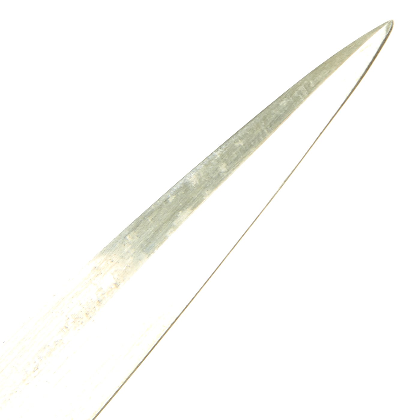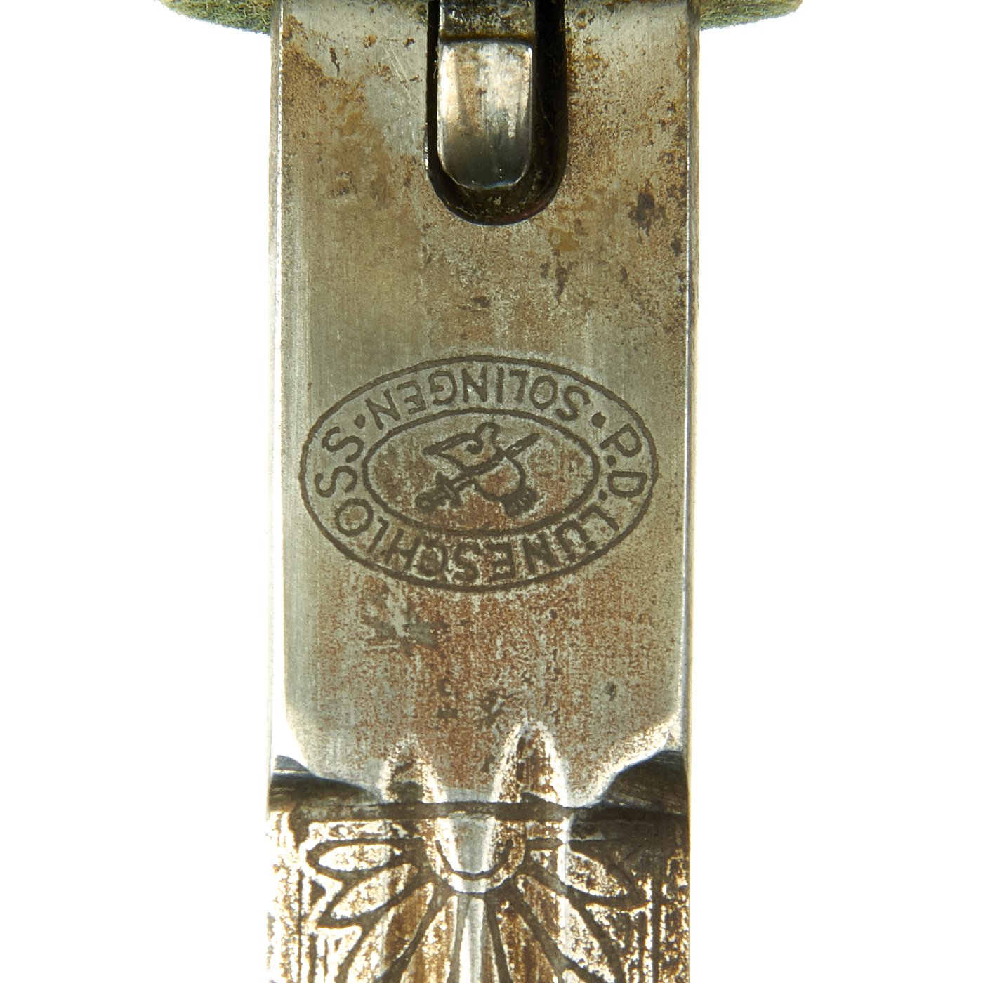 This well-known company was founded in 1810 by Peter Daniel Lüneschloss, and produced numerous edged weapons, both for domestic and foreign contracts. They manufactured many private purchase officer's swords and blades for the U.S. Civil war. This logo was particularly used during the Third Reich period, per J. Anthony Carter's work GERMAN KNIFE AND SWORD MAKERS. The original felt blade buffer is in place.