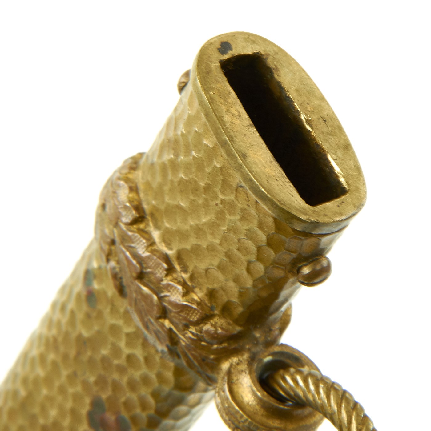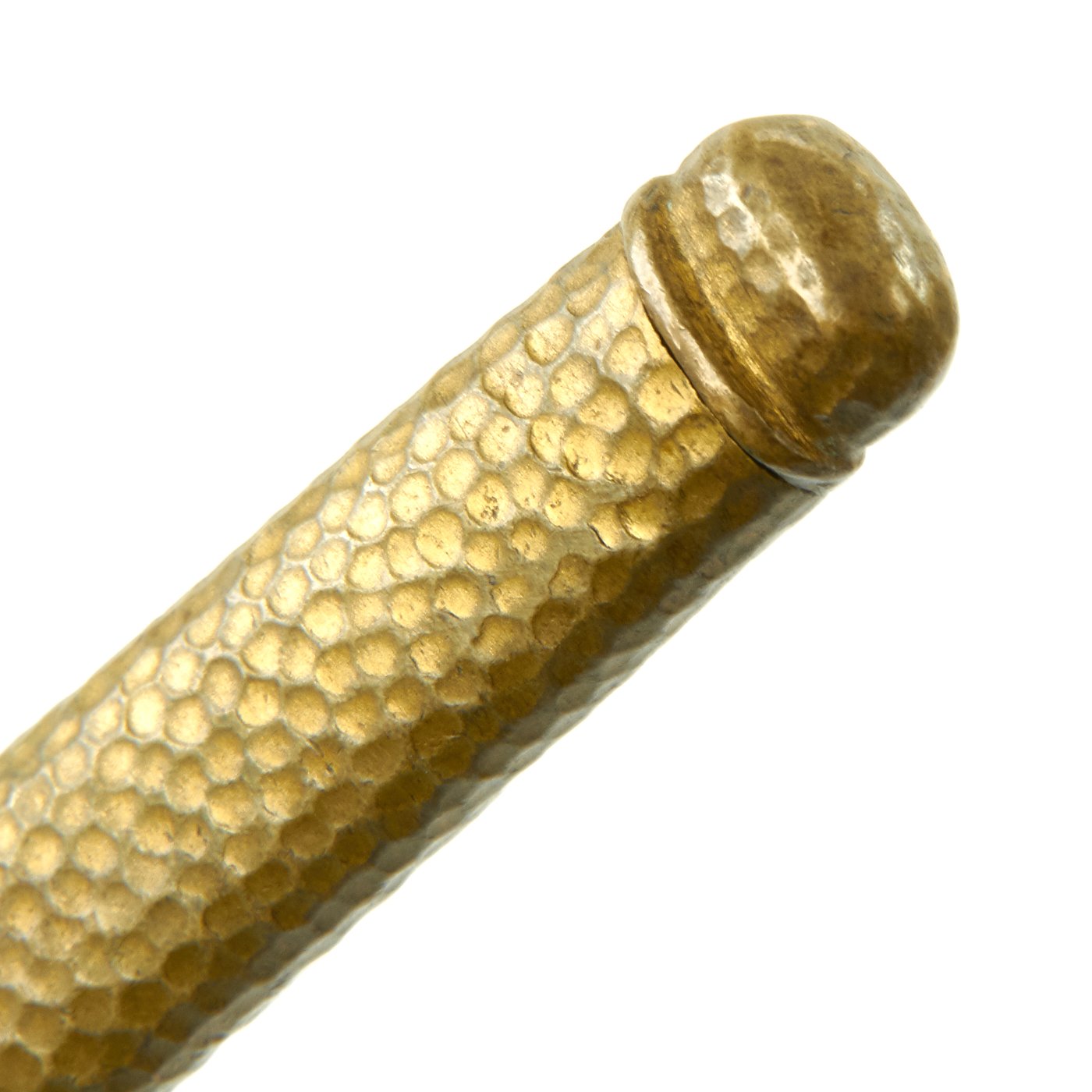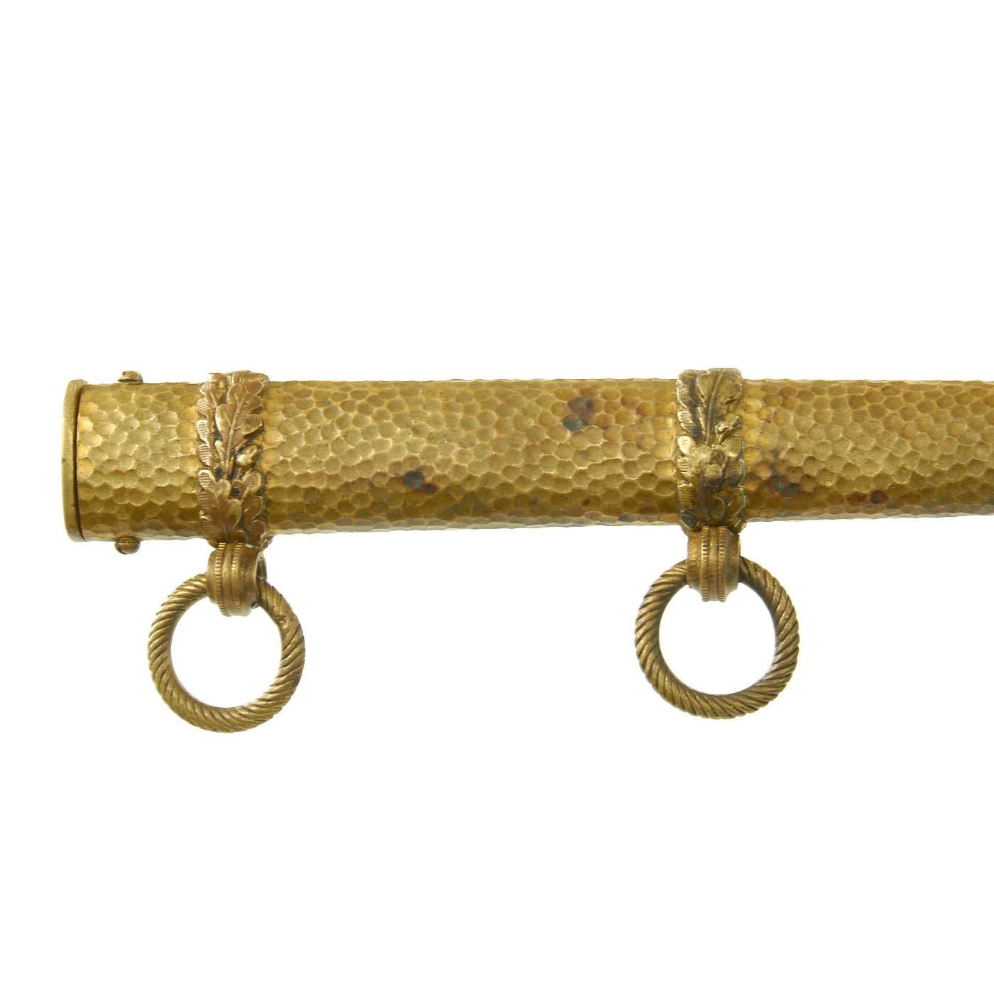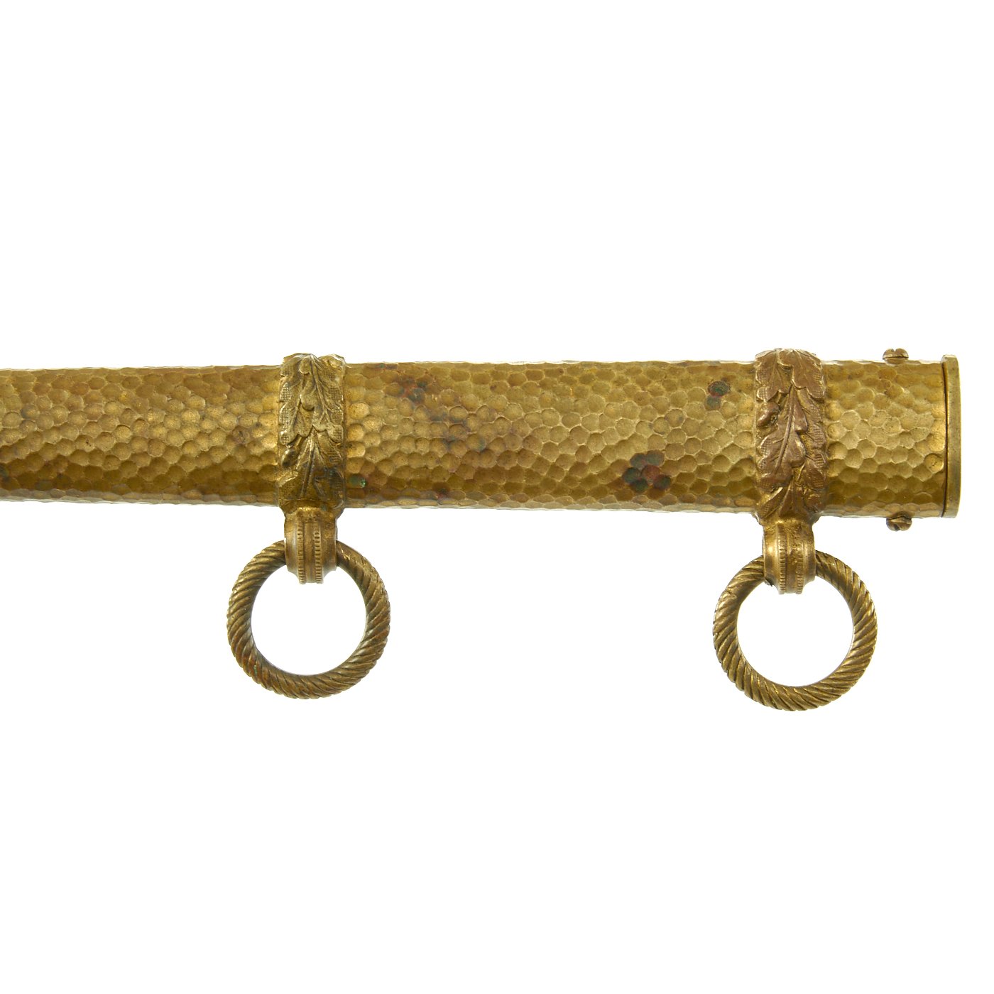 The hammered-brass scabbard is in very good used condition, with a lovely patina of age. There is fading to the gold plating, which is the type that evaporates over time, though in the hammer marks it is still present. The bands feature overlapping oak leaves and acorns, and are quite a bit more ornate than usually seen. The rings are still intact, and in good shape, and retained by decorated loops on the bands. The throat is retained by two dome head screws.