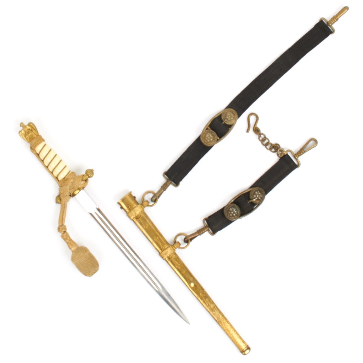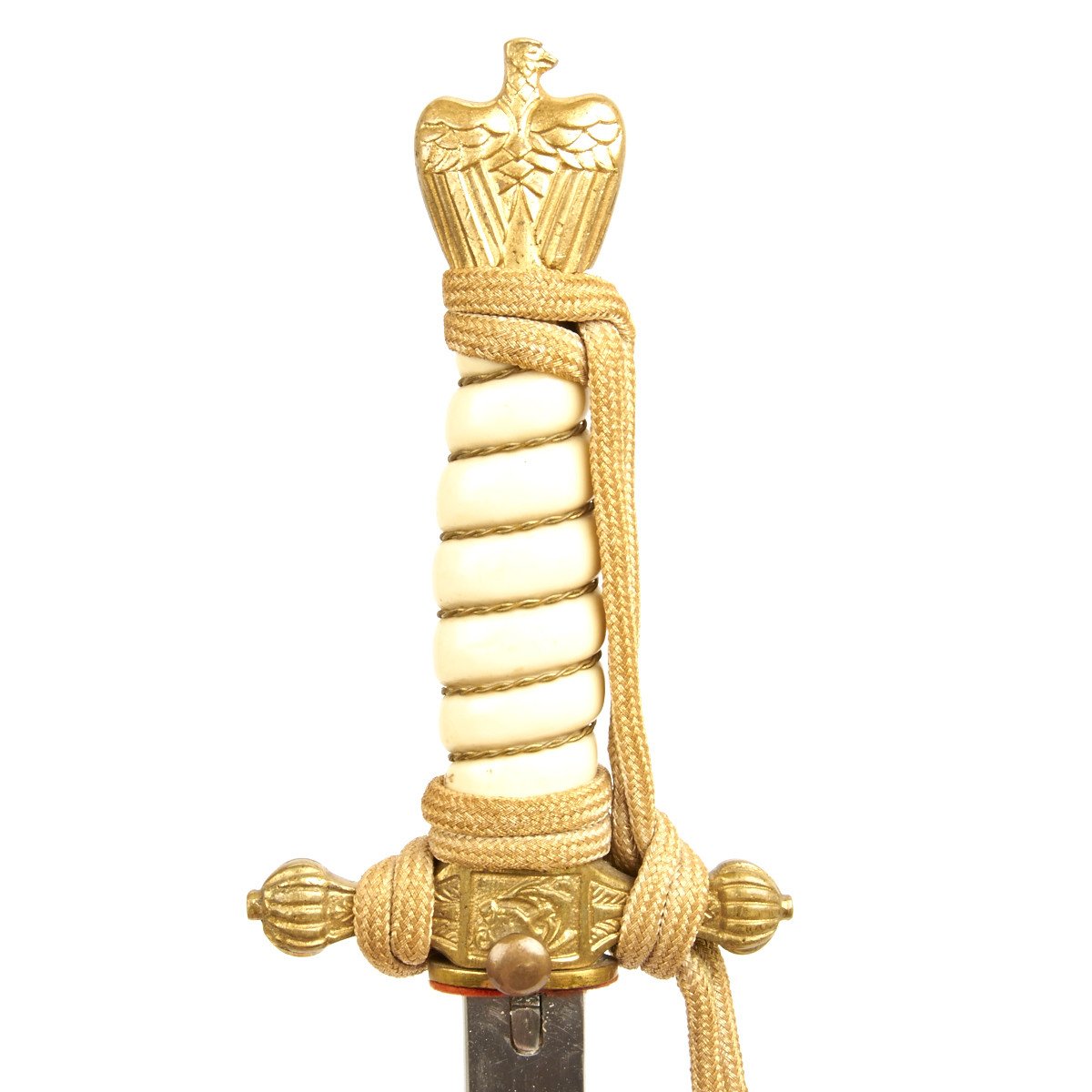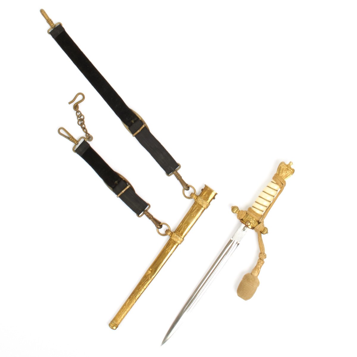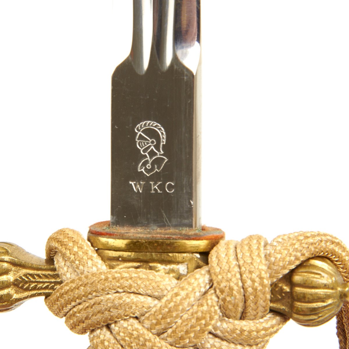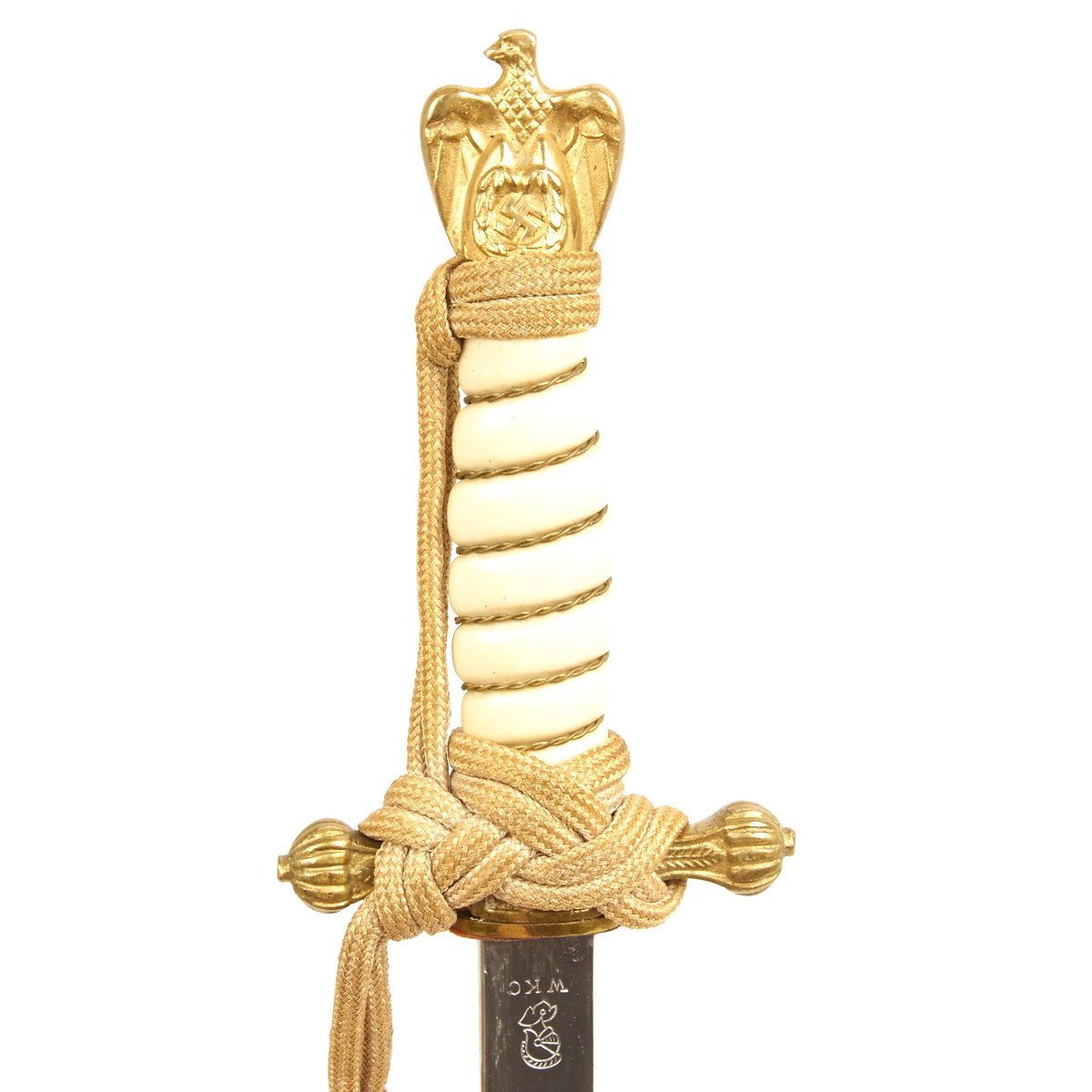 Original Item: Only One Available. This fine example Original WWII German 2nd Model Naval Dagger by WKC has some very interesting aspects and is of highest quality production. The hilt parts are of all brass construction having an excellent gilded finish. In fact, the finish is still 80-85% throughout.