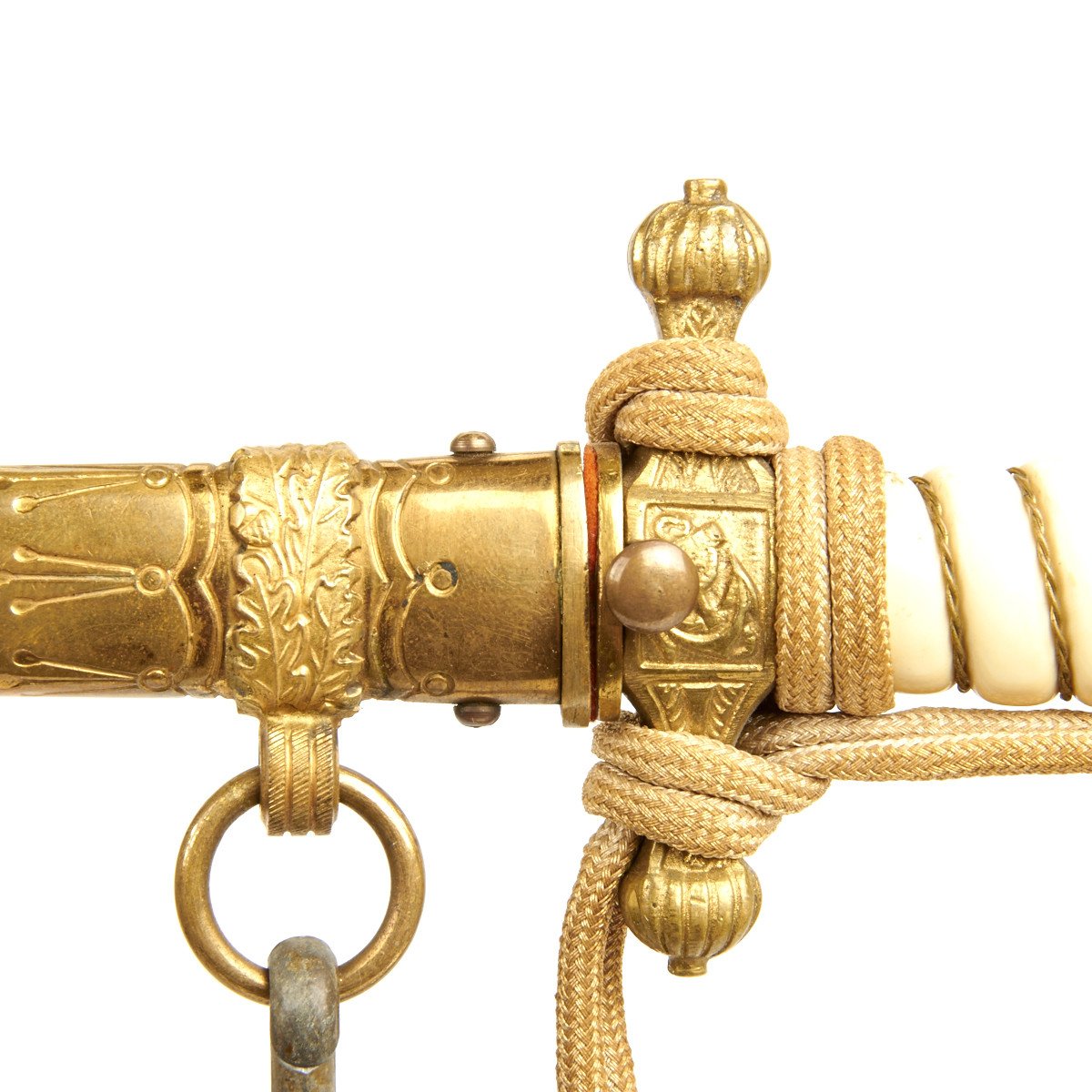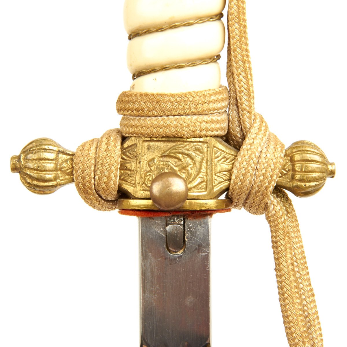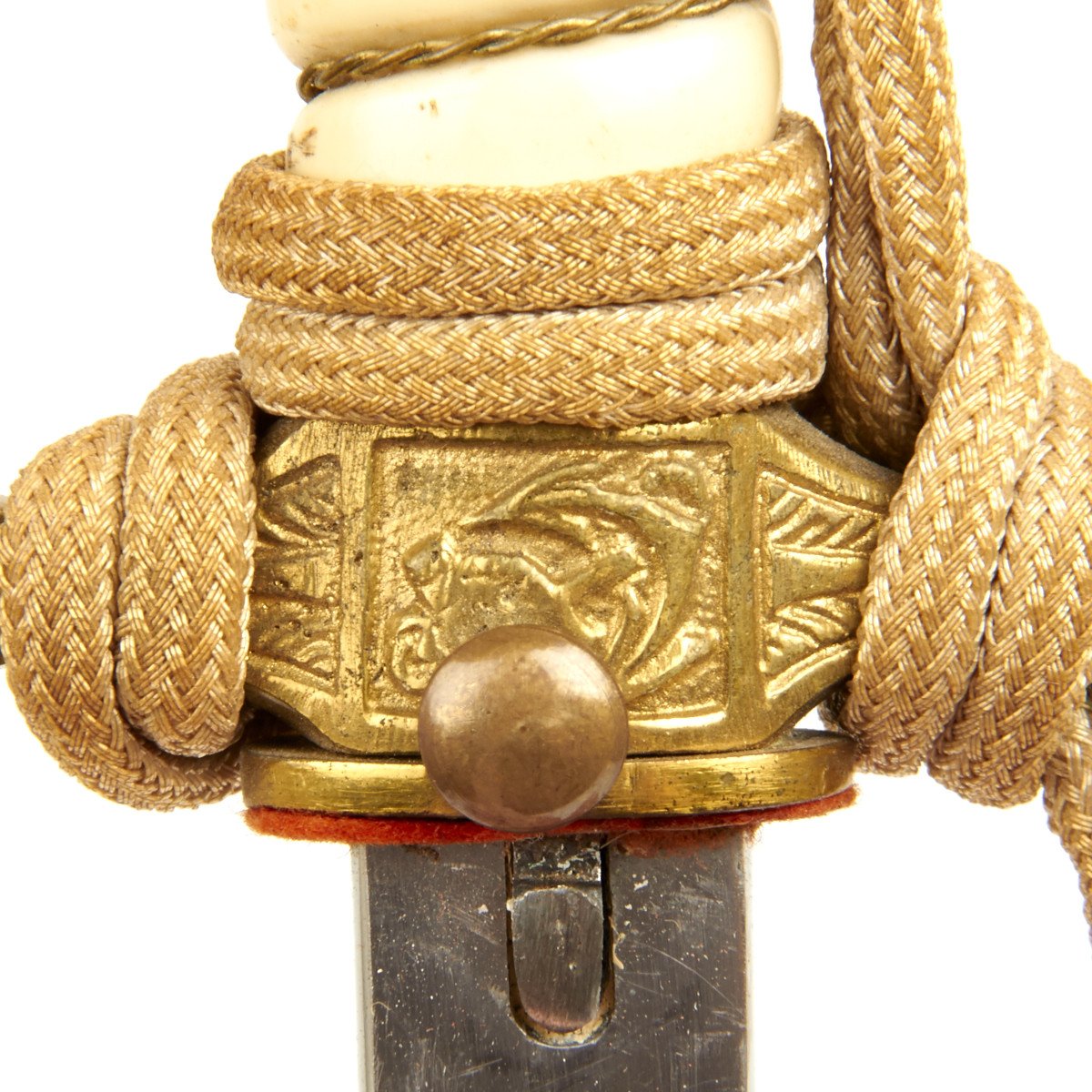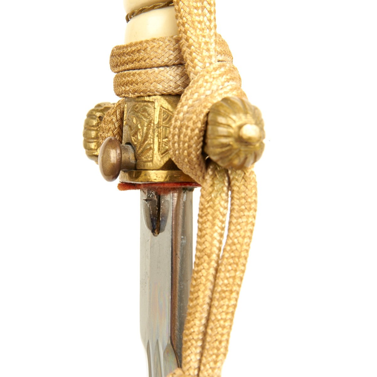 The grip of this example is an appealing off-white color. It is in perfect condition throughout being a celluloid coating over a wood base. This grip is tightly wrapped with twisted brass wire. The aluminum portepee is nicely set in place and appears to have been on the dagger a long time. This portepee is in excellent condition showing only age but no fraying.