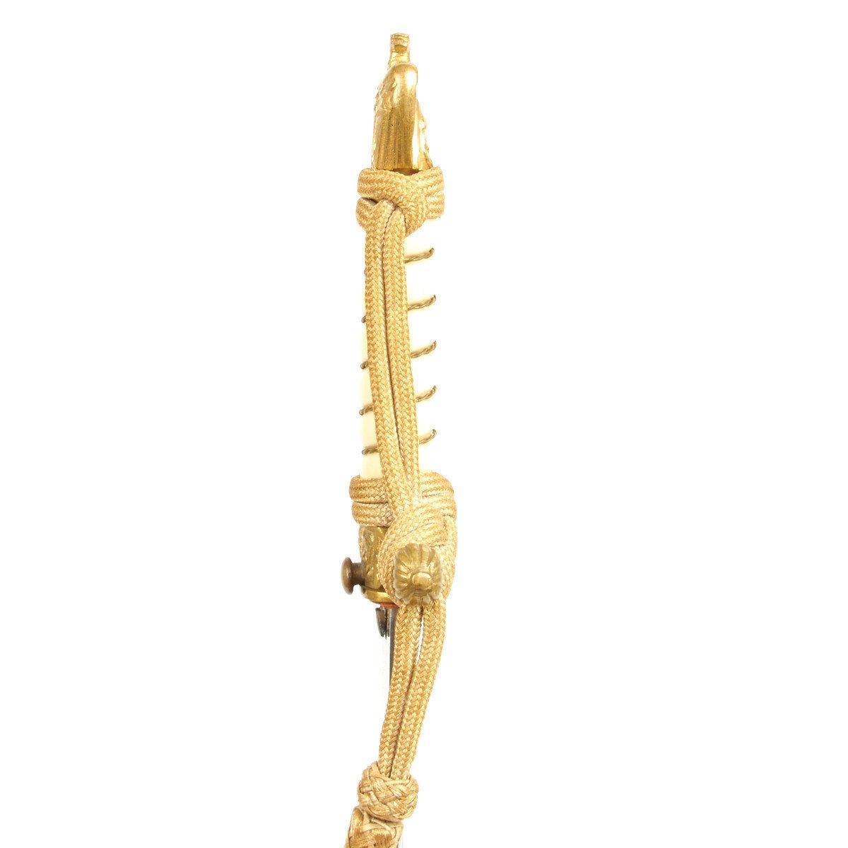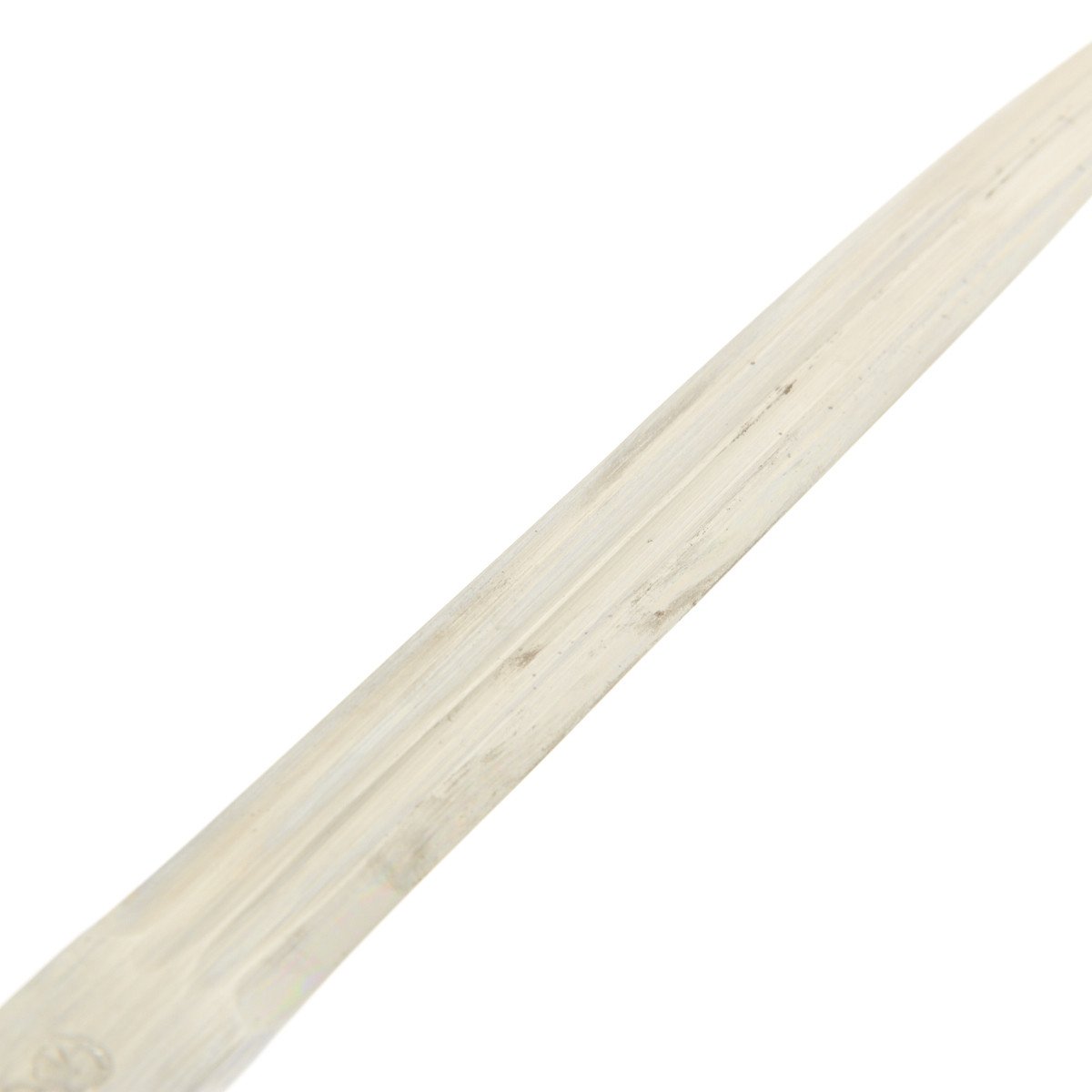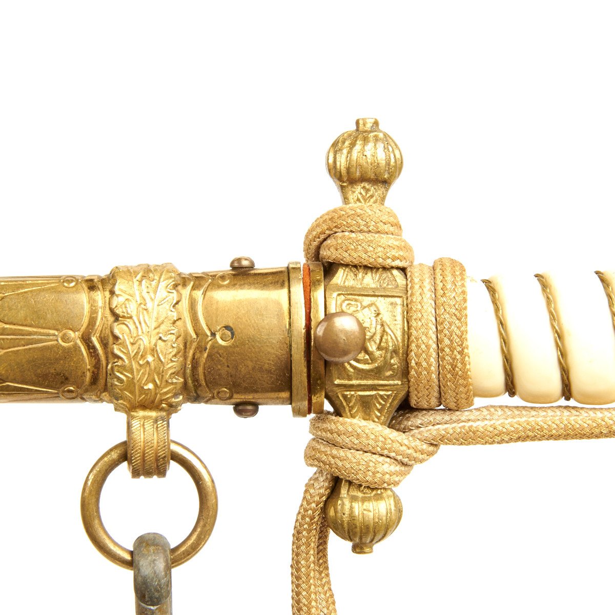 The grip of this example is an appealing off-white color. It is in perfect condition throughout being a celluloid coating over a wood base. This grip is tightly wrapped with twisted brass wire. The aluminum portepee is nicely set in place and appears to have been on the dagger a long time. This portepee is in excellent condition showing only age but no fraying.