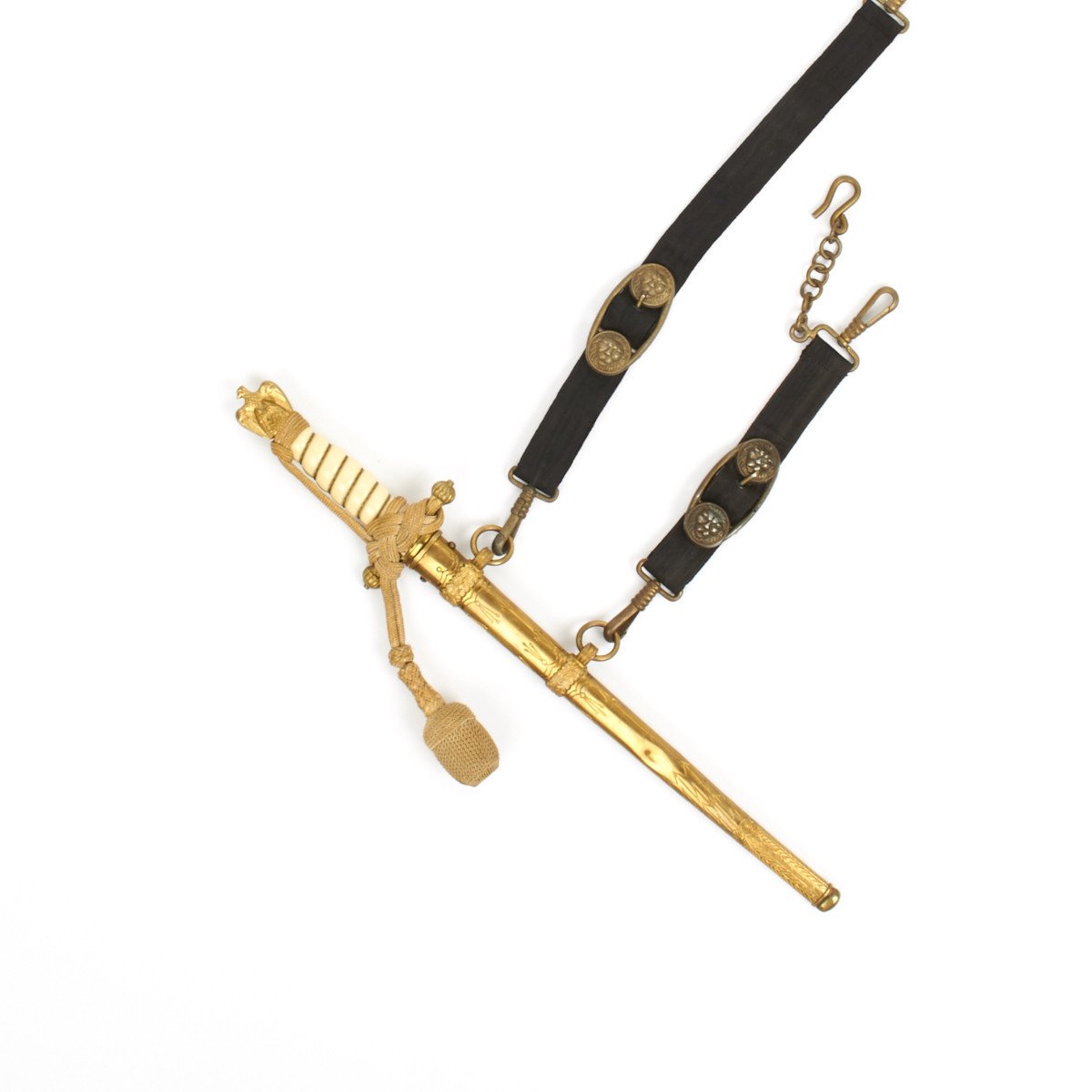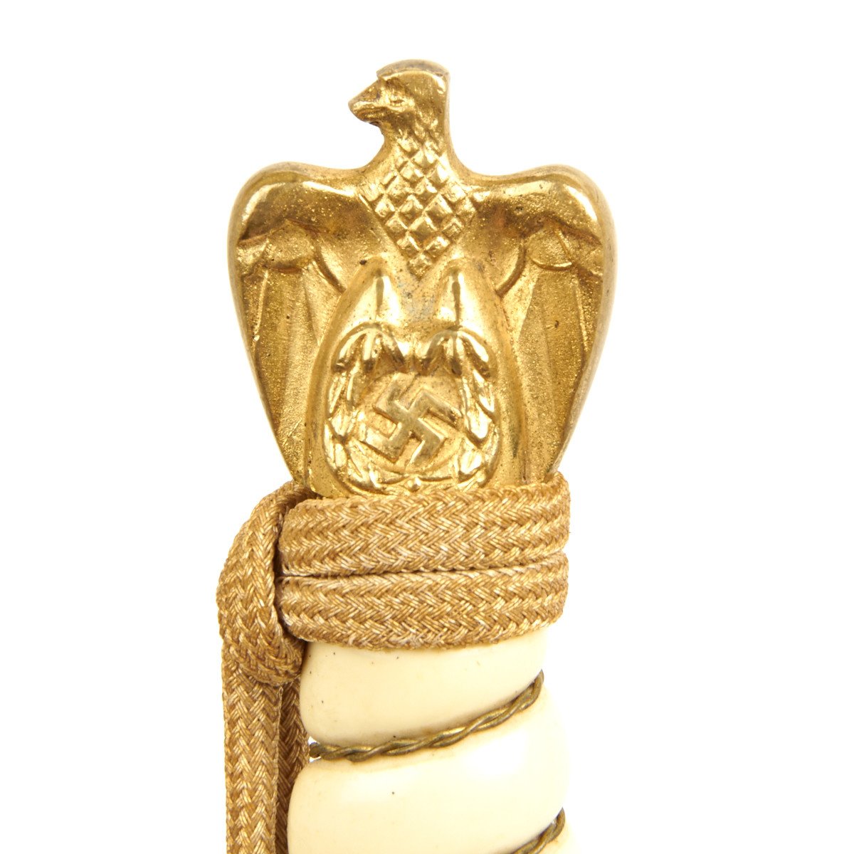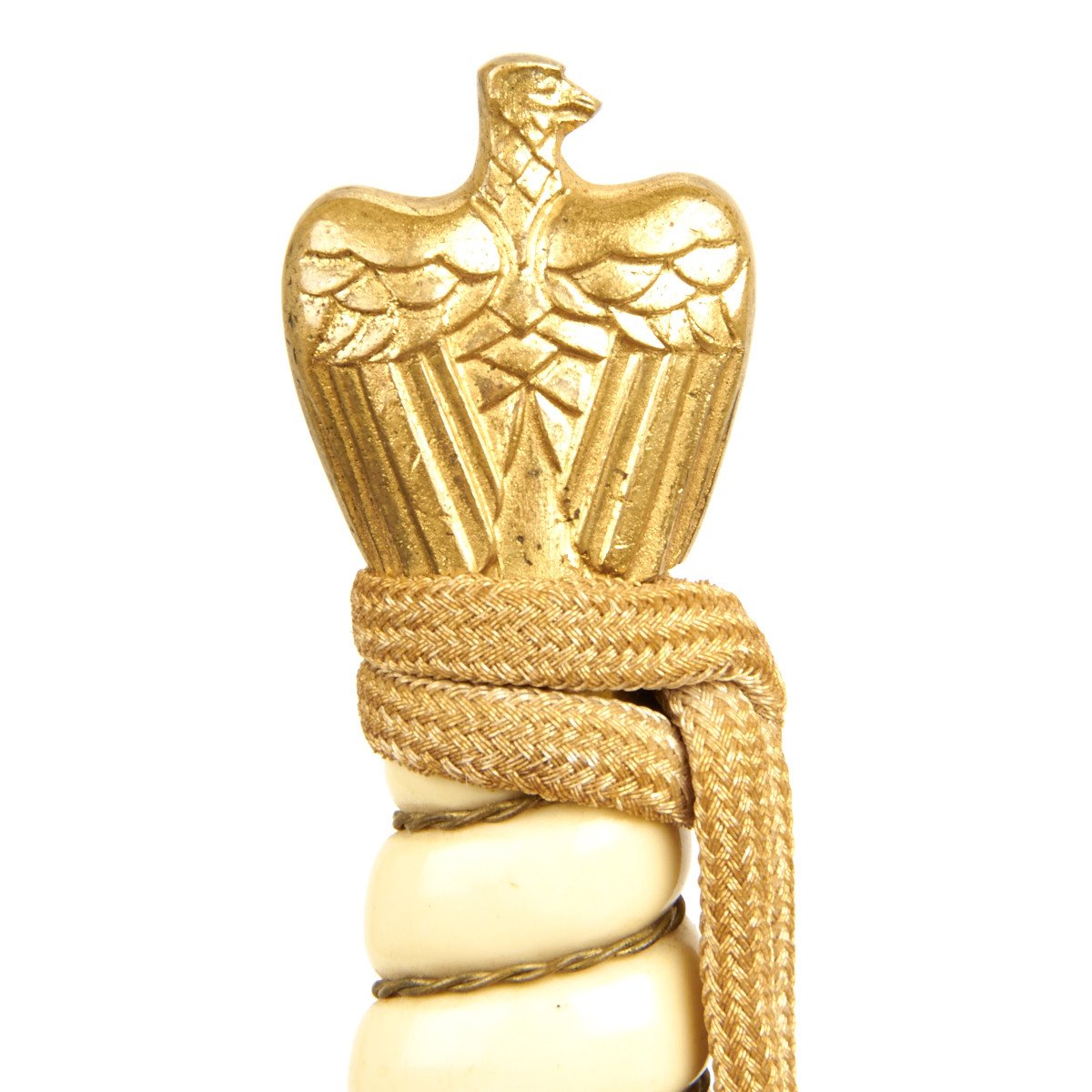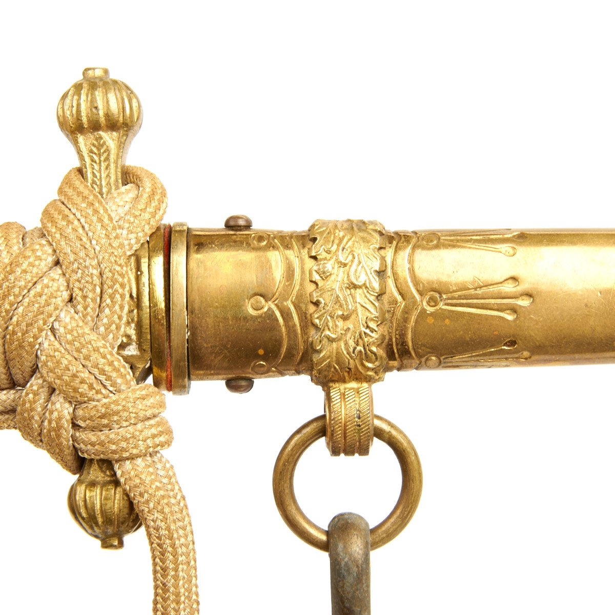 The grip of this example is an appealing off-white color. It is in perfect condition throughout being a celluloid coating over a wood base. This grip is tightly wrapped with twisted brass wire. The aluminum portepee is nicely set in place and appears to have been on the dagger a long time. This portepee is in excellent condition showing only age but no fraying.