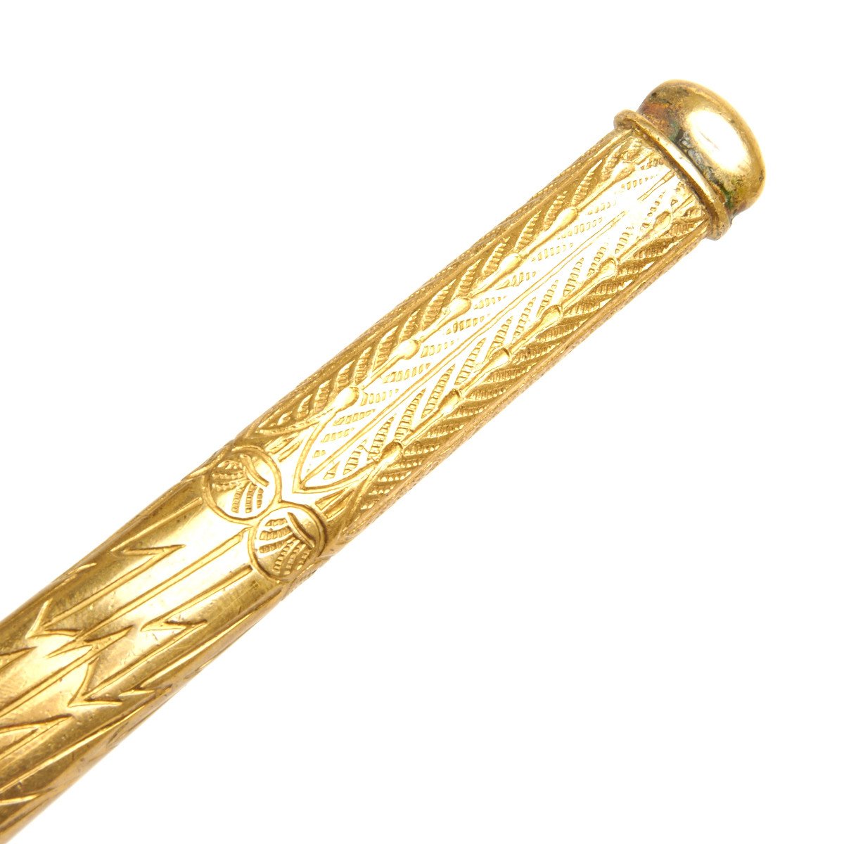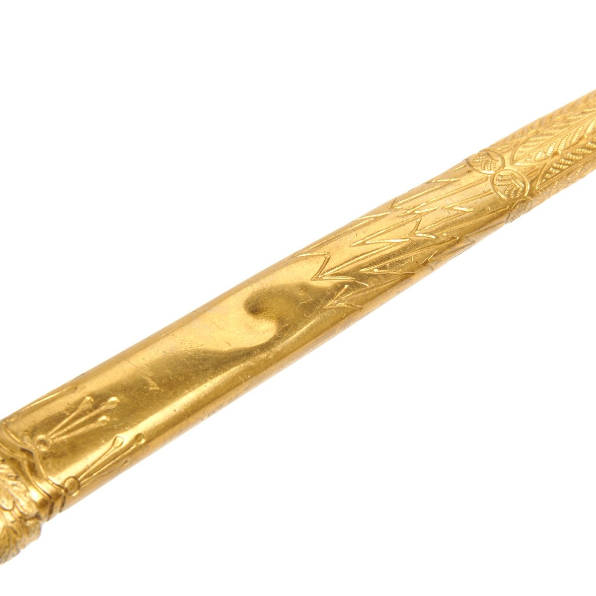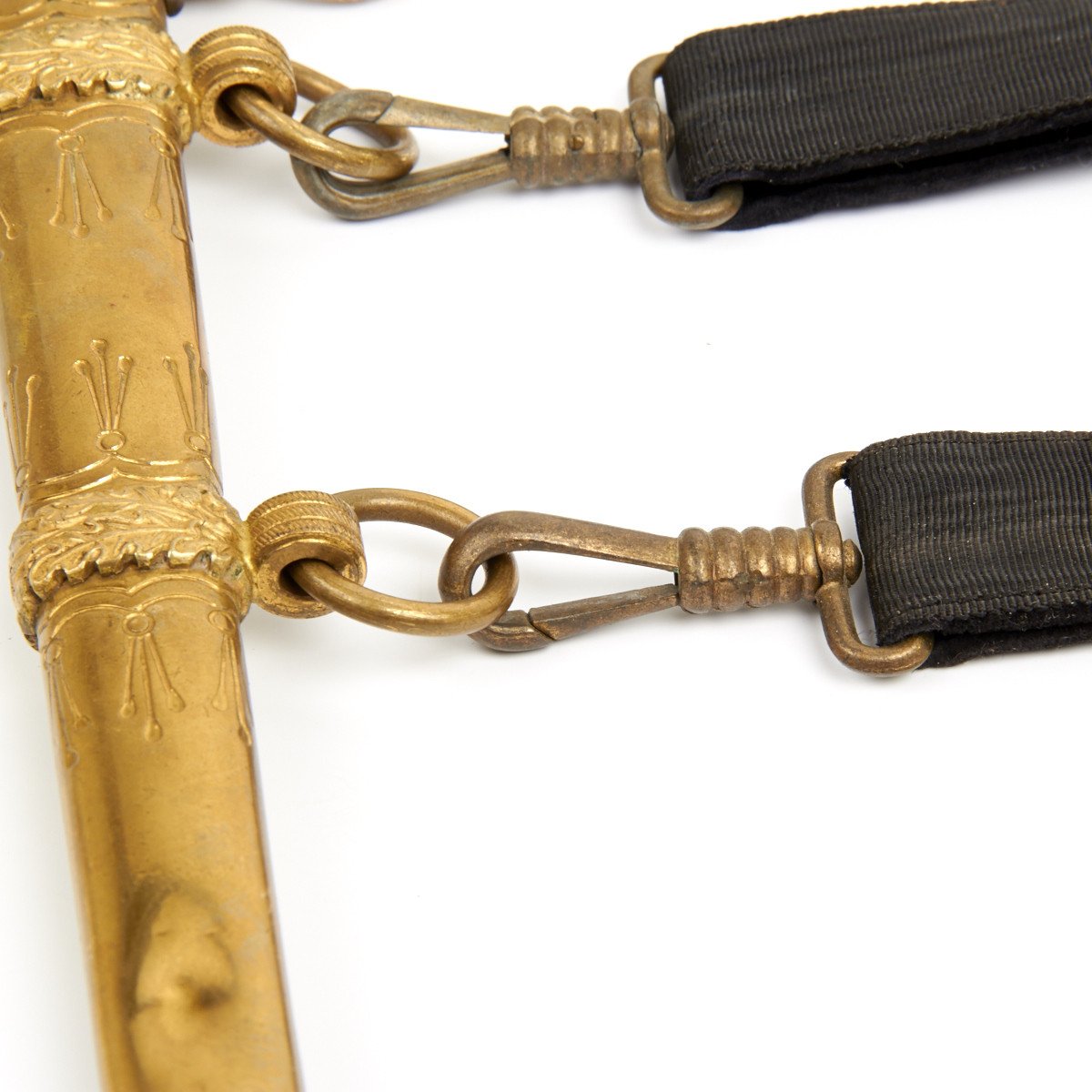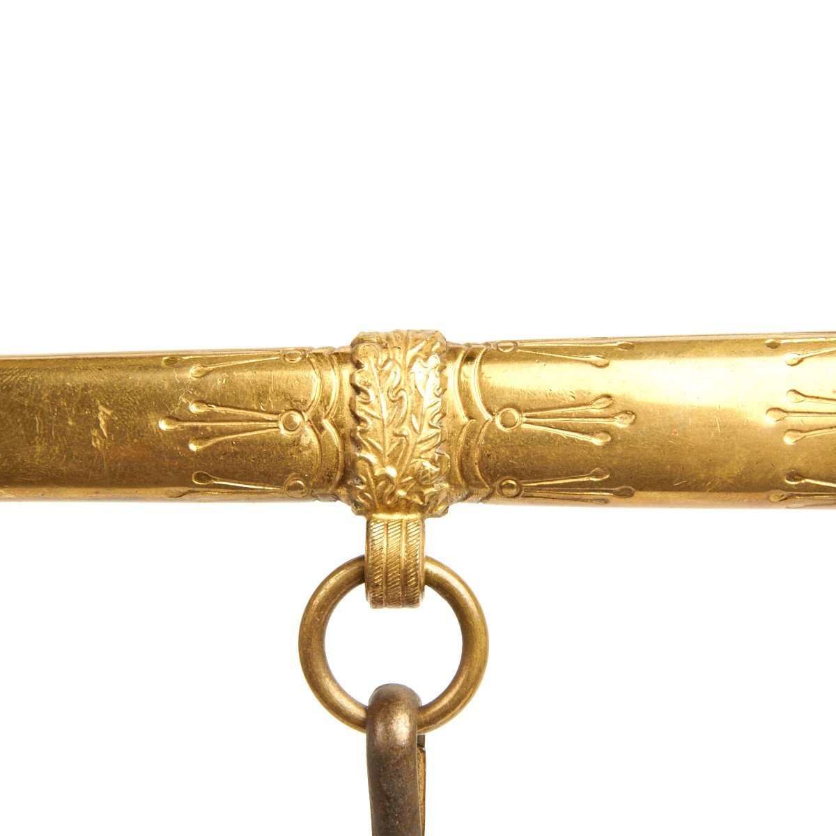 The scabbard is also a fine desirable example. This scabbard is of solid brass construction having fine hammered surfaces. The bands have fine overlapping oak leaves and acorns. It is also interesting to note that the eyelets have had hand engraving to replicate oak leaves in their surfaces. This was a trait that is commonly seen on hammered scabbards by WKC. The scabbard is straight throughout with the exception of just the smallest ding half way down. The rings on this example are plain and the throat is retained by fine brass screws which are located fairly low down.