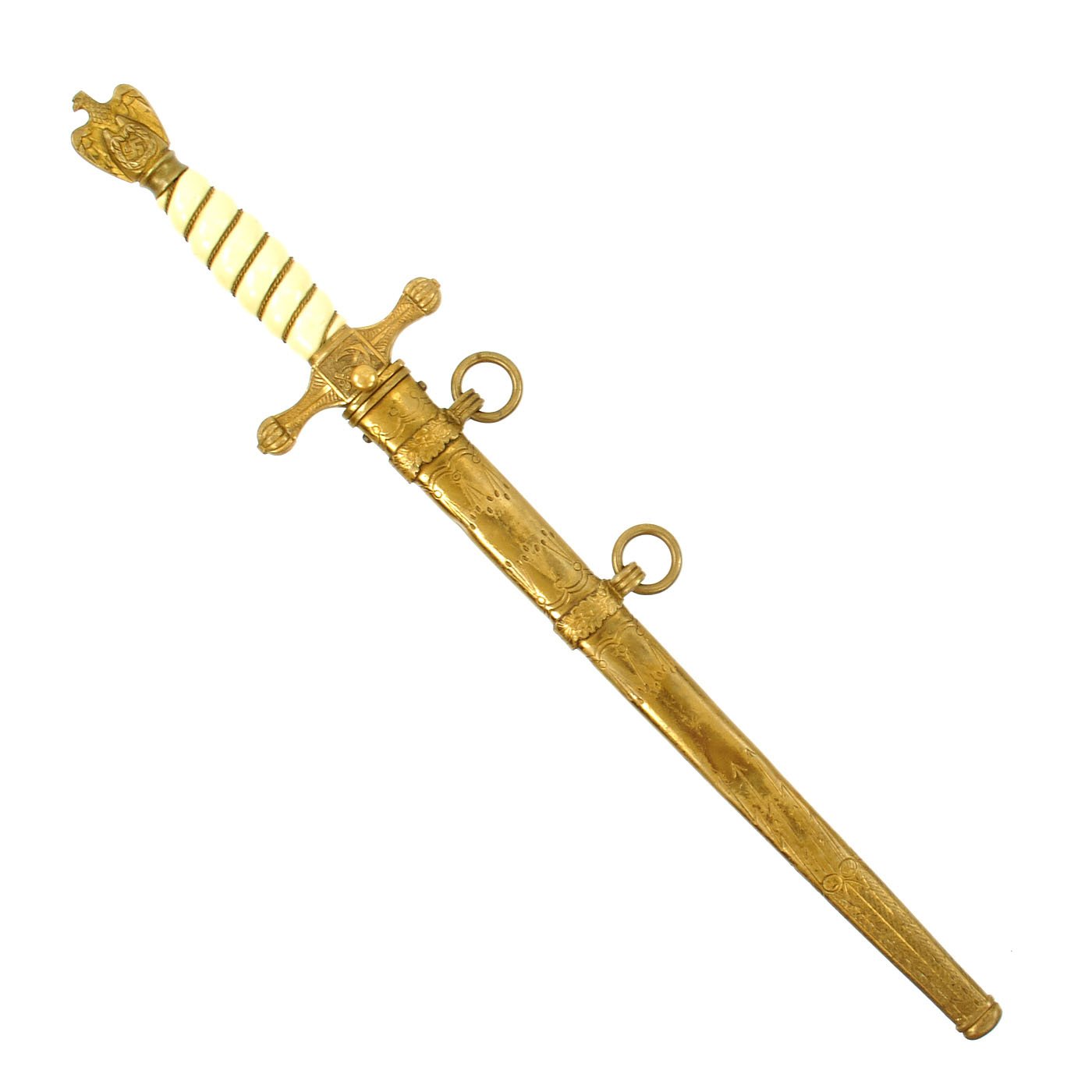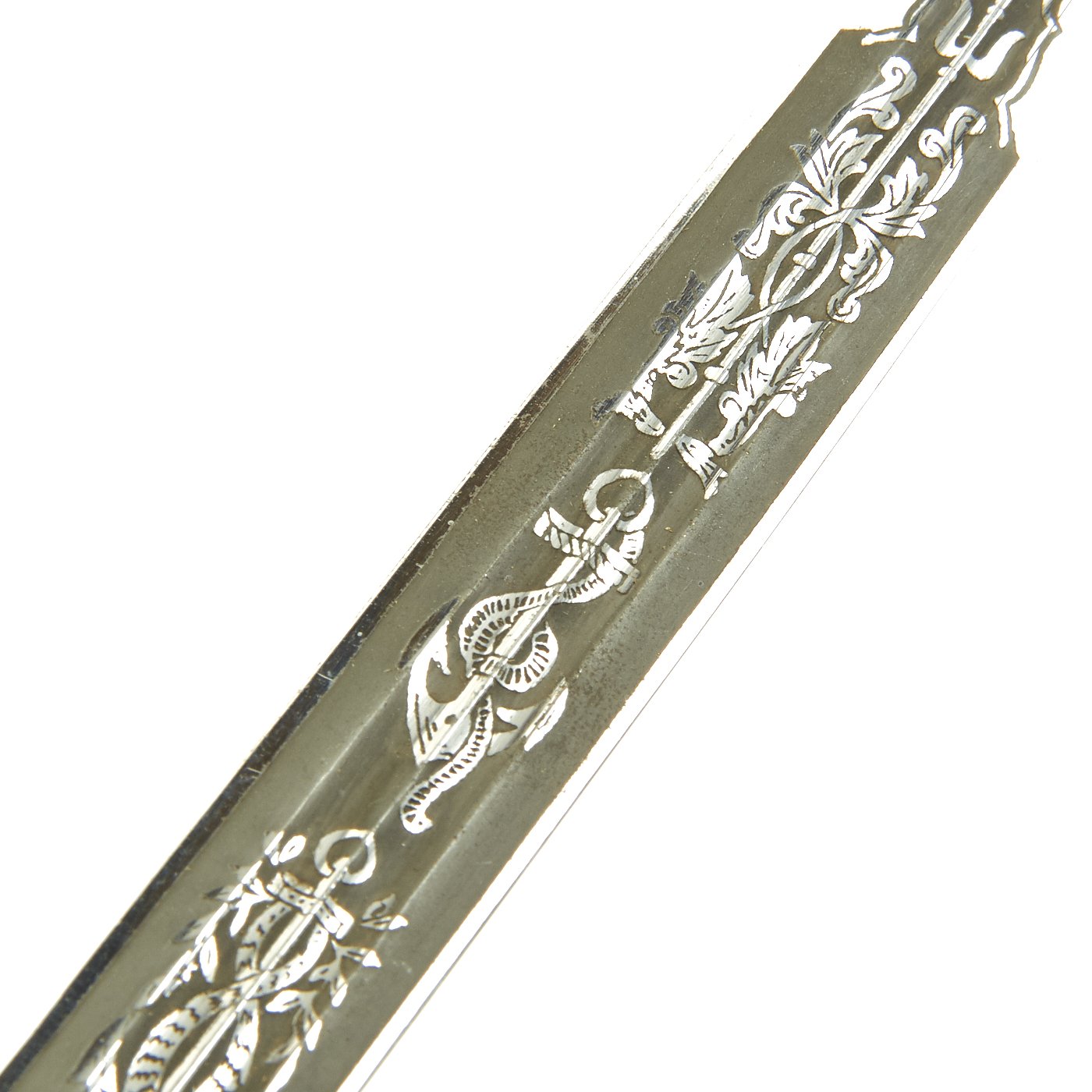 Original Item: Only One Available. We just purchased this fine dagger from a private collector. It is a fine Solingen-Produced totally original WWII German 2nd Model Naval Dagger by the legendary firm Carl Eickhorn, complete with the original gold-plated "lightning bolt" style brass scabbard. This is a very nice gently worn example, with a very nice nickel-plated and etched steel blade.
