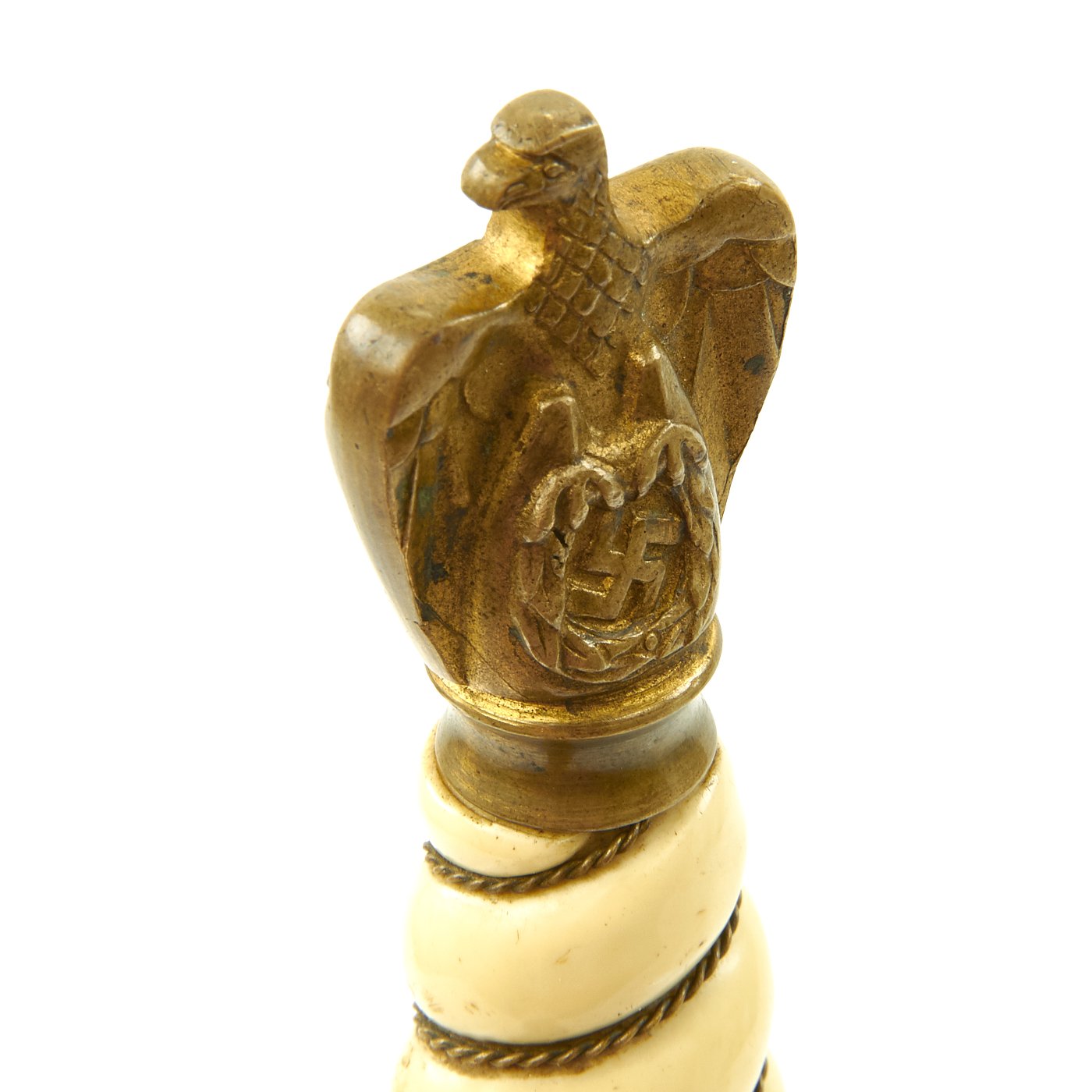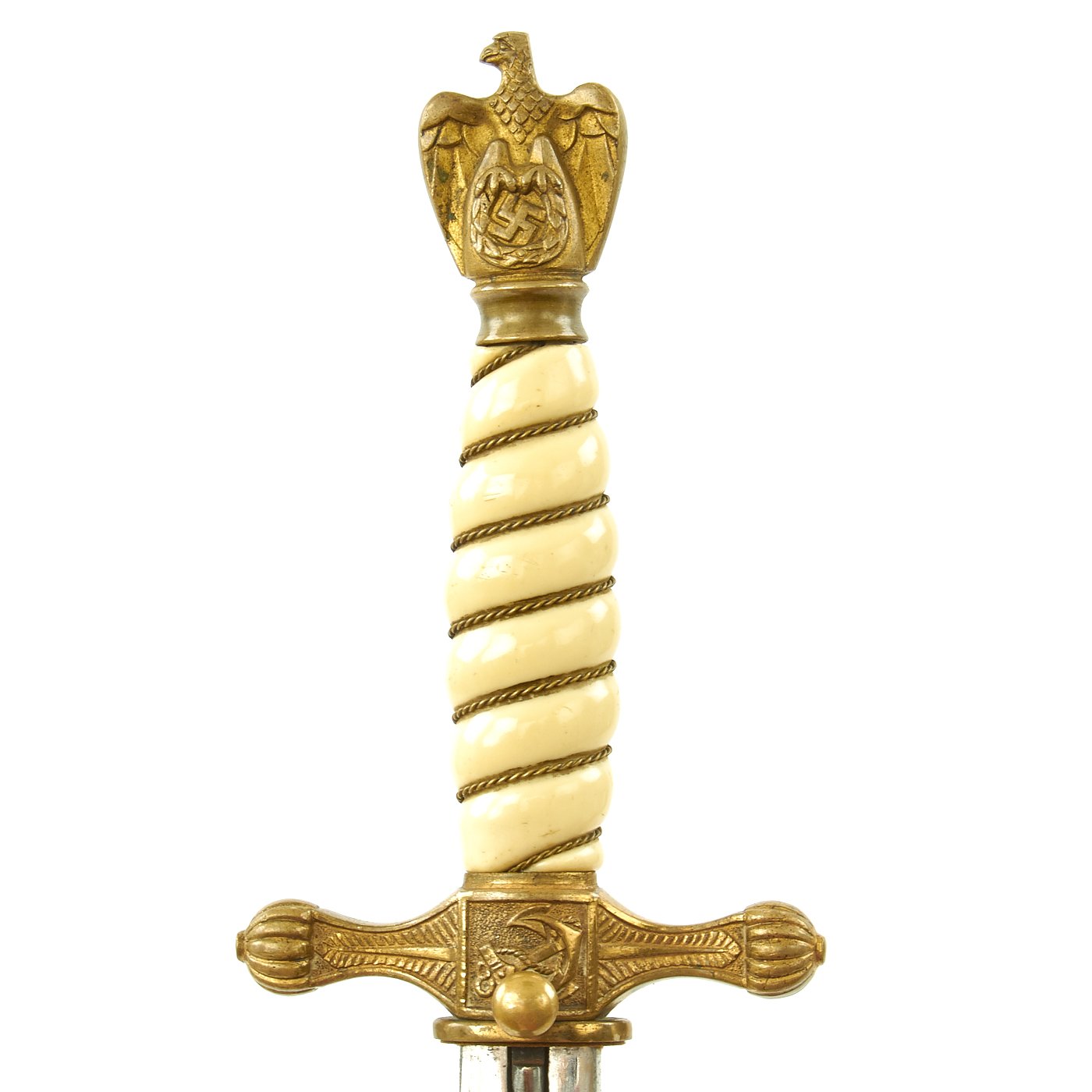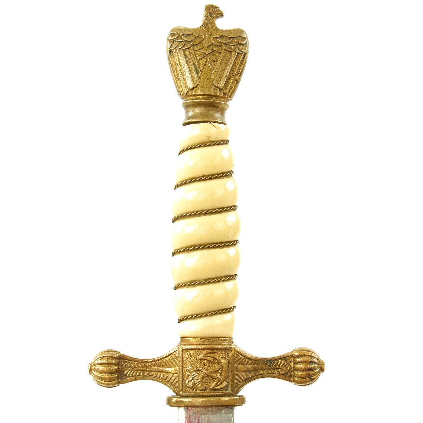 This example was almost certainly purchased by a high ranking officer early in the wartime period, as the pommel is a 1938 changeover type. It has very deeply inset wings and an impressive vaulted wreath. The details to this bird are also choice, with a striking eye, beak and breast. The crossguard is the standard type, and retains all of the details well. The grip is in very good condition with a bit of age, and a few small surface cracks and staining, but still has a great ivory color, which hasn't faded to orange like so many do. It still has the original twisted wire wrapping, which is fully intact. Scabbard locking button is fully functional, and also in great shape.