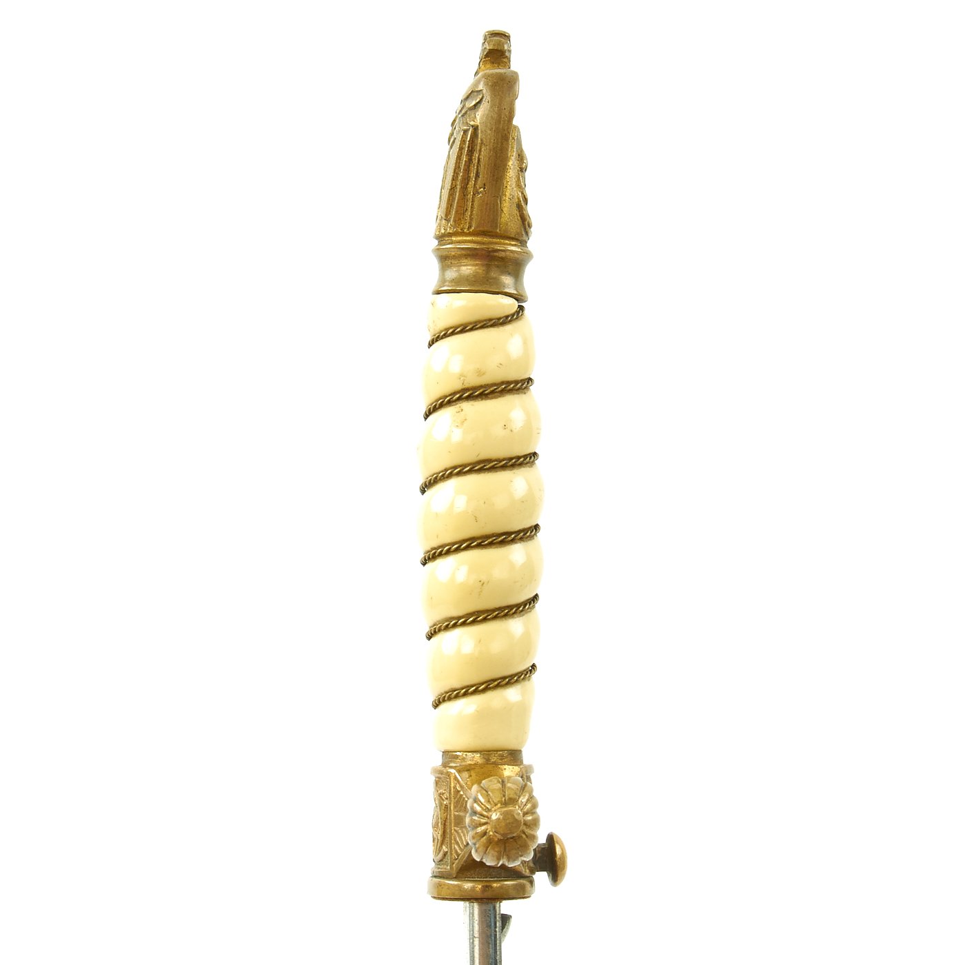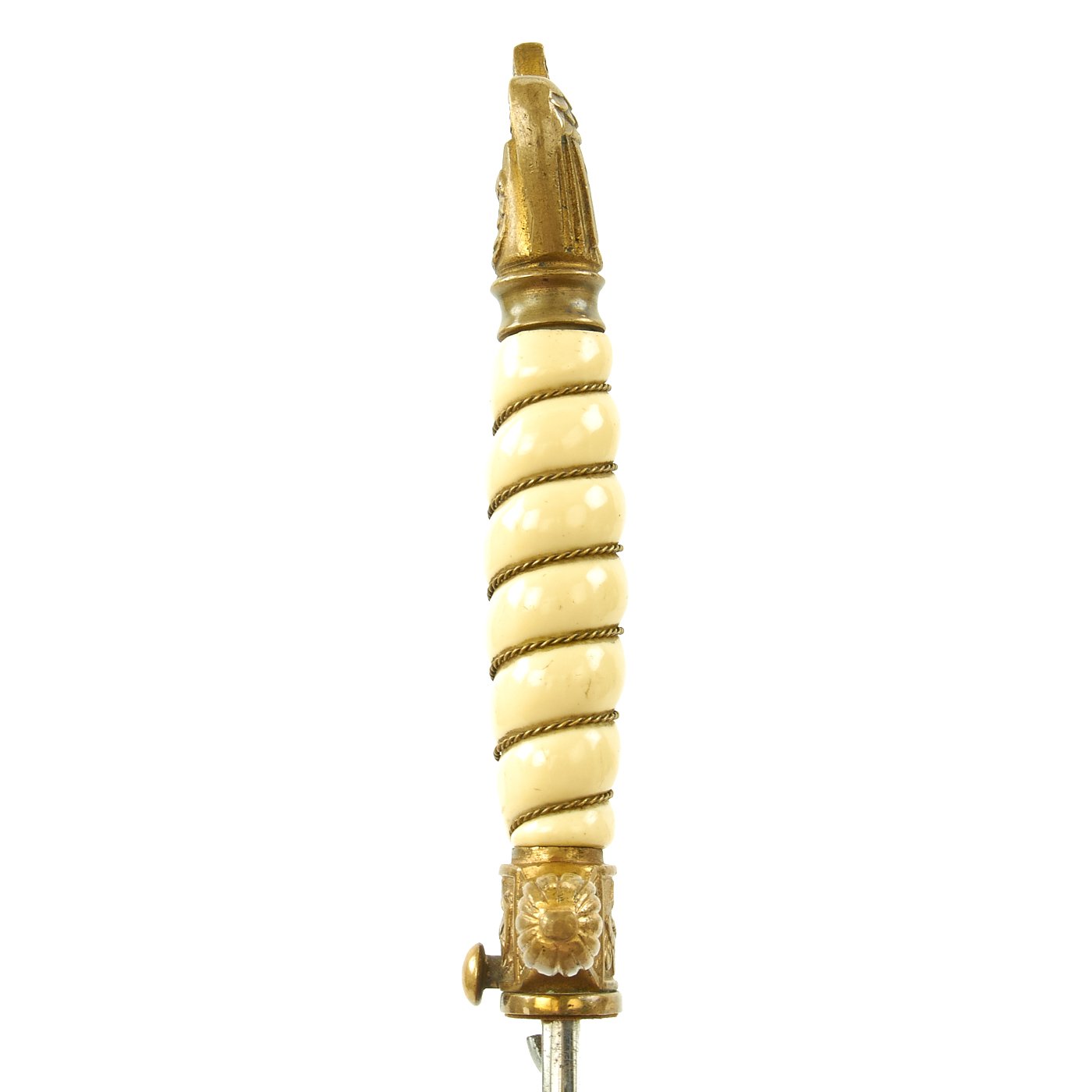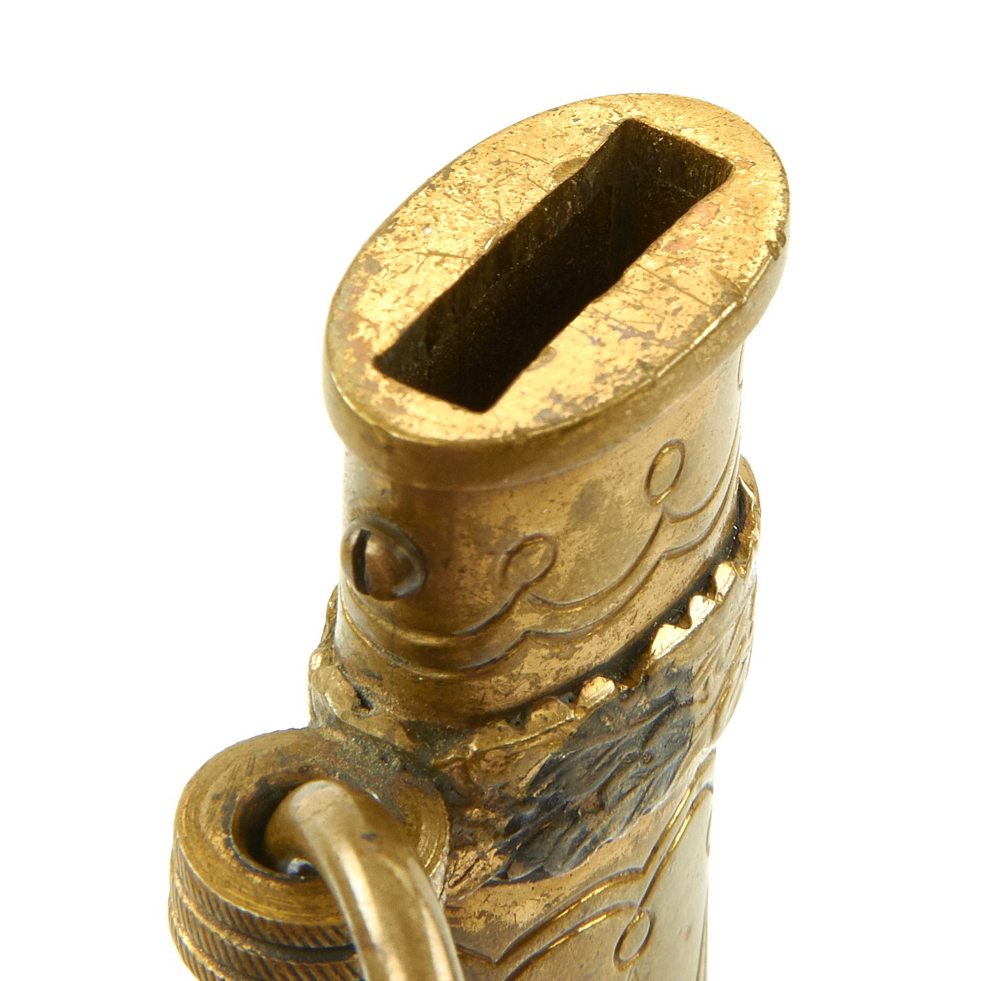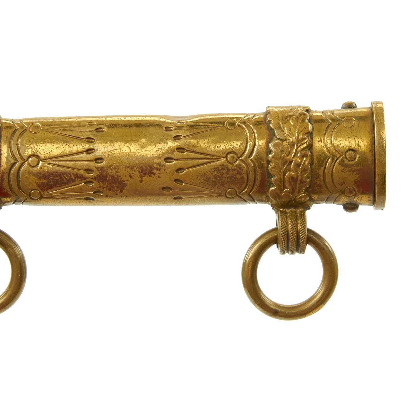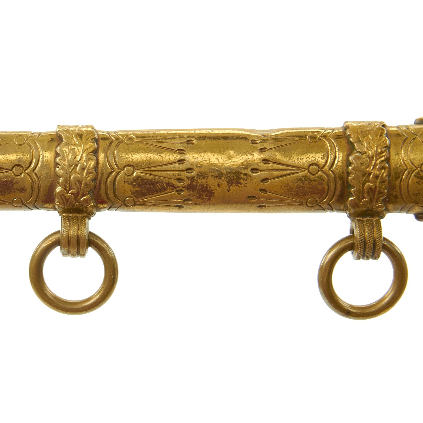 The "lightning bolt" scabbard is mostly straight, and does have some denting, as shown in the pictures. These do not interfere with the blade entering the scabbard. It's stamped with well-defined palmettes around the bands and lightning bolts, ermine feet and acanthus leaves down to the bottom chappe. The bands feature overlapping oak leaves and acorns. The ring ferrules are the triple serrated type, and the rings are still present. The throat is retained by two dome headed screws on the narrow sides, which do not appear to have been removed. The finish overall is mostly bright brass, as the gold plating was the type that "evaporates" easily with cleaning and contact to air. There is still a bit left in some areas but it is mostly worn away.