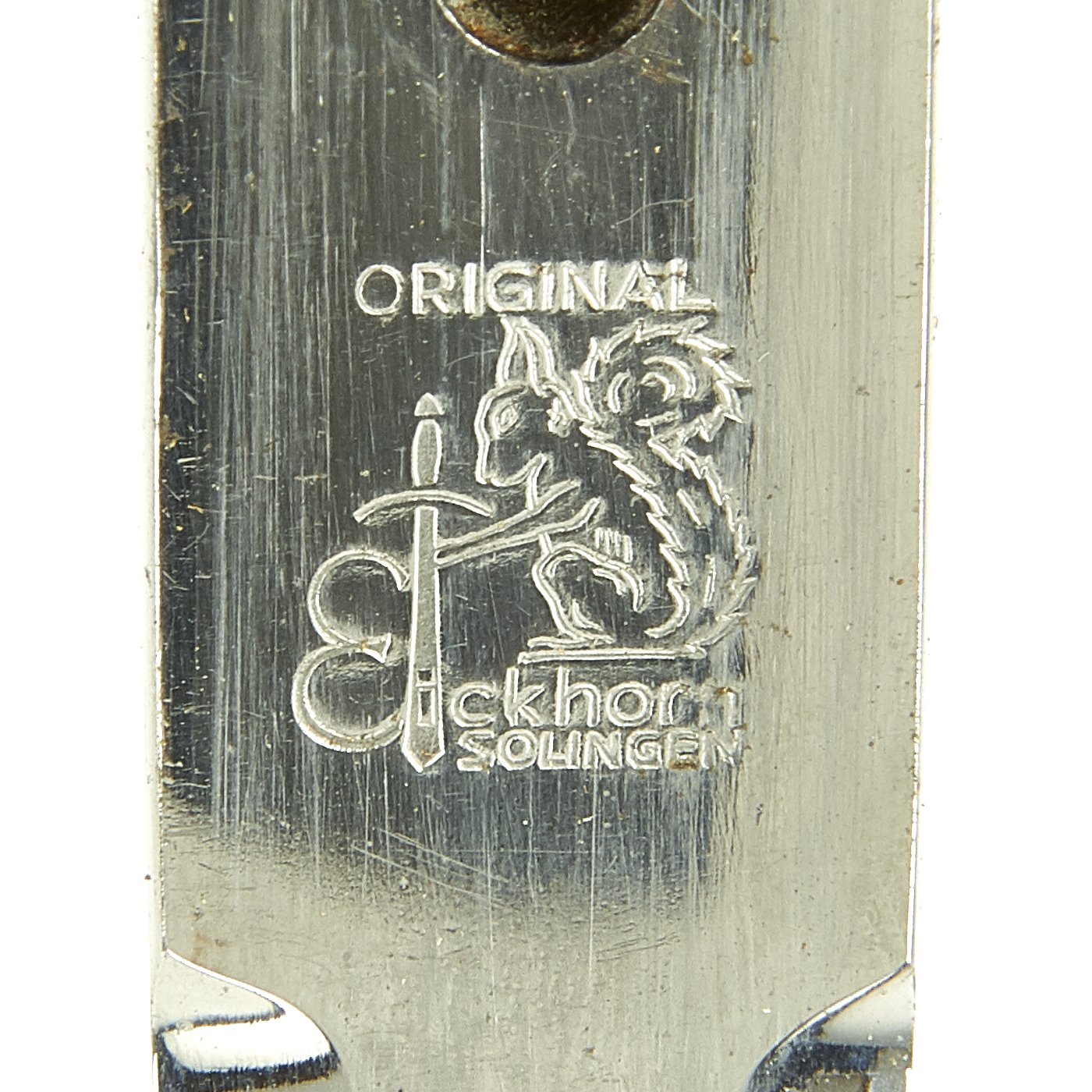 According to J. Anthony Carter's book, GERMAN KNIFE AND SWORD MAKERS, this company was founded in 1865 by Carl Eickhorn, and is arguably the most famous of all Solingen makers. Not only could the family trace their history back 500 years, but they could also demonstrate involvement in the hardening and grinding industries for the same period. Truly the nobility of Solingen Edged weapon dynasties. Eickhorn edged weapons are the most desirable of all makers.