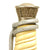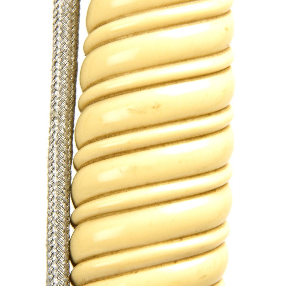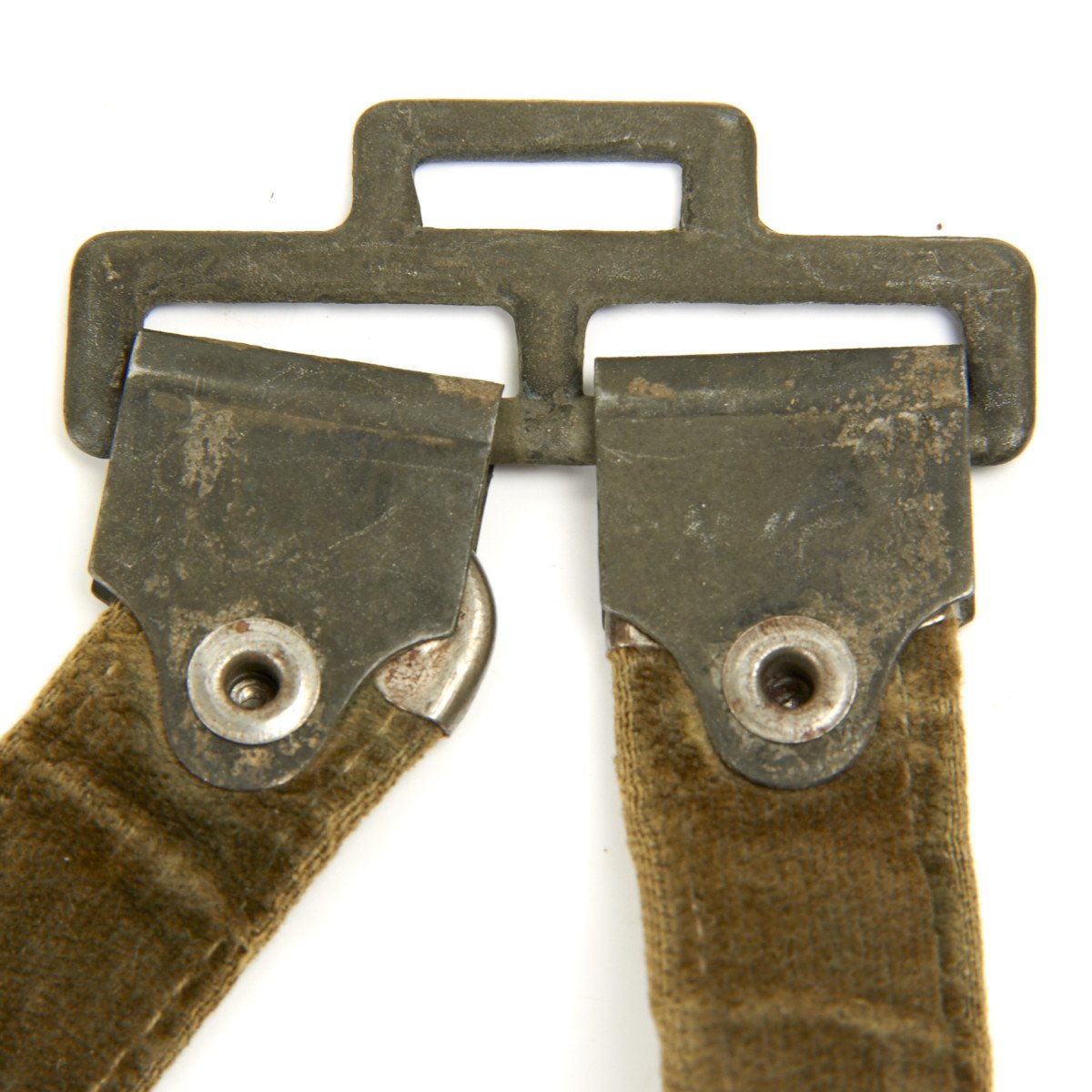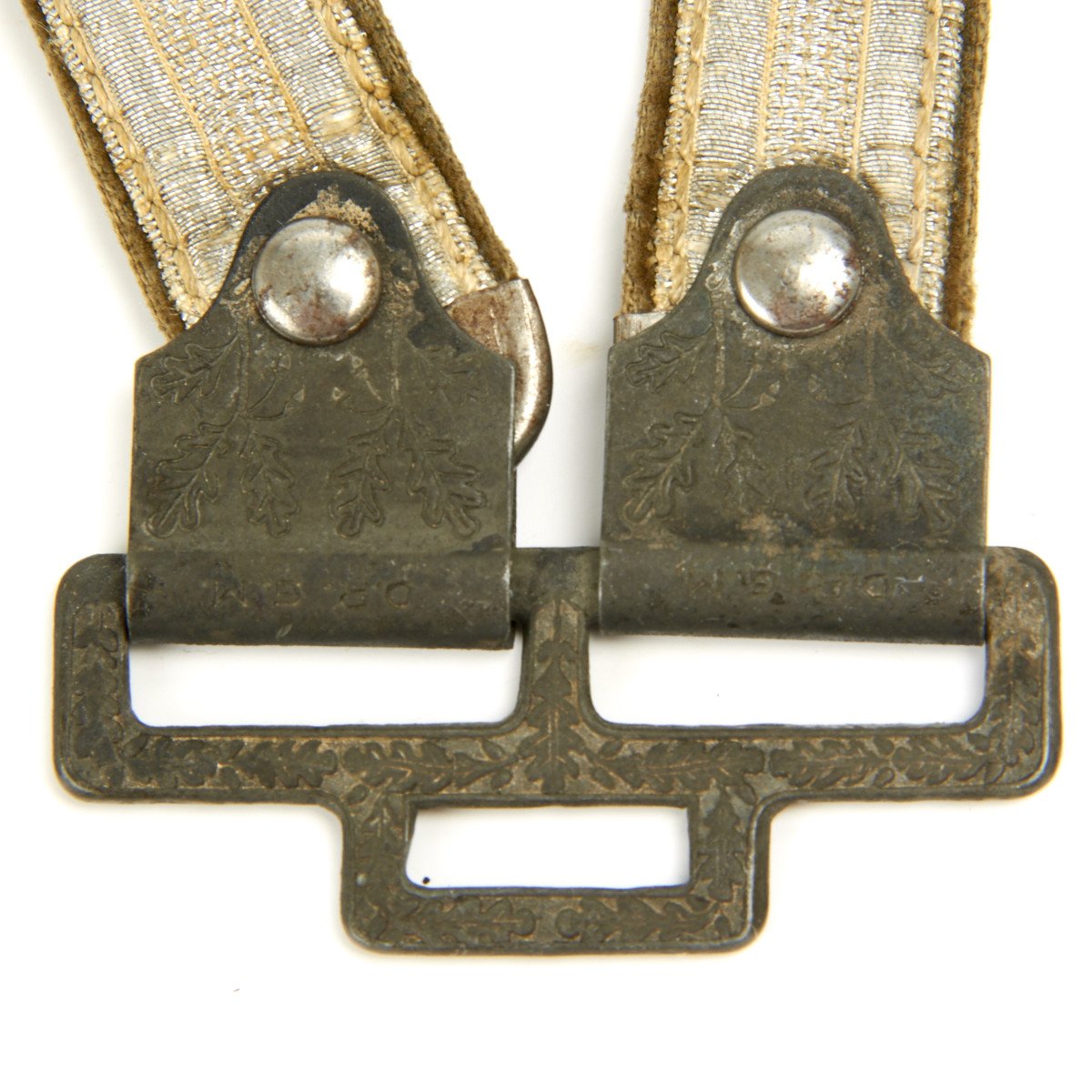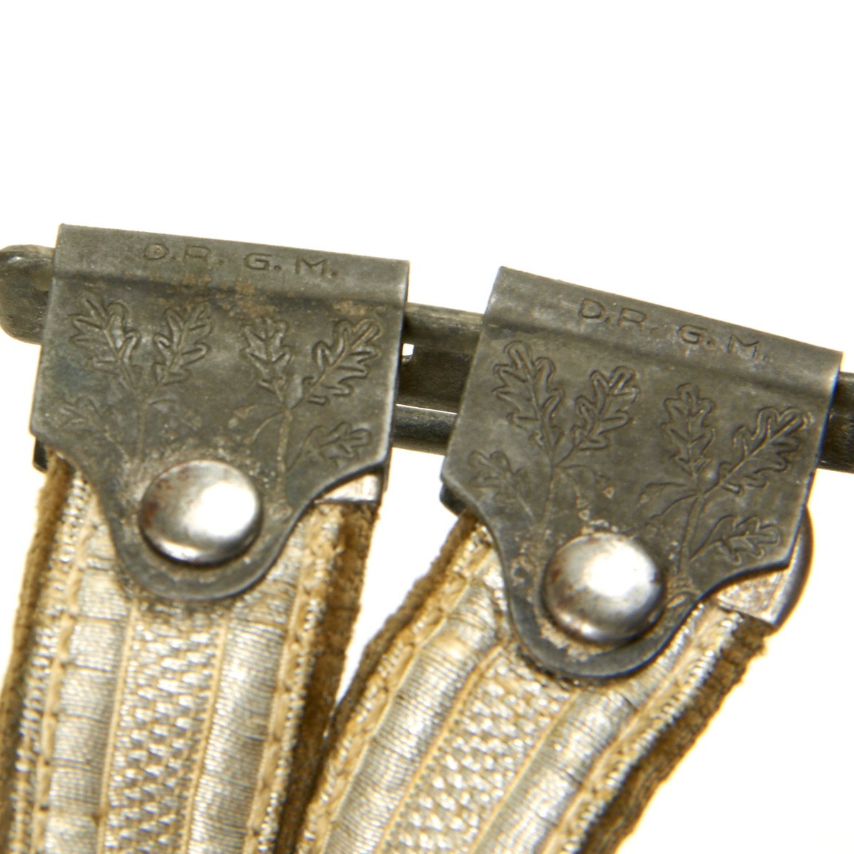 Attached to the two carrying rings is a deluxe set of hanging straps. These brocade straps feature textured aluminum in good condition, sowing some age. The reverse of the straps has the high pile dark green velvet that shows little wear. The hardware includes the oak leaf decorated box clip at the top which is stamped DRGM. The oval buckles and slides feature over oak leaves and they have most of the original silvering intact. The push-up style deluxe snaps also have most of their silvering, and are decorated with oak leaf sprigs on the obverse, as well as being DRGM marked on the reverse of each. A very fine set of straps here.