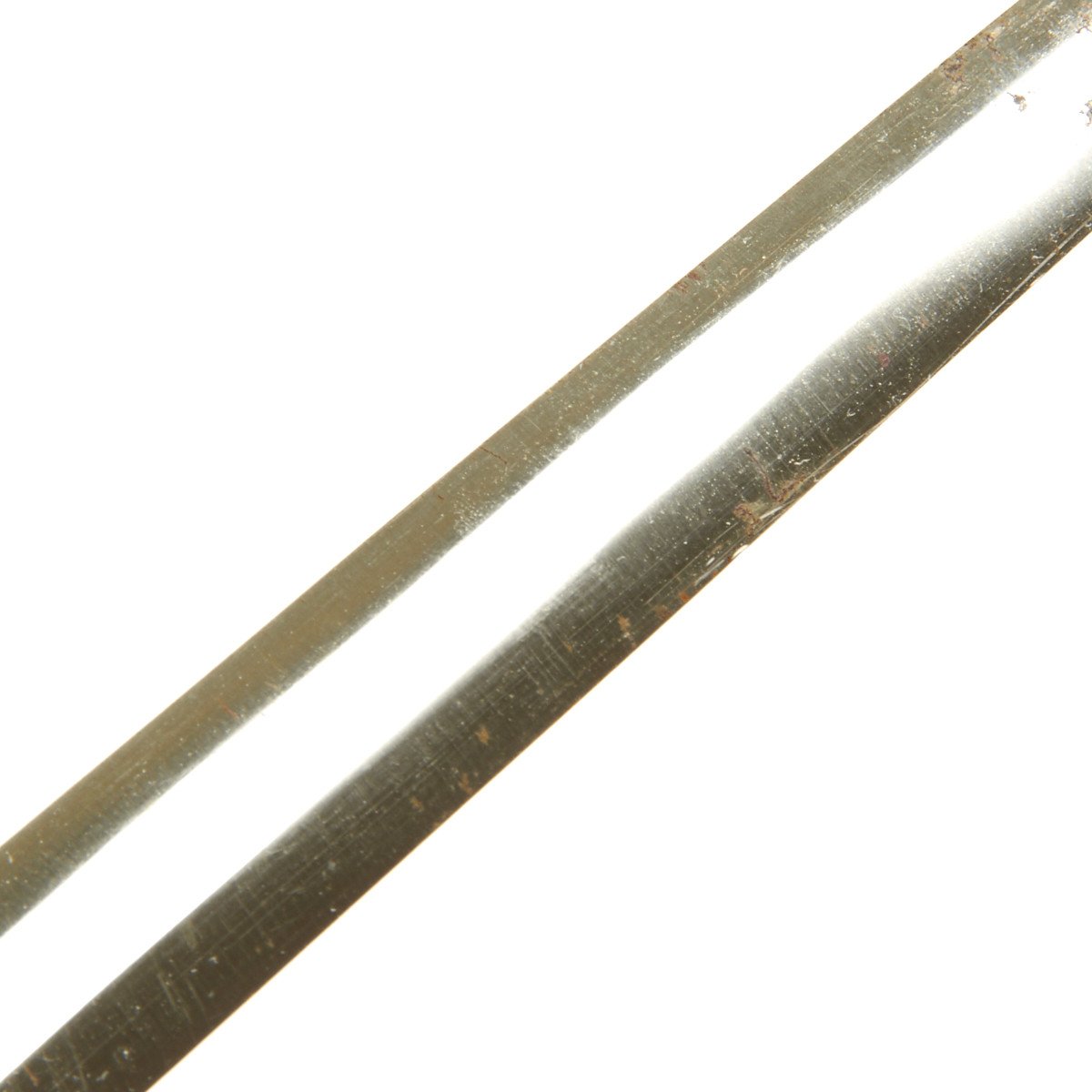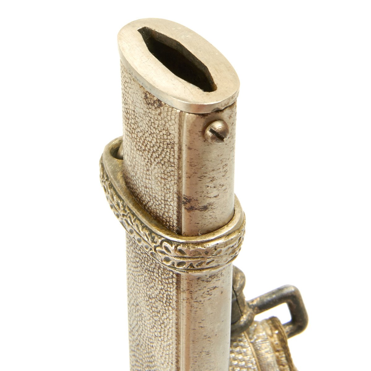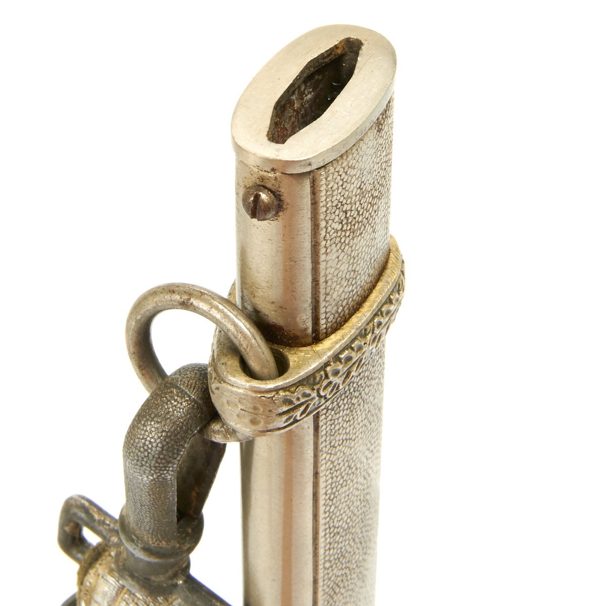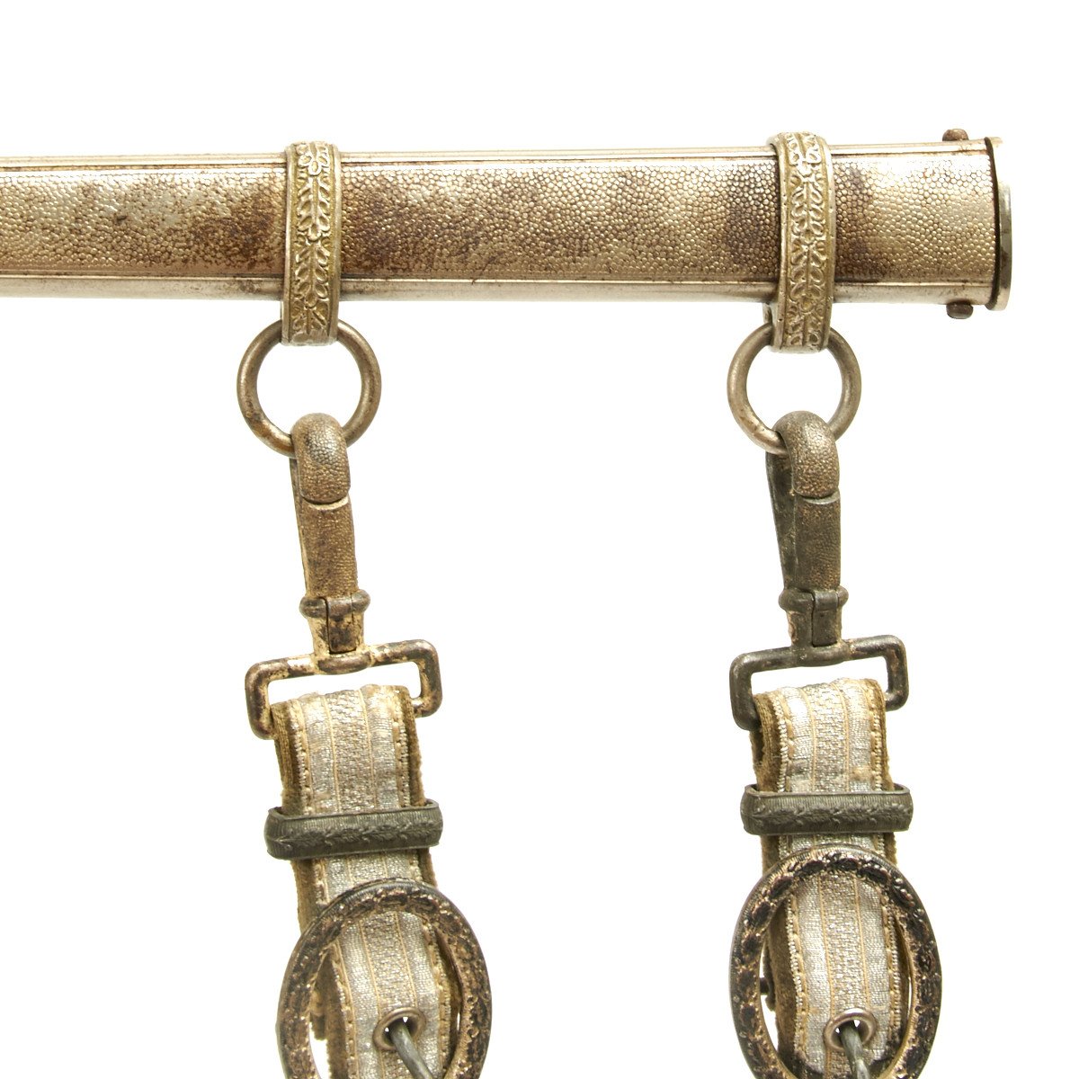 The scabbard is a nice example, with much of the silvering and some of the frosting along the edges. This straight scabbard has very crisp, finely grained panels that show some wear. The carrying bands have an excellent pattern of overlapping oak leaves and acorns, with hand enhancing evident on each of the leaves. The throat is the thinner style and is held in place by a two dome head screws.