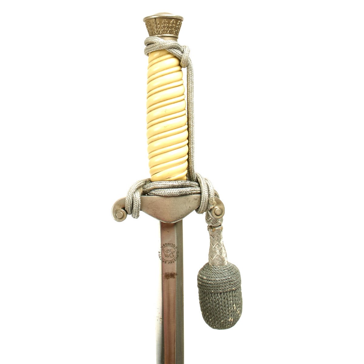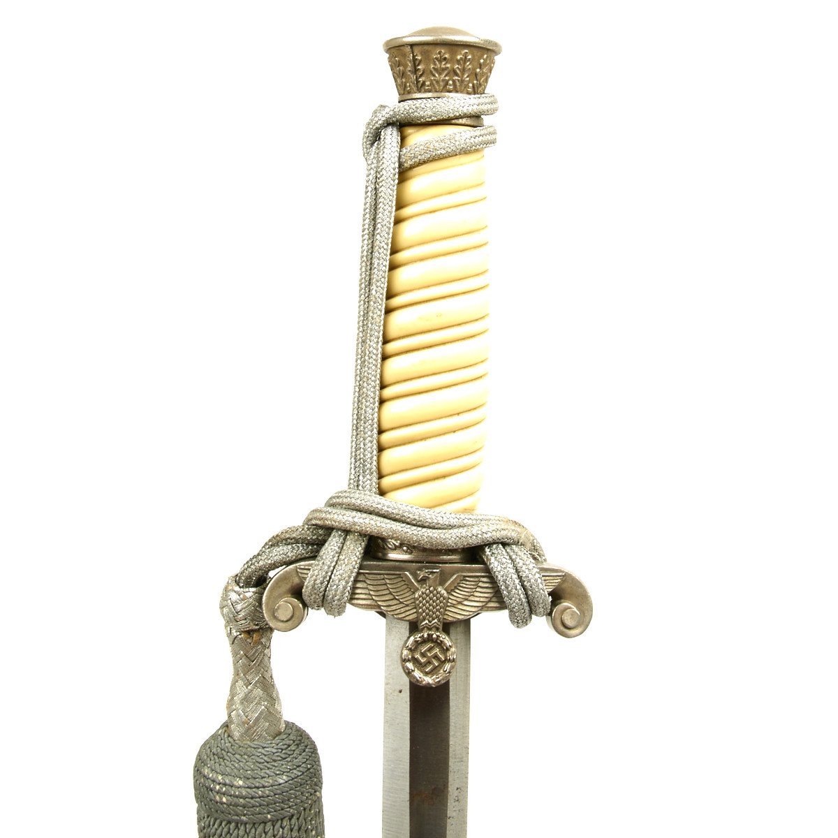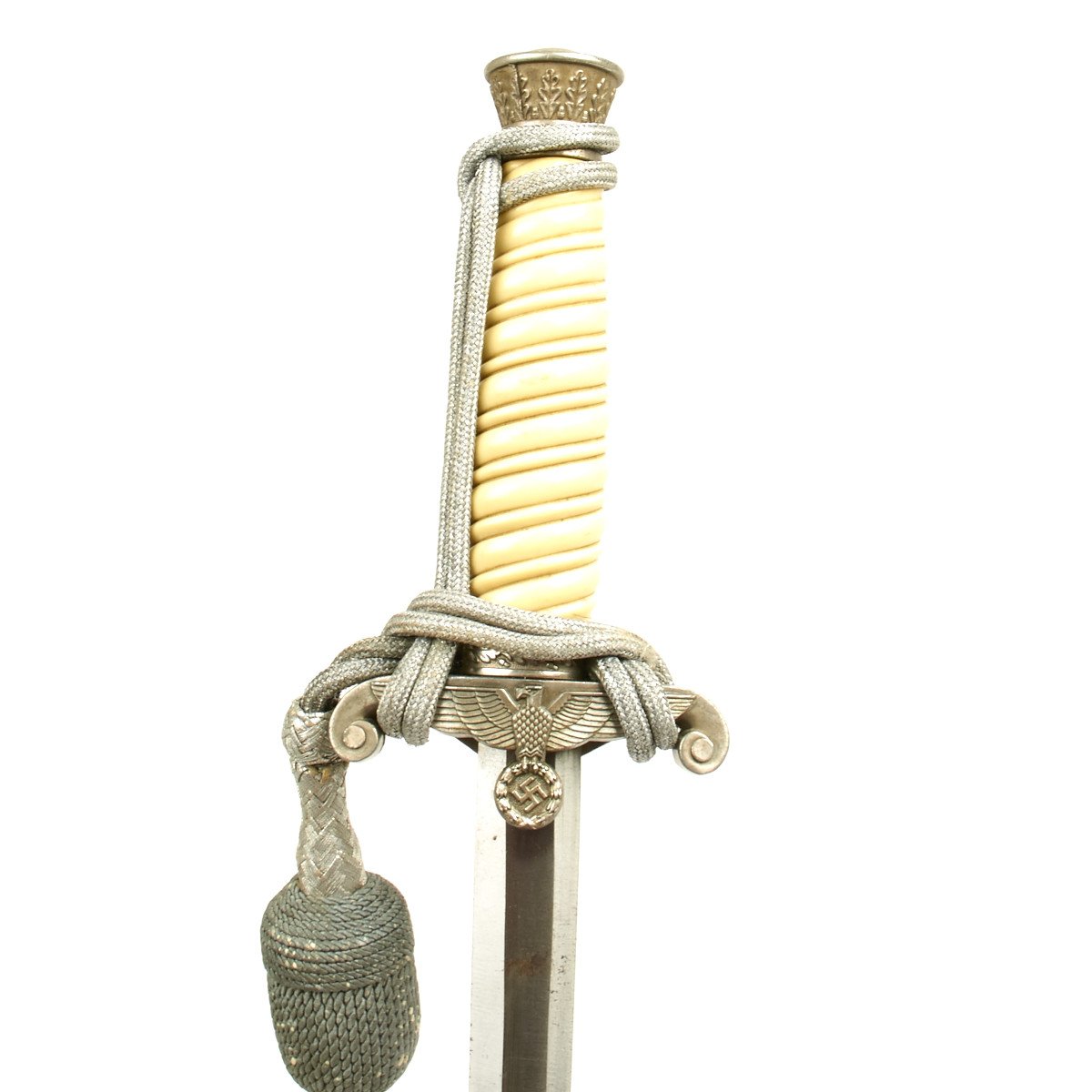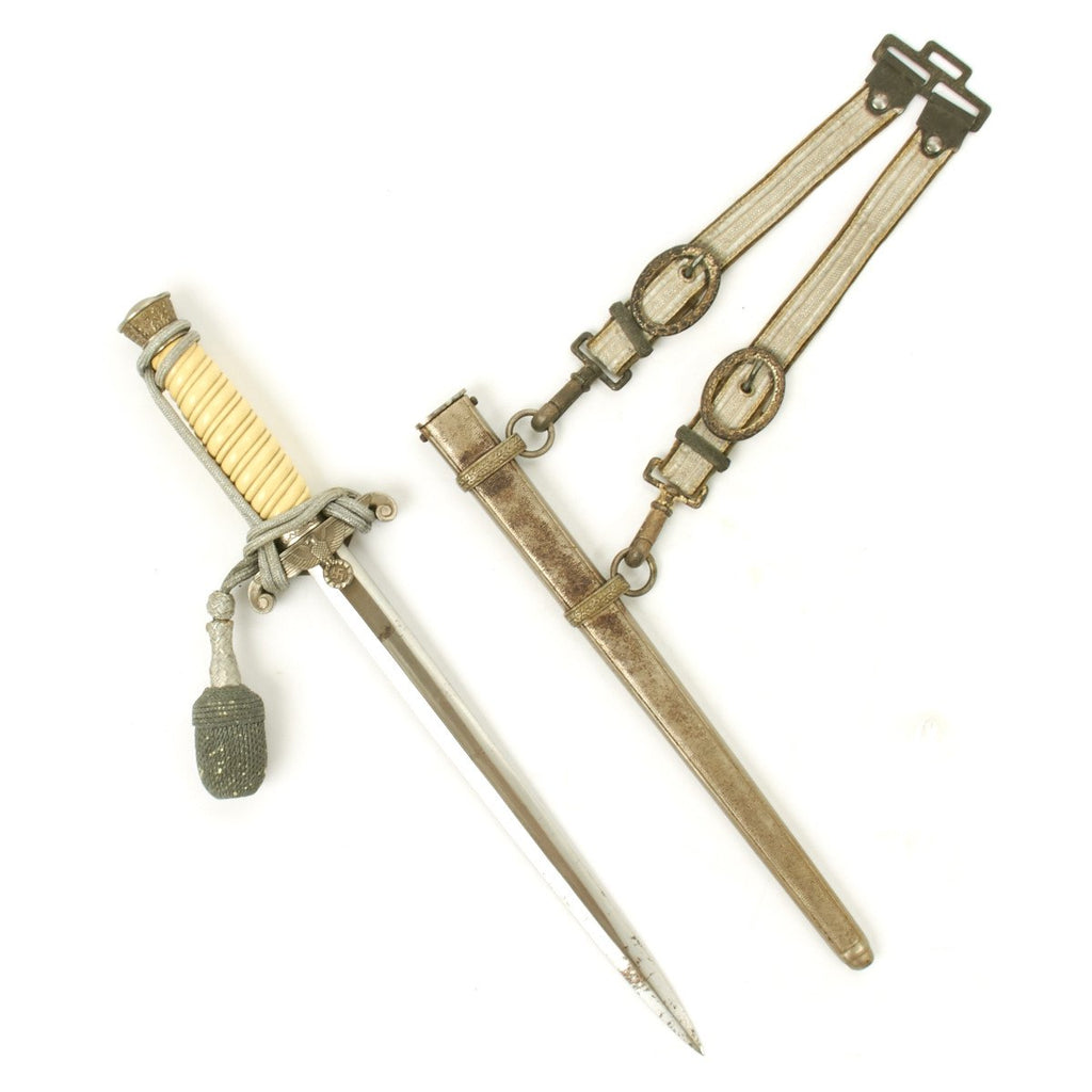 The pommel depicted oak leafing around the outer circumference. The scabbard had panels of pebble designs. Later produced examples were plated with nickel, and late war-made pieces were unplated, finished in a gray color metal. These daggers are often encountered with an aluminum portepee.