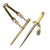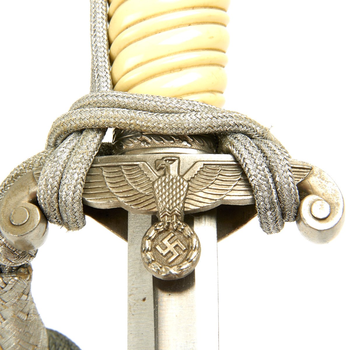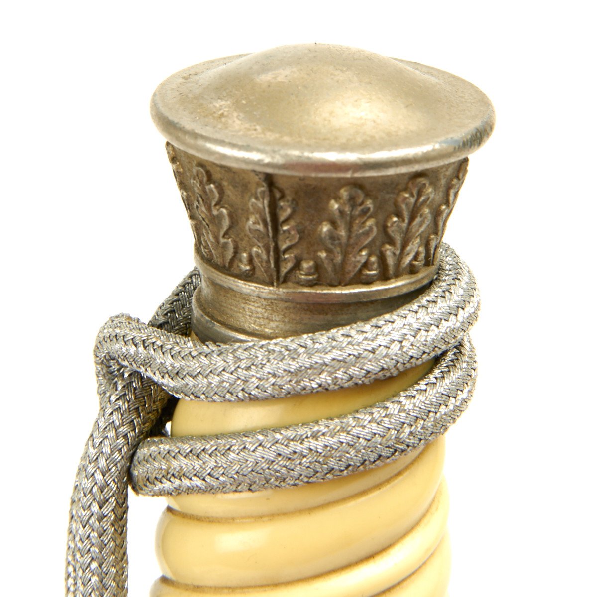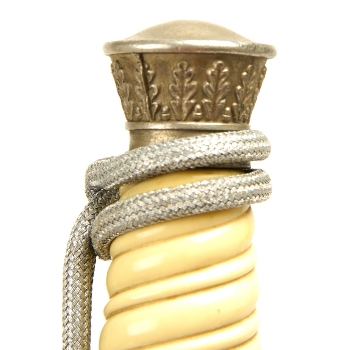 The pommel depicted oak leafing around the outer circumference. The scabbard had panels of pebble designs. Later produced examples were plated with nickel, and late war-made pieces were unplated, finished in a gray color metal. These daggers are often encountered with an aluminum portepee.
