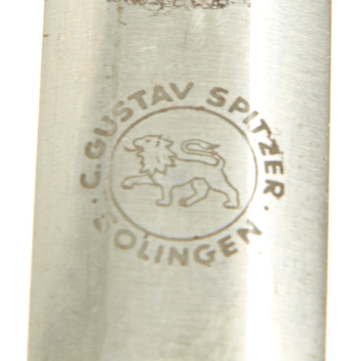 The blade is still bright, having most of the crossgrain in the surfaces and needle-like tip. There are some minor age spots which could possibly come out with a little work as they do not look deep. The reverse ricasso is etched with the familiar trademark with the firm's name and location in capital letters, C. Gustav Spitzer Solingen. Inside is a well defined prancing lion who holds his left front paw high in the air, with a wagging tail and a flickering tongue. A great trademark here! The original brown leather washer is in place.