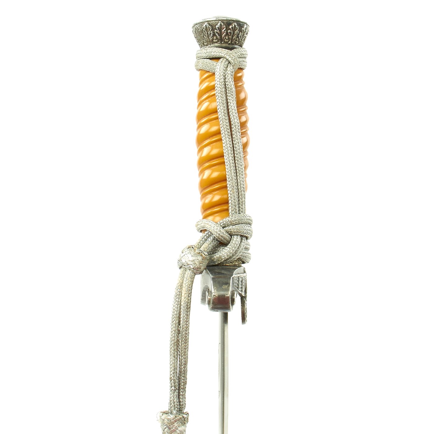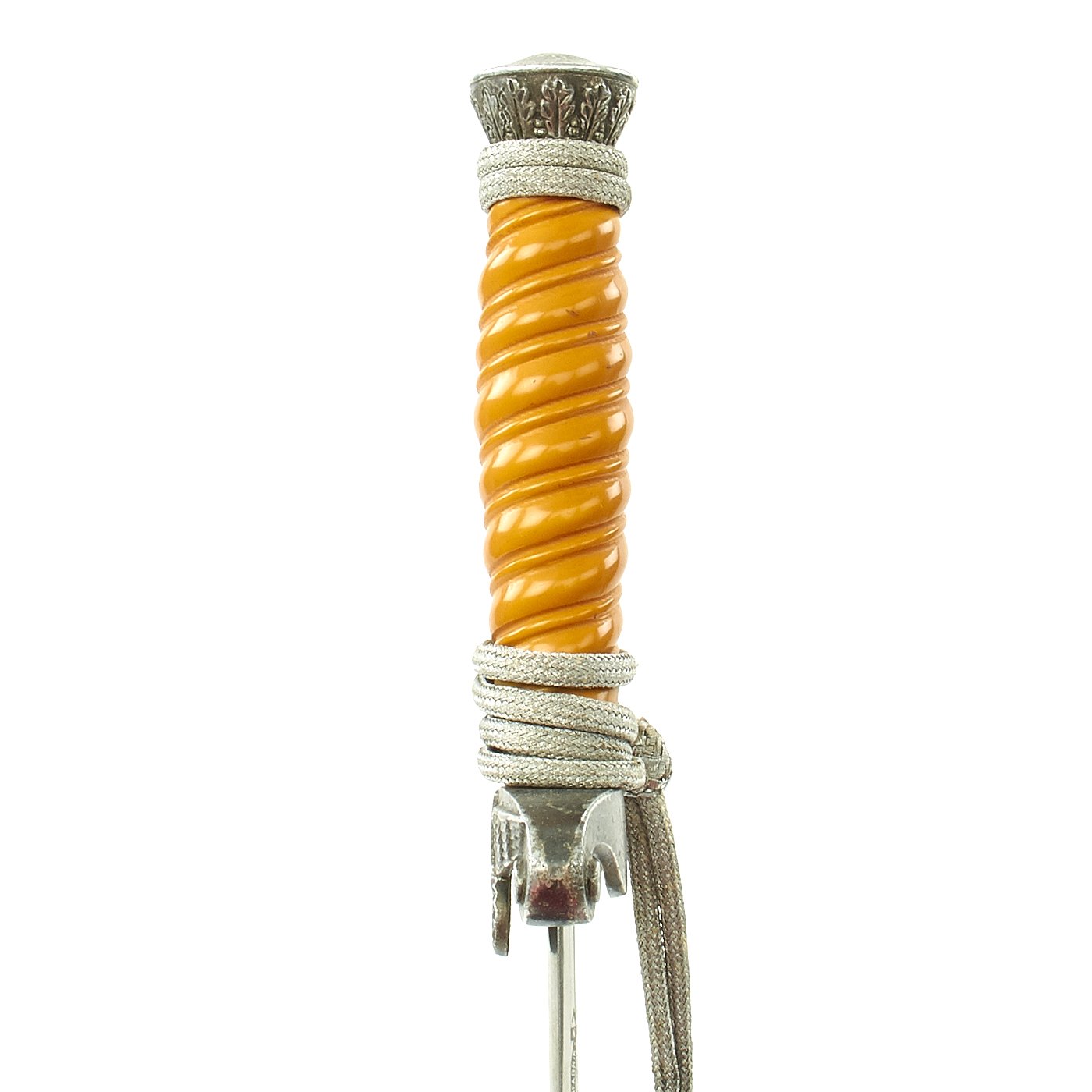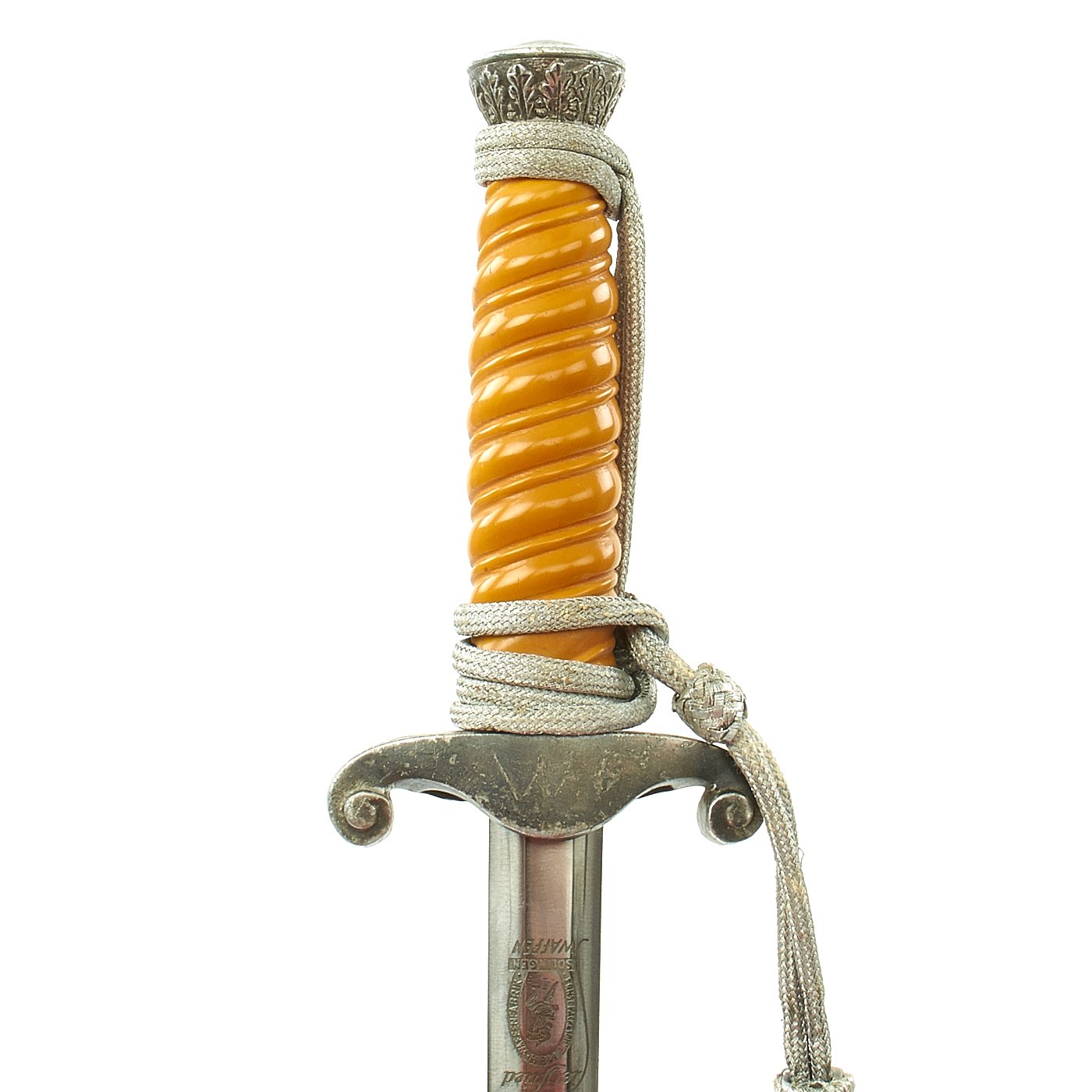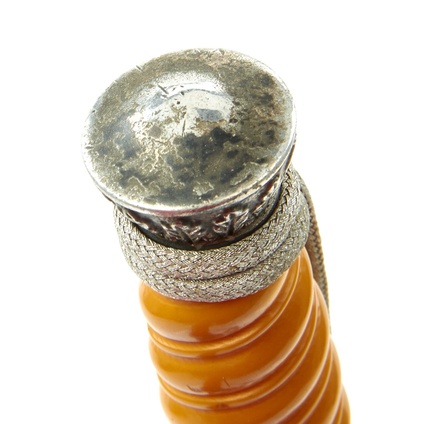 The grip is has faded to a nice light caramel brown, typical of celluloid grips from this period. This grip is in almost perfect condition throughout, with just a bit of wear and small scratches. Wrapped around the grip and cross guard is an original aluminum bullion thread portepee (sword knot), tied in the Heer fashion. It is in good condition as shown, with some light fraying in areas.