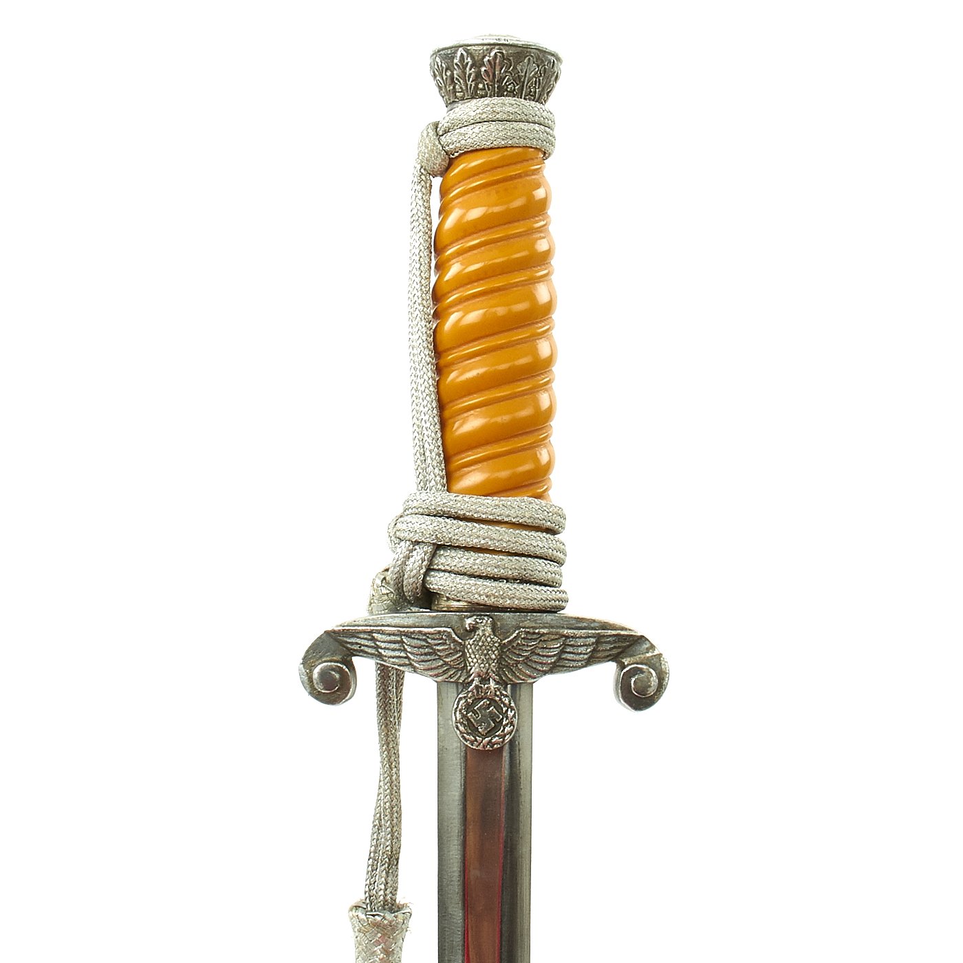 The pommel depicted oak leafing around the outer circumference. The scabbard had panels of pebble designs. Later produced examples were plated with nickel, and late war-made pieces were unplated, finished in a gray color metal. These daggers are often encountered with an aluminum portepee.