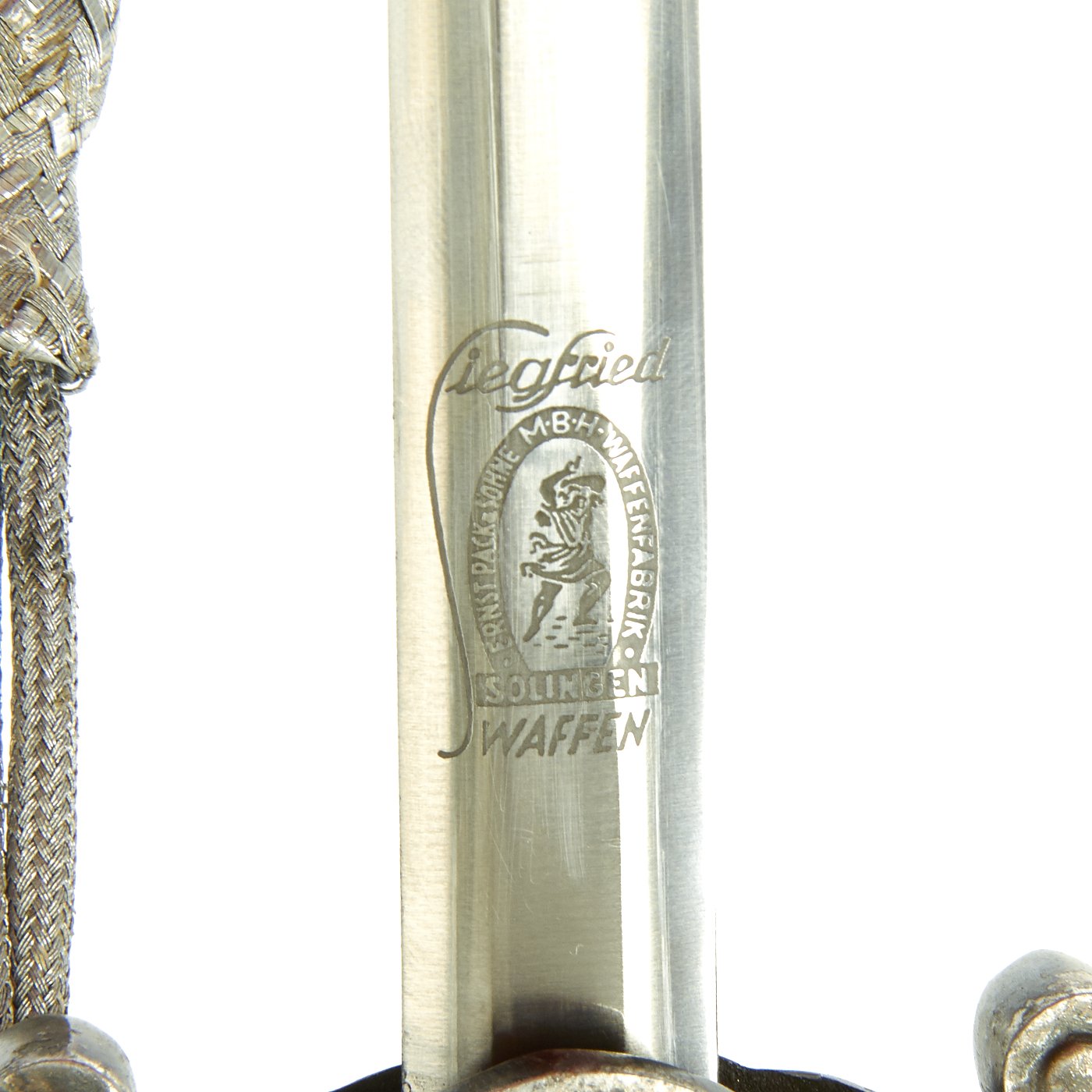 Original Item: Only One Available. This is a very nice Army Officer's Dagger, produced by the rare and very desirable Solingen-based firm Ernst Pack & Söhne, M.B.H. Waffenfabrik. The plated aluminum pommel of this dagger is in good condition, showing some wear and scratching throughout the bottom, which has removed some of the plating. It has a nice aged patina throughout, and the standing oak leaves and acorns are crisply detailed and have good backgrounds.