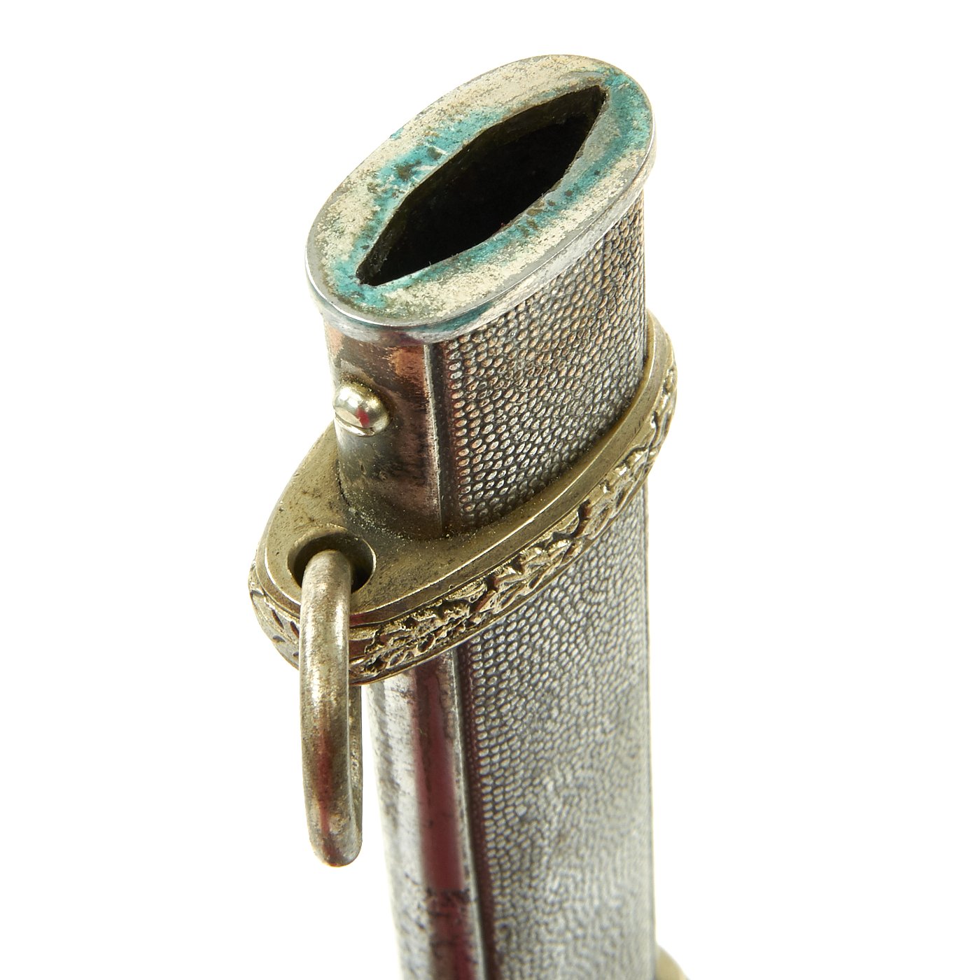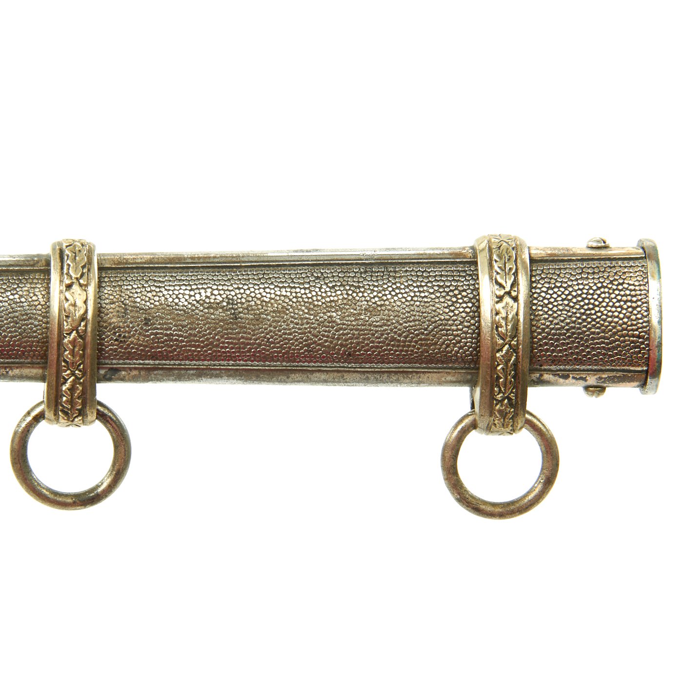 The scabbard is a fine example, and is plated steel. This straight scabbard has very crisp, finely pebble grained panels. The carrying bands have an excellent pattern of overlapping oak leaves and acorns, which are nicely enhanced, but also show some wear. The throat is the thinner style, and has dome-headed securing screws on the narrow sides of the scabbard. The finish looks to be silver or nickel, and has been cleaned recently. There is however a good amount of plating loss, and some oxidation into the steel body. However it is dent free, and the patina matches the hilt perfectly.