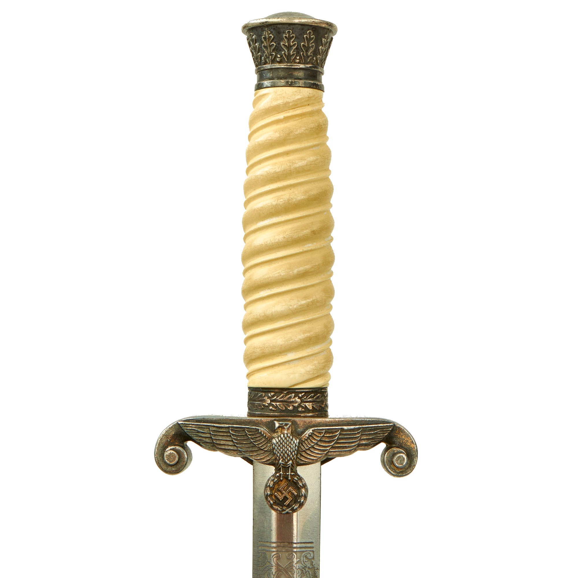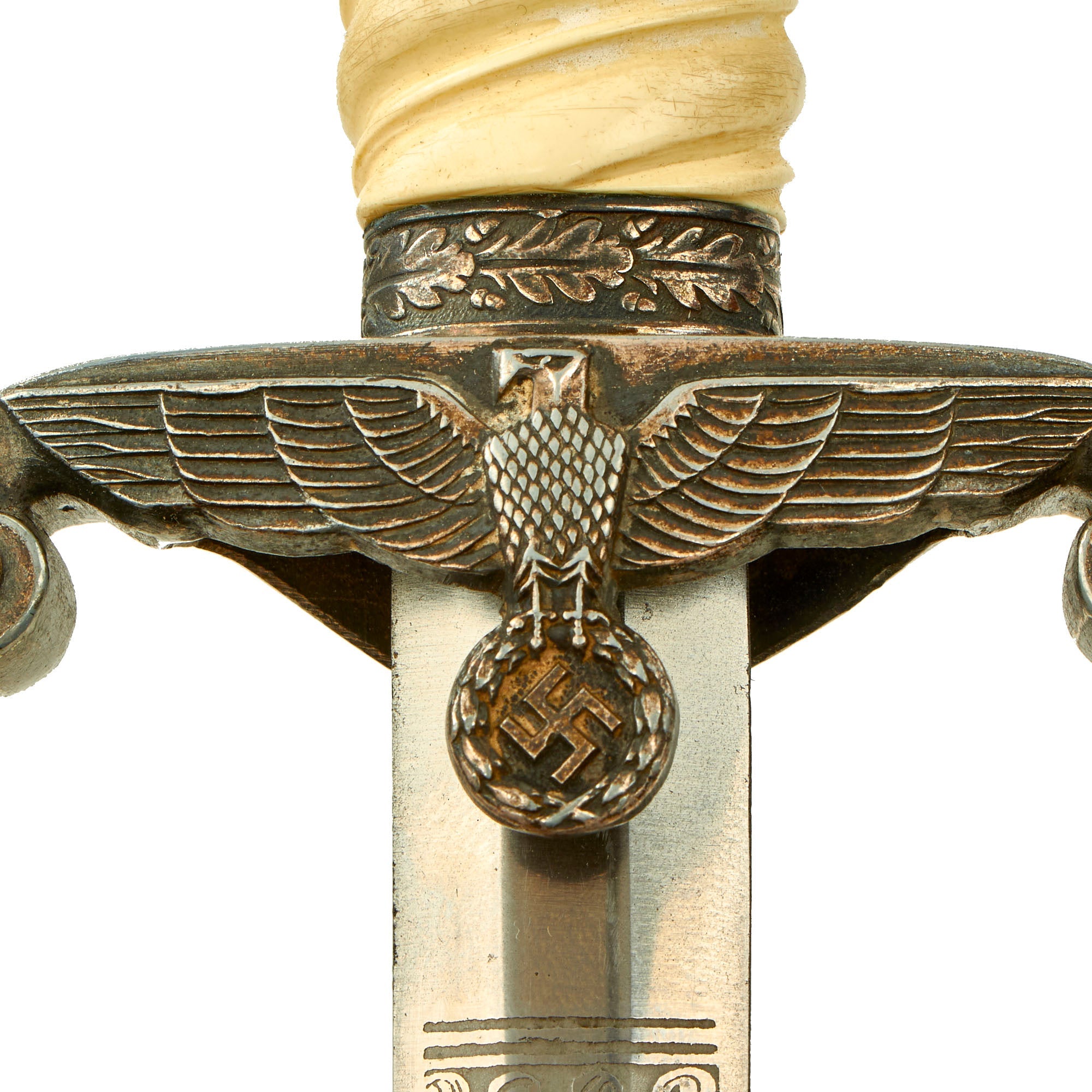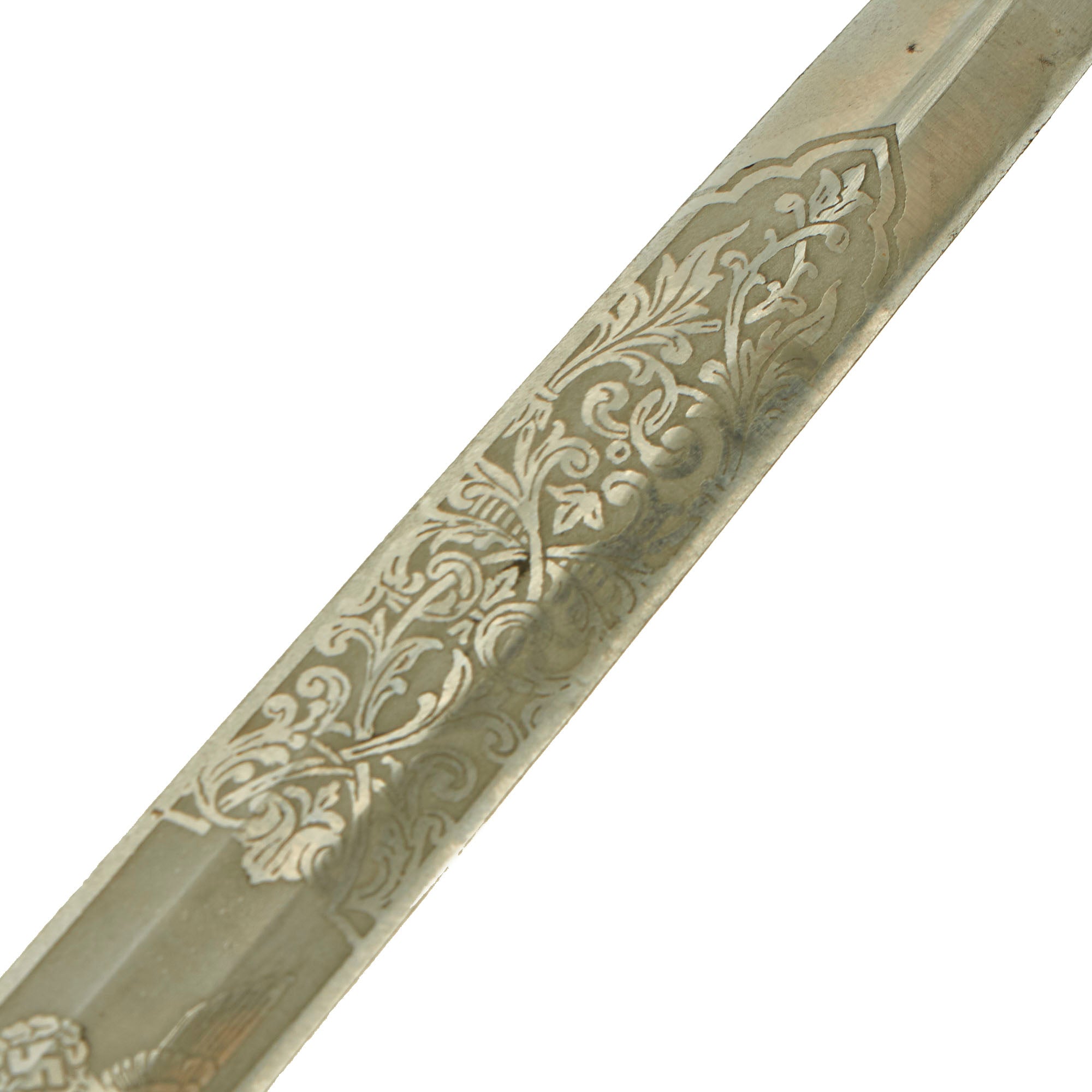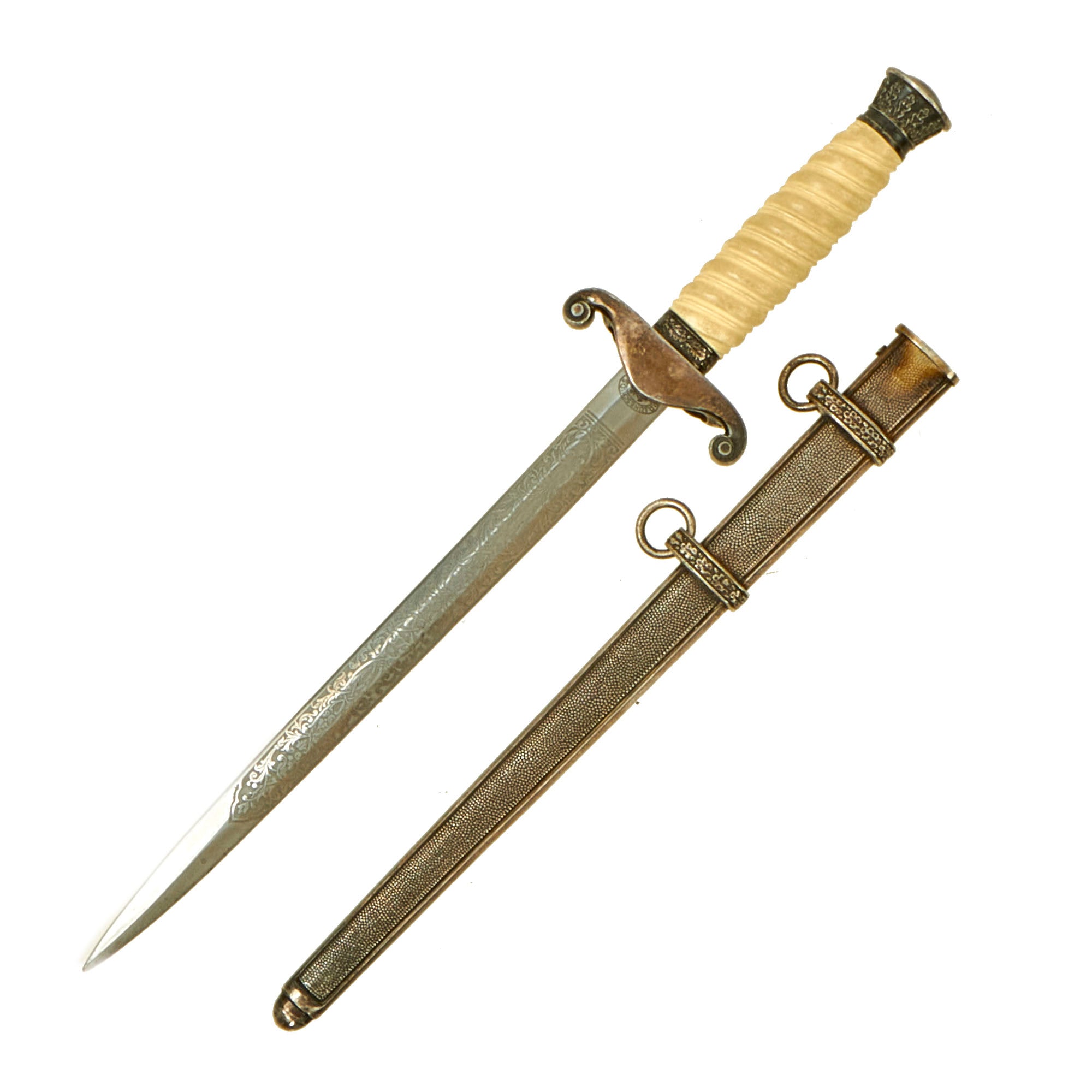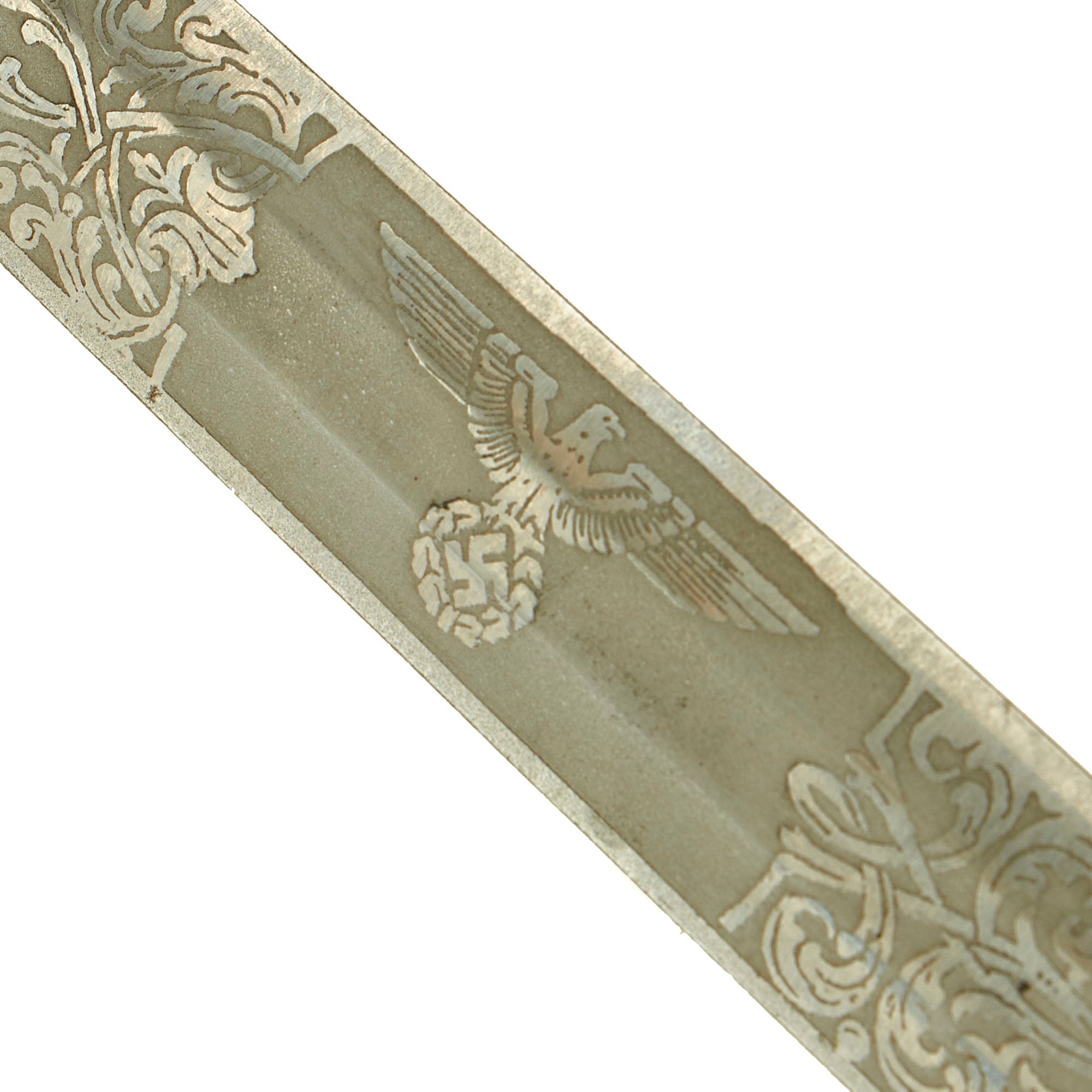 Original Item: Only One Available. This is an excellent condition Army Officer's Dagger, produced by the well-known Solingen-based firm P.D. Lüneschloss. It features a very nice etched steel blade, however close examination shows that while the blade is WWII production, the etching was probably added during the immediate post war period. It shows lovely foliate designs on both sides, with a "Spread Wing" Heer Army Wehrmachtadler eagle on the front side.