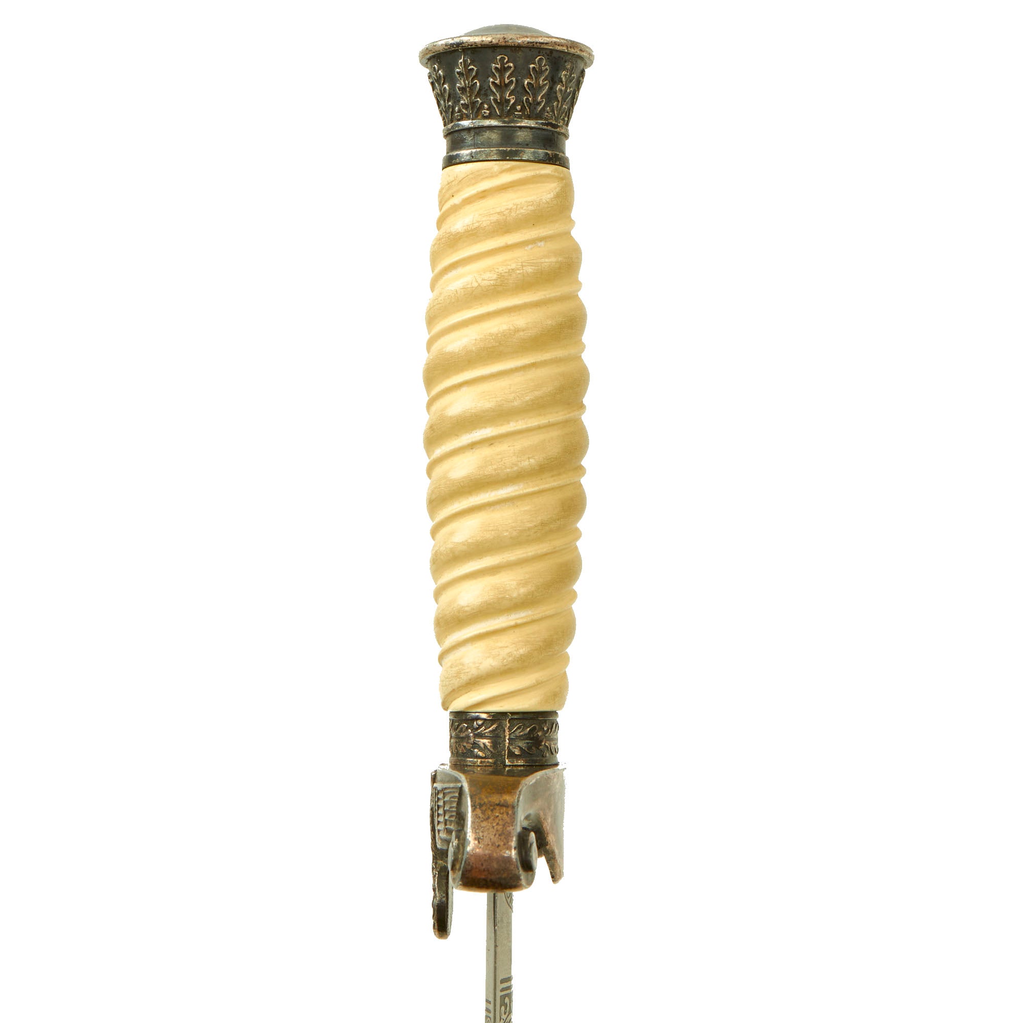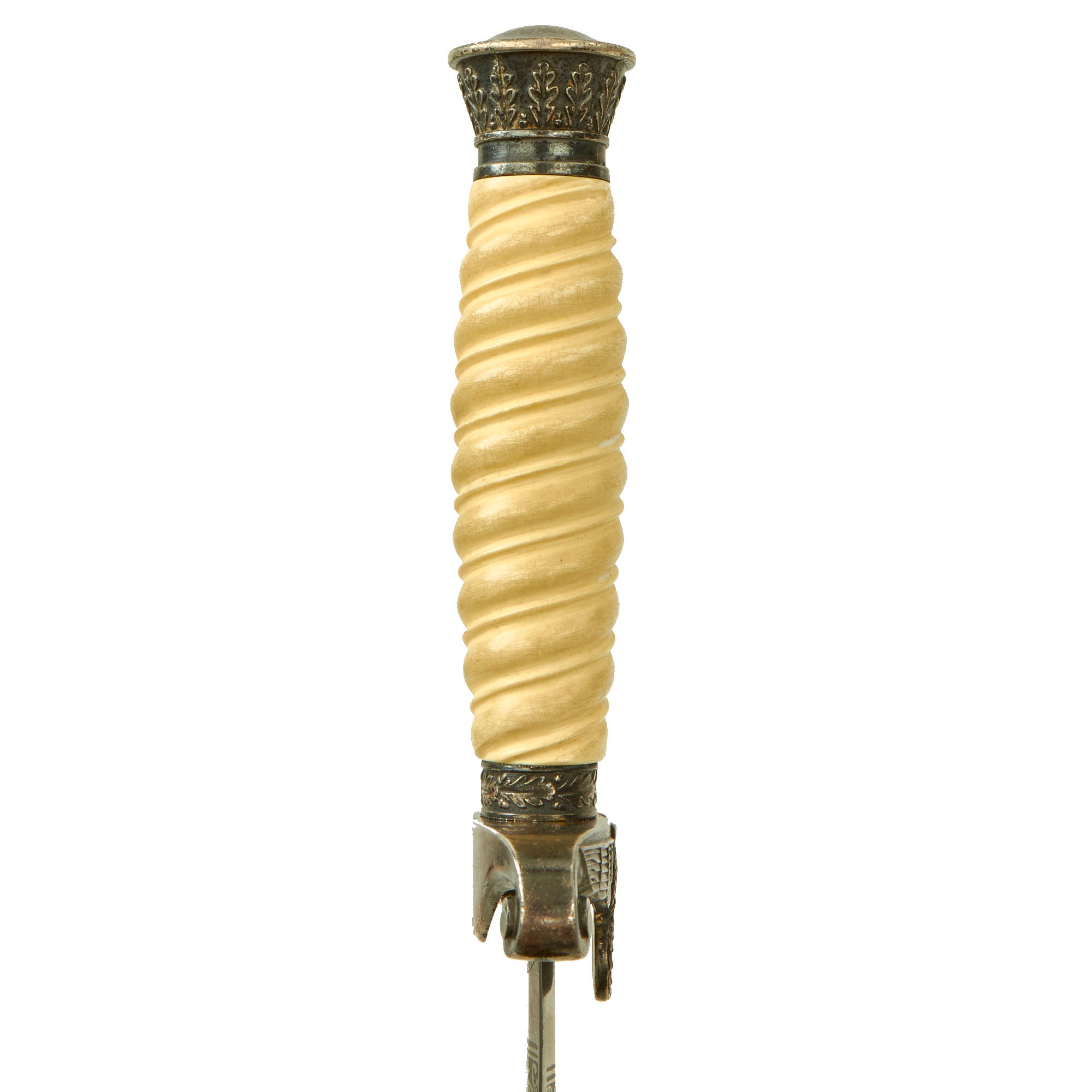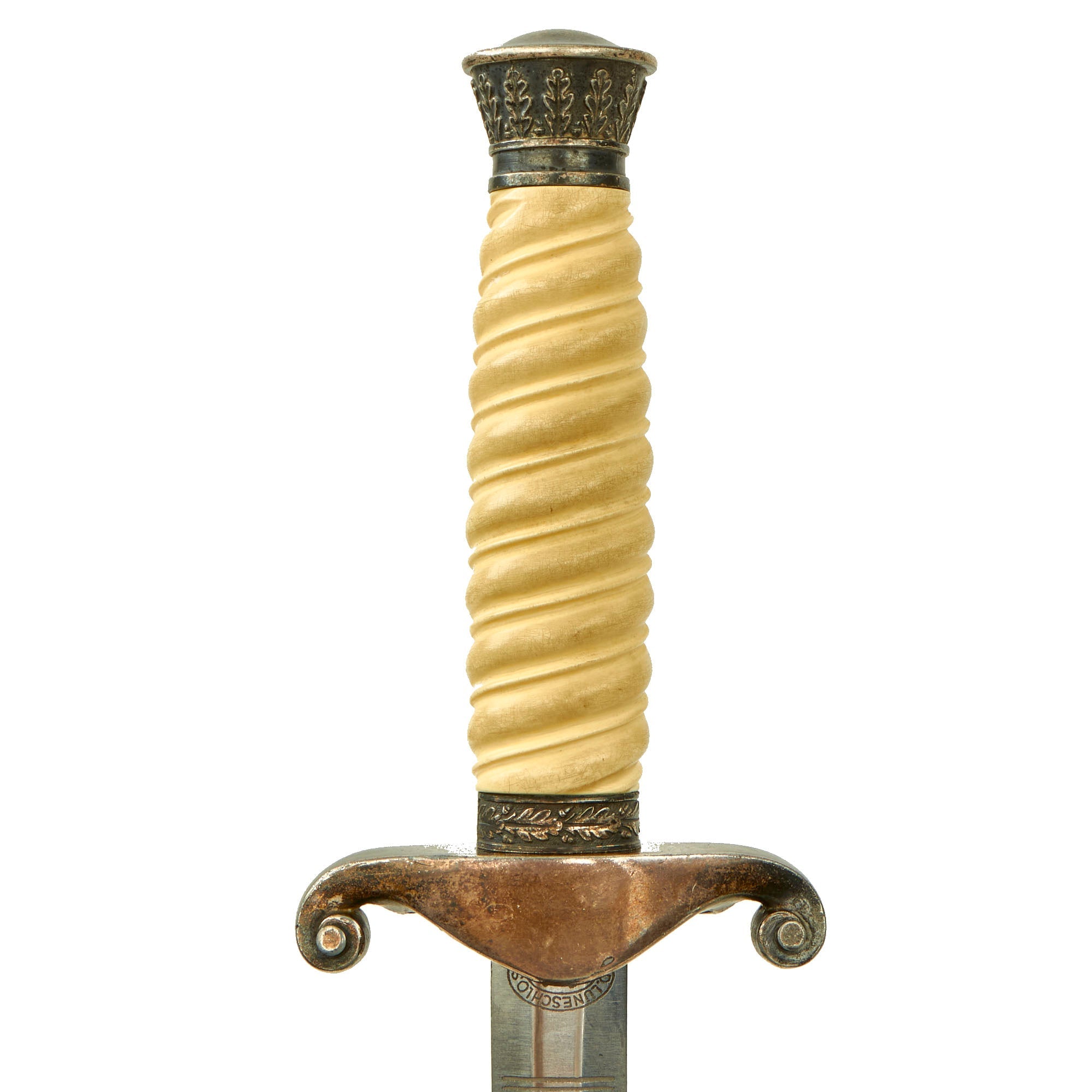 The plated crossguard is in similar condition, with a lovely color, showing only light use from service. The details throughout the characteristic eagle are exceptional throughout the head, breast and wing feathering, talons and wreathed mobile swas. The alloy grip ferrule looks great, with the plating now the same lovely tarnished color, matching the other fittings. Unlike almost all that we see, the celluloid grip of this dagger is still the original ivory white color, which is very rare to see! Most fade to yellow and orange over the years due to the instability of the material. It does some some light wear and staining, but overall has a fantastic look.