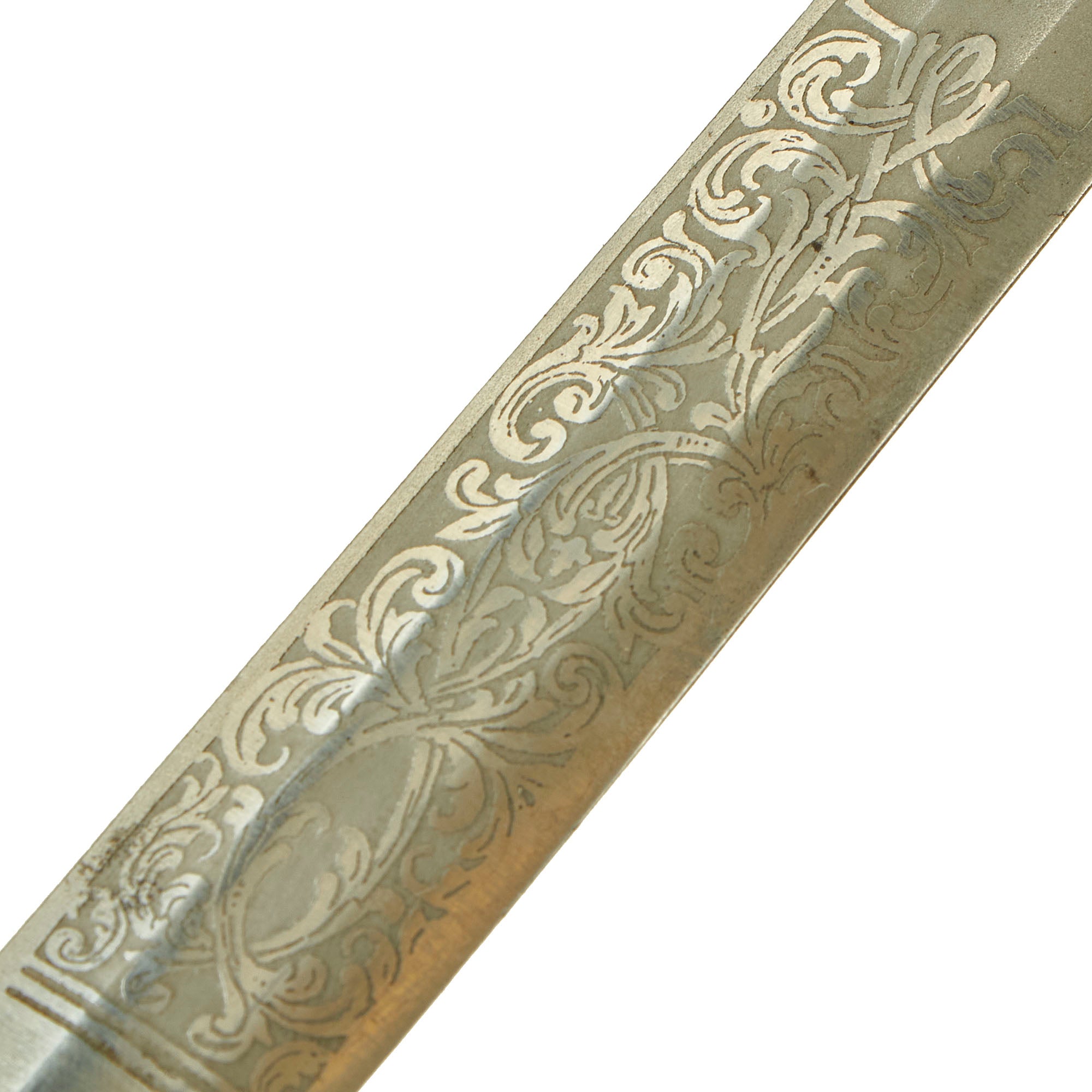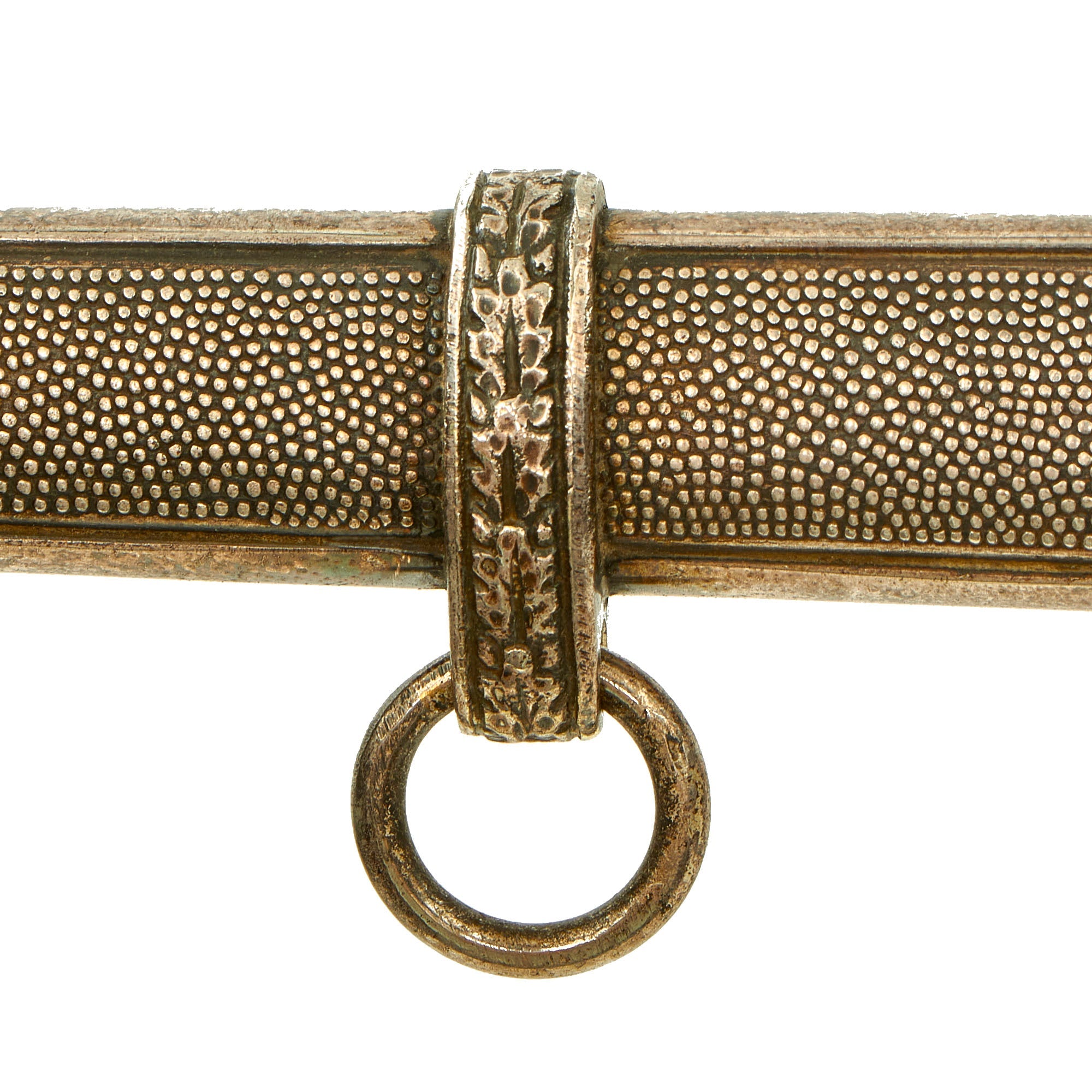 The pommel depicted oak leafing around the outer circumference. The scabbard had panels of pebble designs. Later produced examples were plated with nickel, and late war-made pieces were unplated, finished in a gray color metal. This early war version is quite nice, and in great shape.