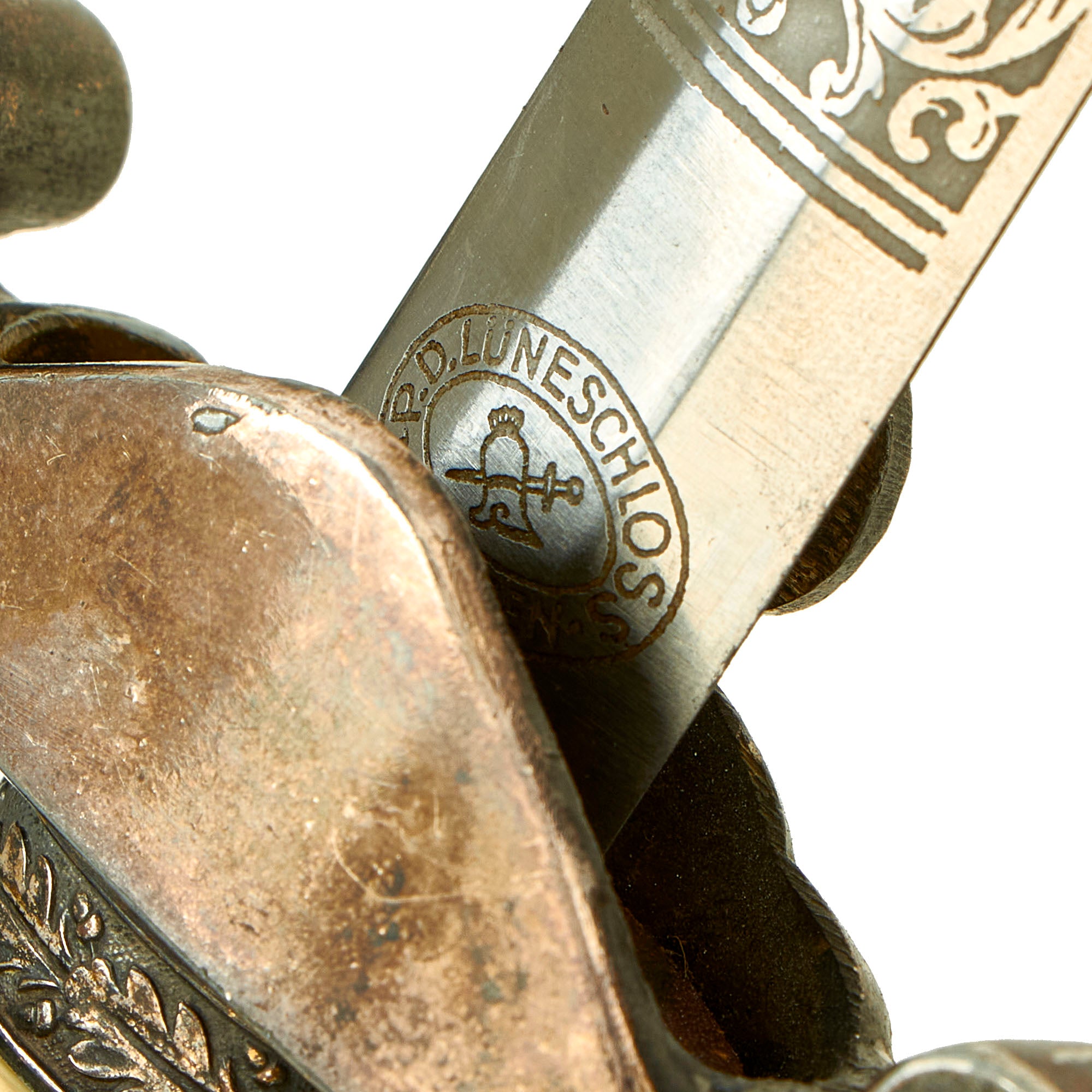 The well-known P.D. Lüneschloss, Fabrik blanker Waffen (Factory of Bare Weapons) company was founded in 1810 by Peter Daniel Lüneschloss, and produced numerous edged weapons, both for domestic and foreign contracts. They manufactured many private purchase officer's swords and blades for the U.S. Civil war. This logo was particularly used during the Third Reich period, per J. Anthony Carter's work GERMAN KNIFE AND SWORD MAKERS.