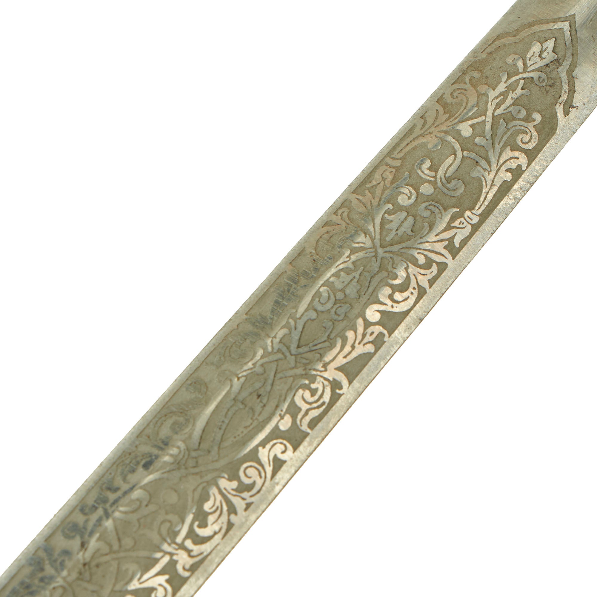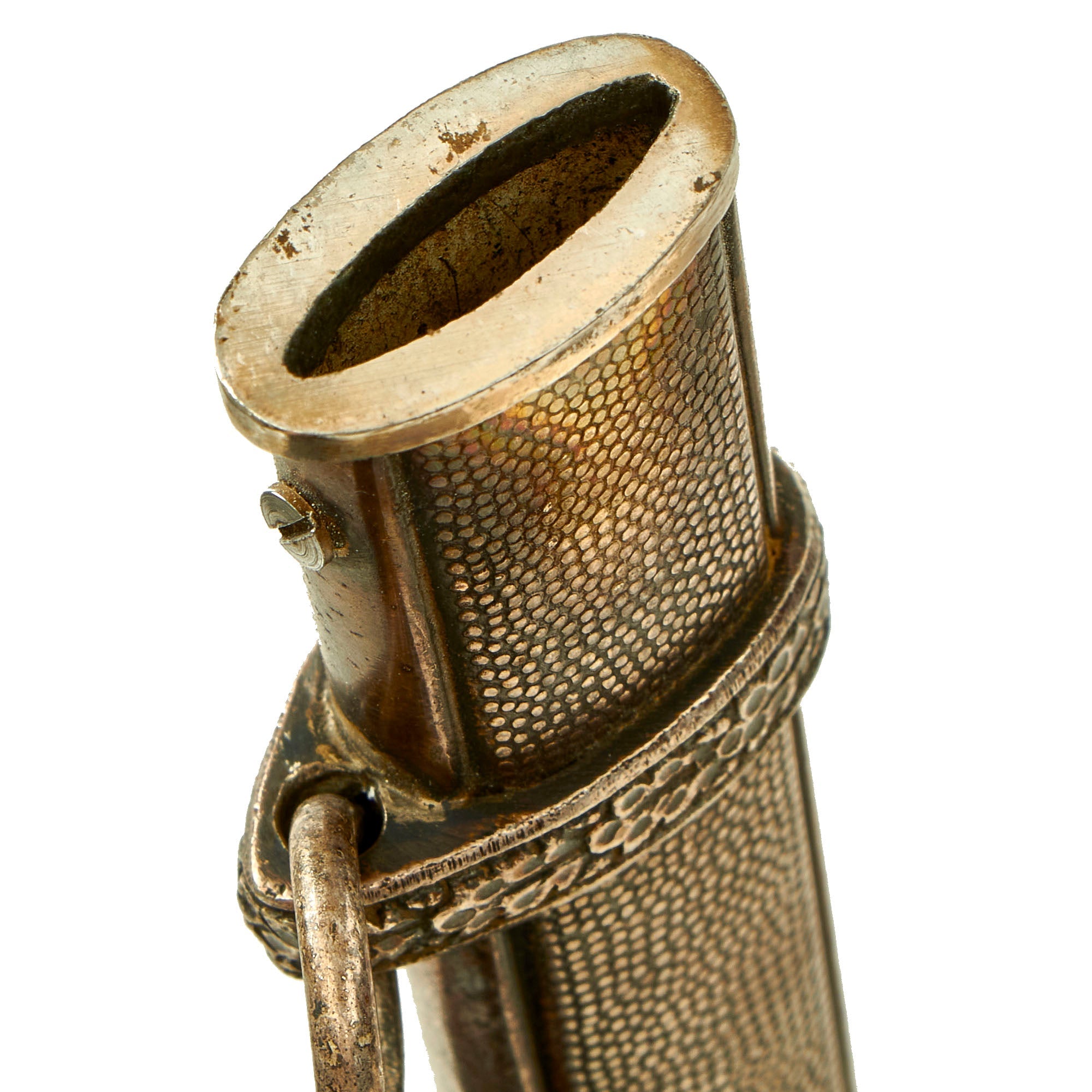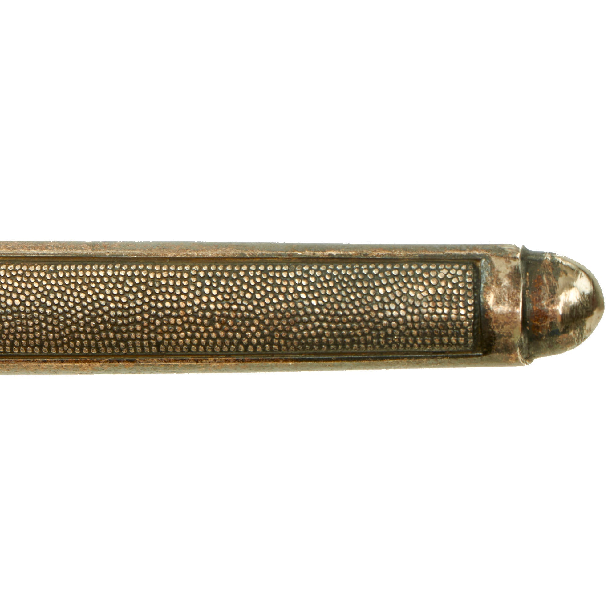 The scabbard is a fine straight example with no denting, and is made of high quality plated steel. This scabbard has very crisp, finely pebble grained panels, and the carrying bands have a very nice overlapping oak and acorn motif, a common design seen on German edged weapons. They do show some wear from use, being made from a relatively soft alloy. The throat is the thinner style, and has a single "cheese head" securing screw on the upper edge of the scabbard. The finish looks to be silver plate, and is in great shape, with a lovely dark tarnish of age. The top of the throat is still lighter in color, having been protected by the cross guard.