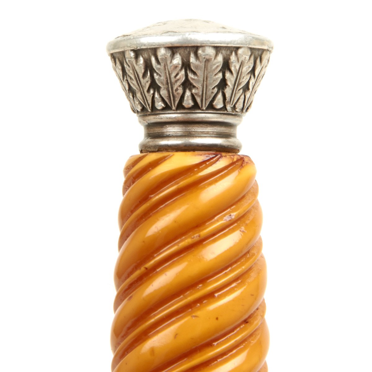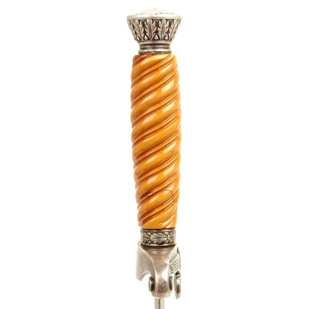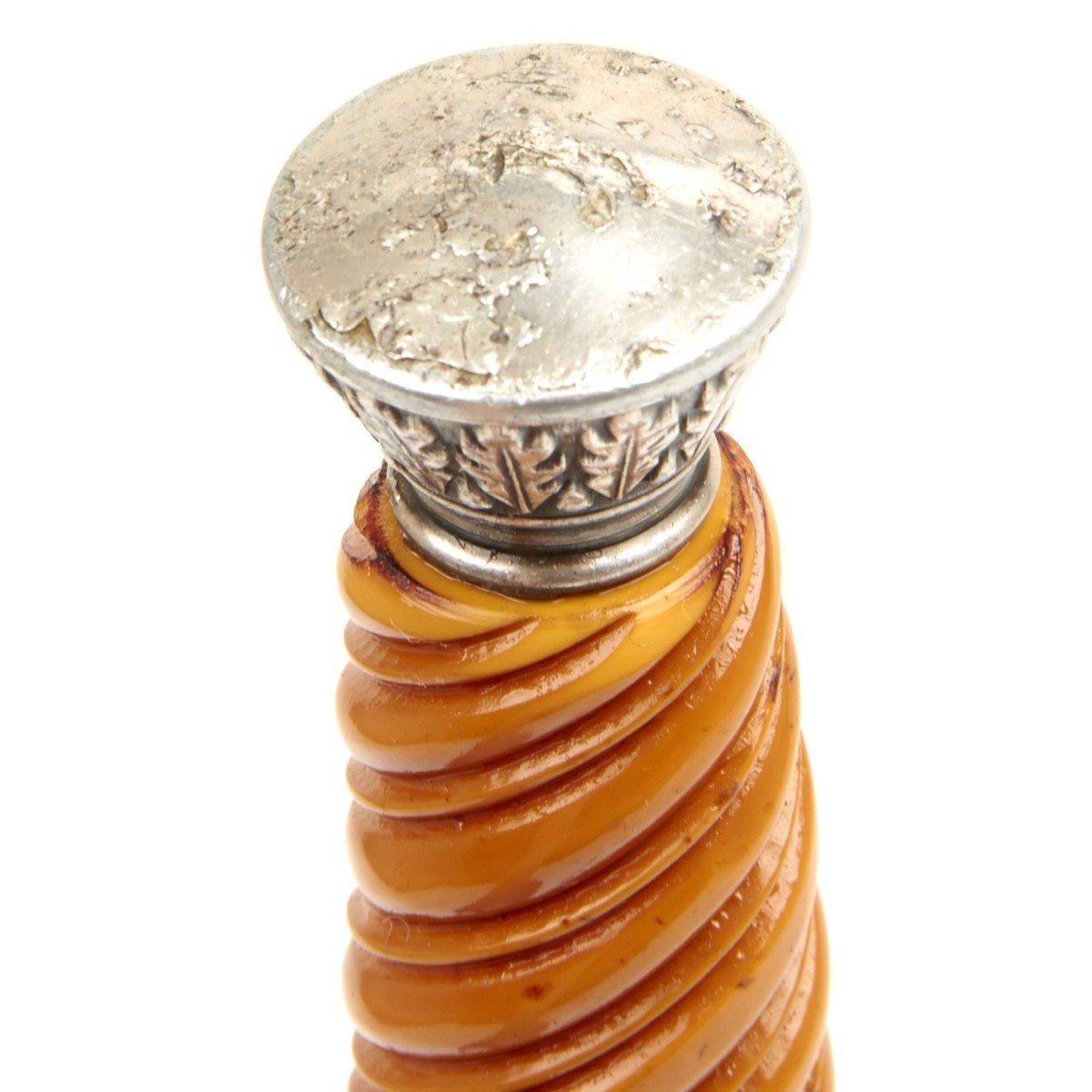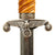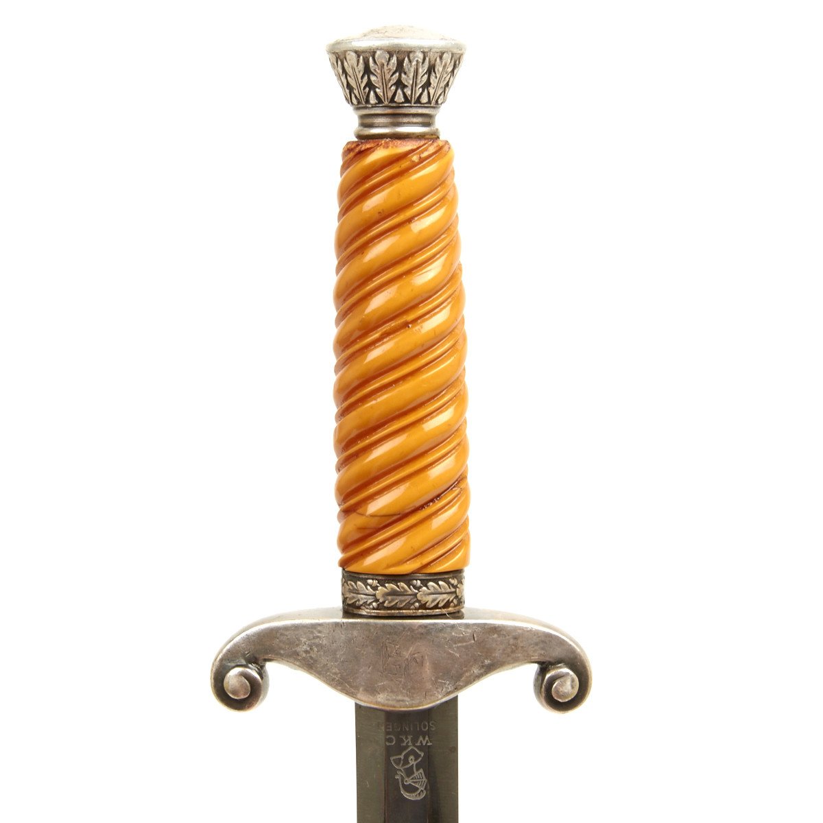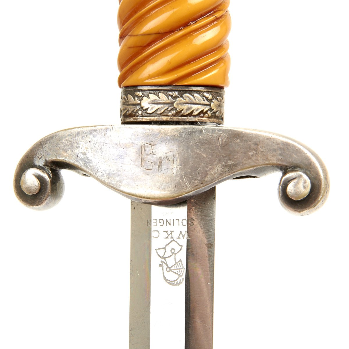 The crossguard retains much silvering and has a fine patination. The details throughout the characteristic WKC eagle are still present throughout the head, breast and wing feathering, talons and wreathed mobile swas. The grip is a very pretty, deep orange color. This grip is in very condition with a tiny crack towards the base but the grip is still totally solid.