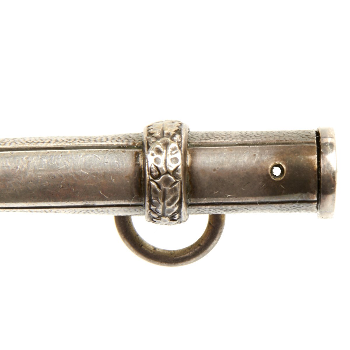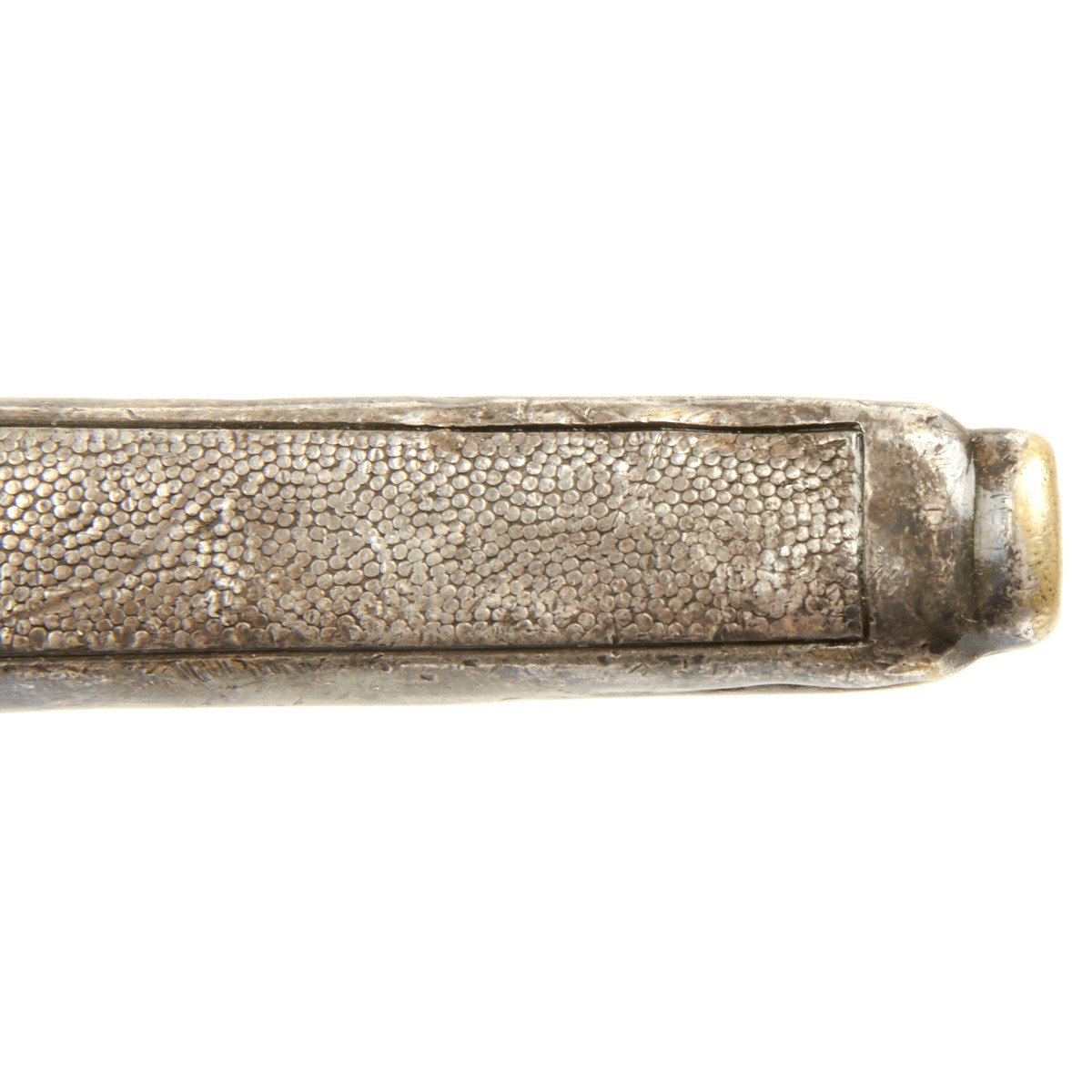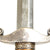 The scabbard is a classic WKC example, with much of the silvering and some of the frosting along the edges. This scabbard has minor dents but is still has crisp finely grained panels. The carrying bands have an excellent pattern of overlapping oak leaves and acorns, with hand enhancing evident on each of the leaves. The throat is the thicker style and is held in place by a single flat head screw on the upper right edge (now absent).