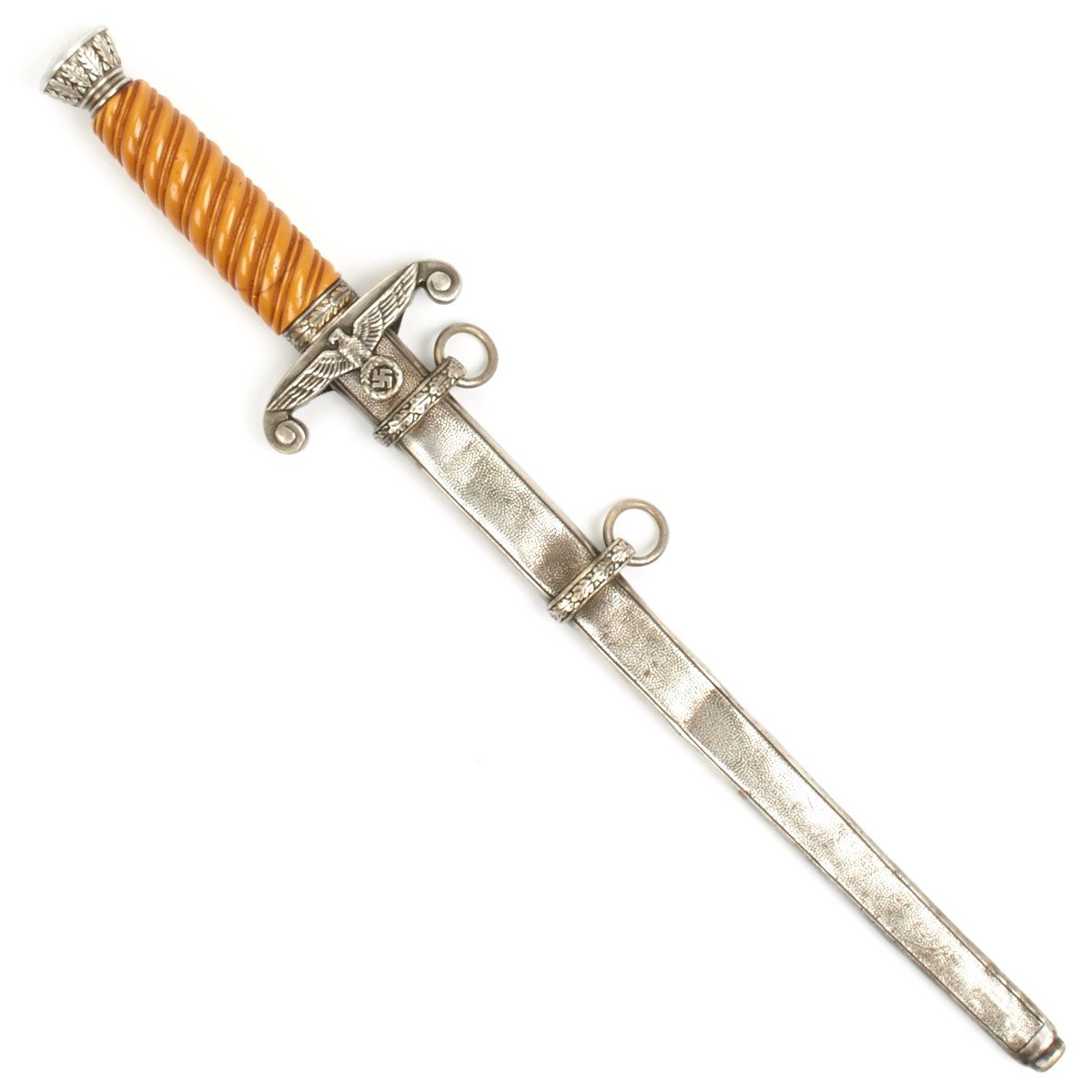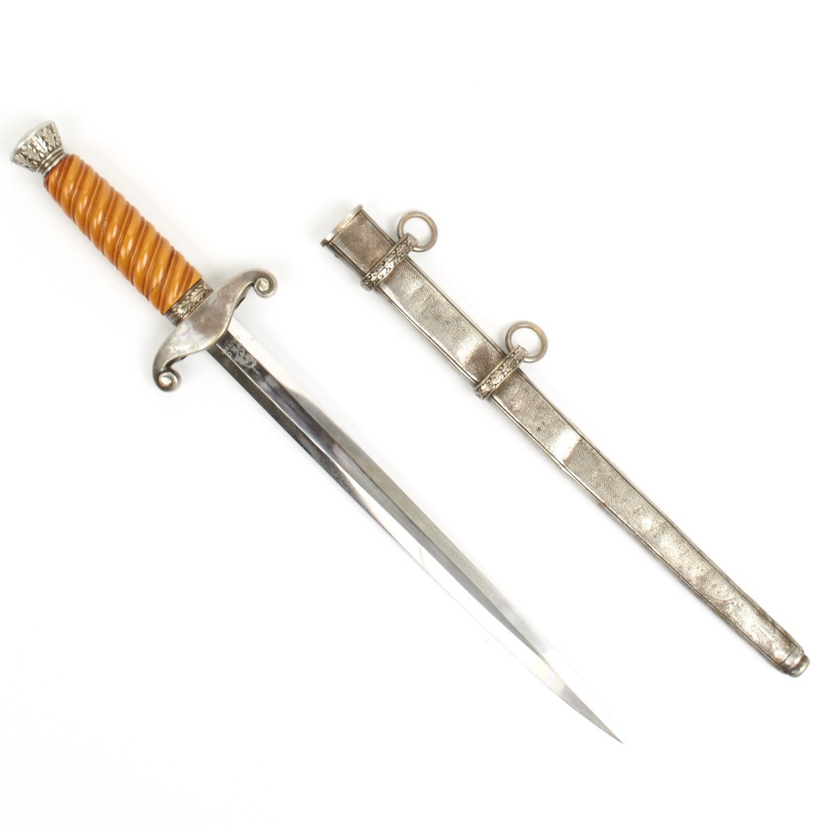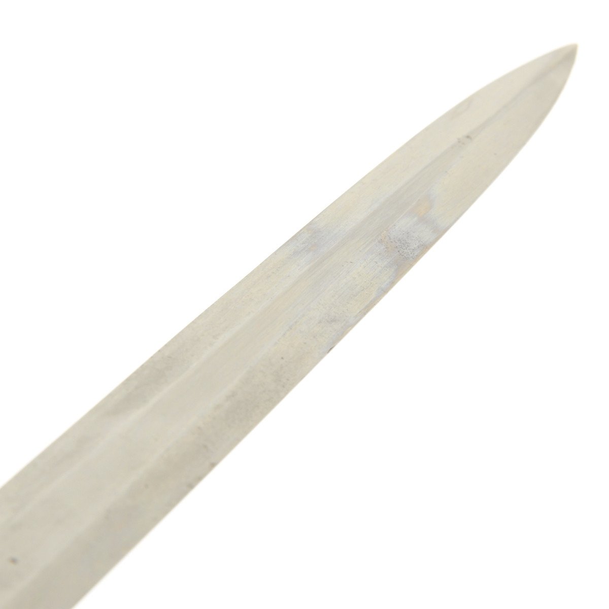 The pommel depicted oak leafing around the outer circumference. The scabbard had panels of pebble designs. Later produced examples were plated with nickel, and late war-made pieces were unplated, finished in a gray color metal. These daggers are often encountered with an aluminum portepee (sword knot).