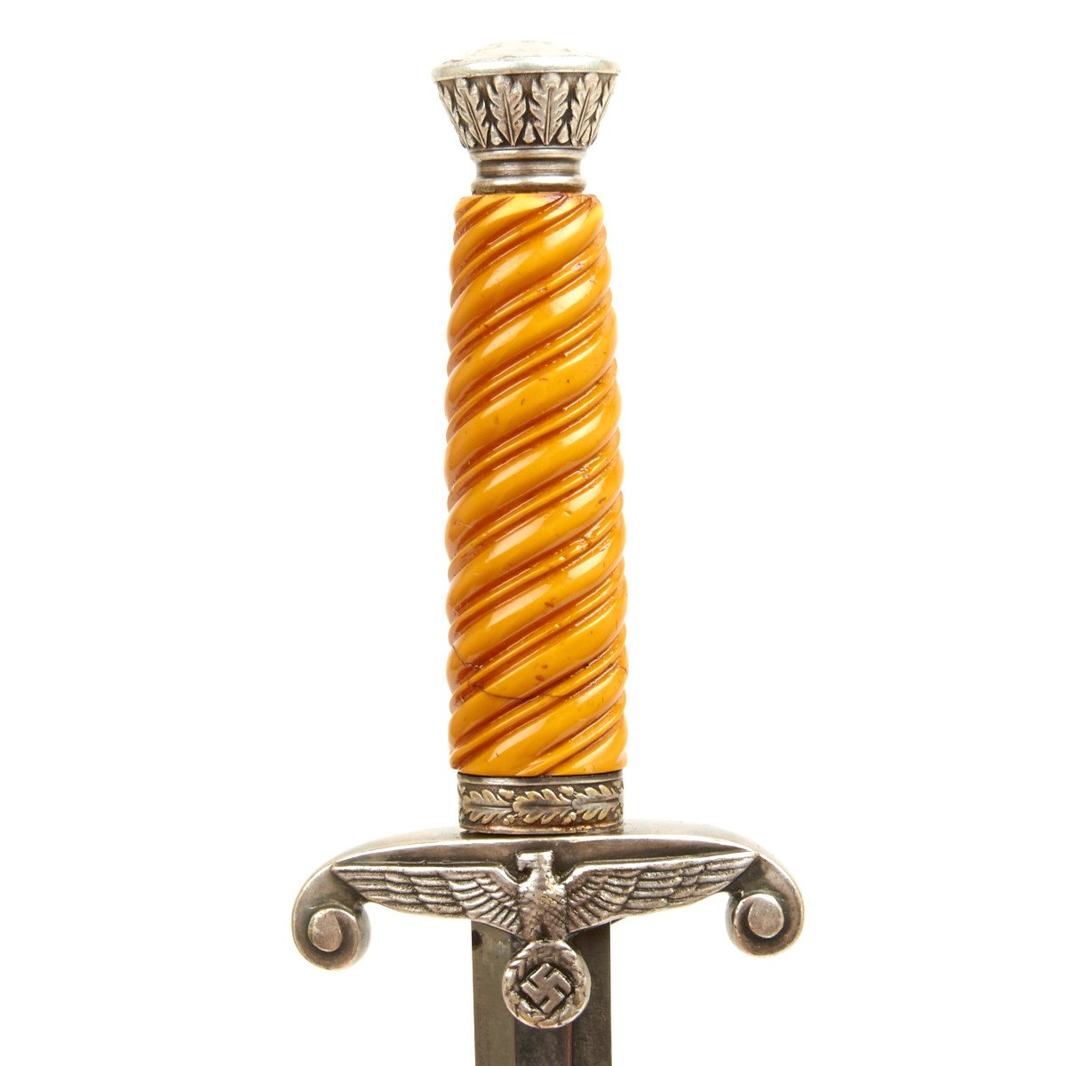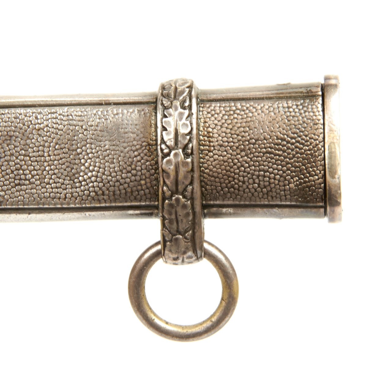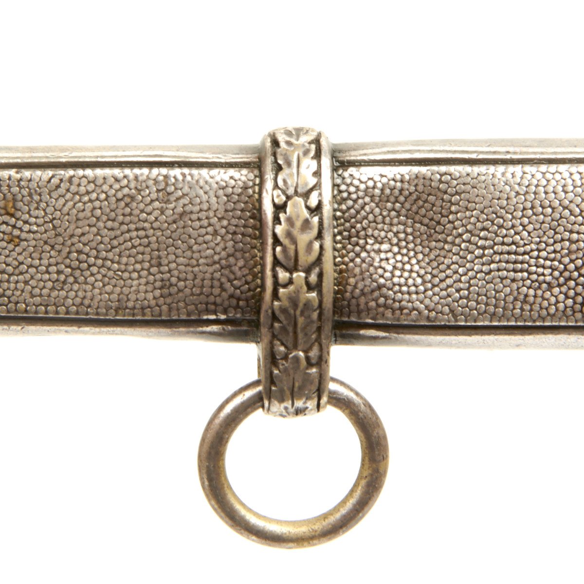 The pommel depicted oak leafing around the outer circumference. The scabbard had panels of pebble designs. Later produced examples were plated with nickel, and late war-made pieces were unplated, finished in a gray color metal. These daggers are often encountered with an aluminum portepee (sword knot).