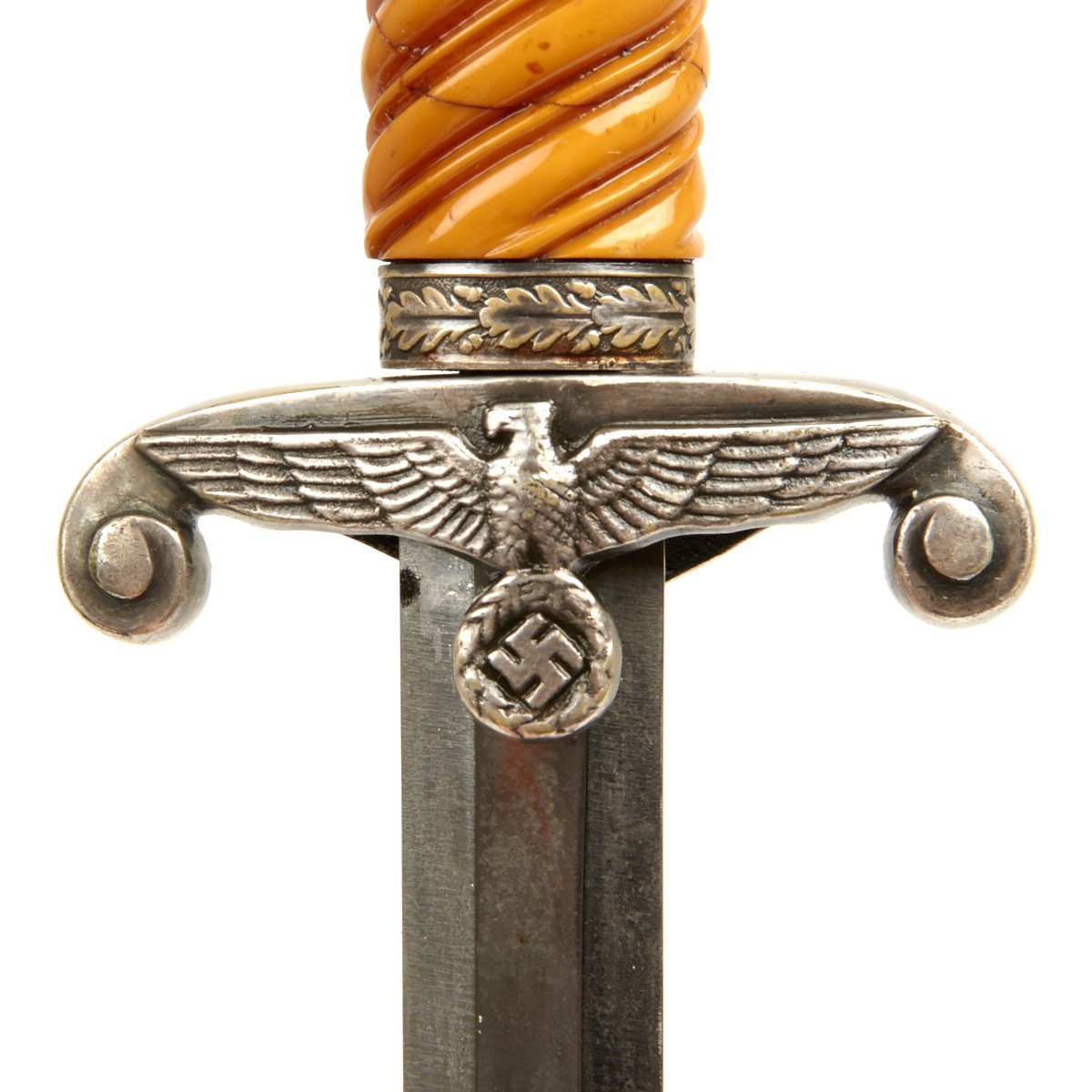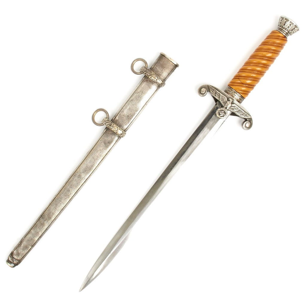 The German Army (Heer) first carried a dagger beginning in 1935. The weapon was worn in lieu of occasions not demanding the wearing of a more formal sword. The dagger design was quite attractive featuring silvered heavy fittings with white or colored grip. The crossguard depicted a Wehrmacht open-winged eagle clutching a wreathed swas.
