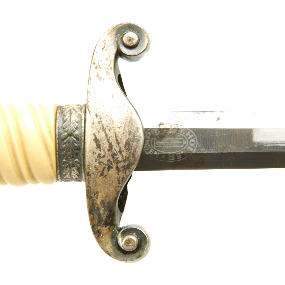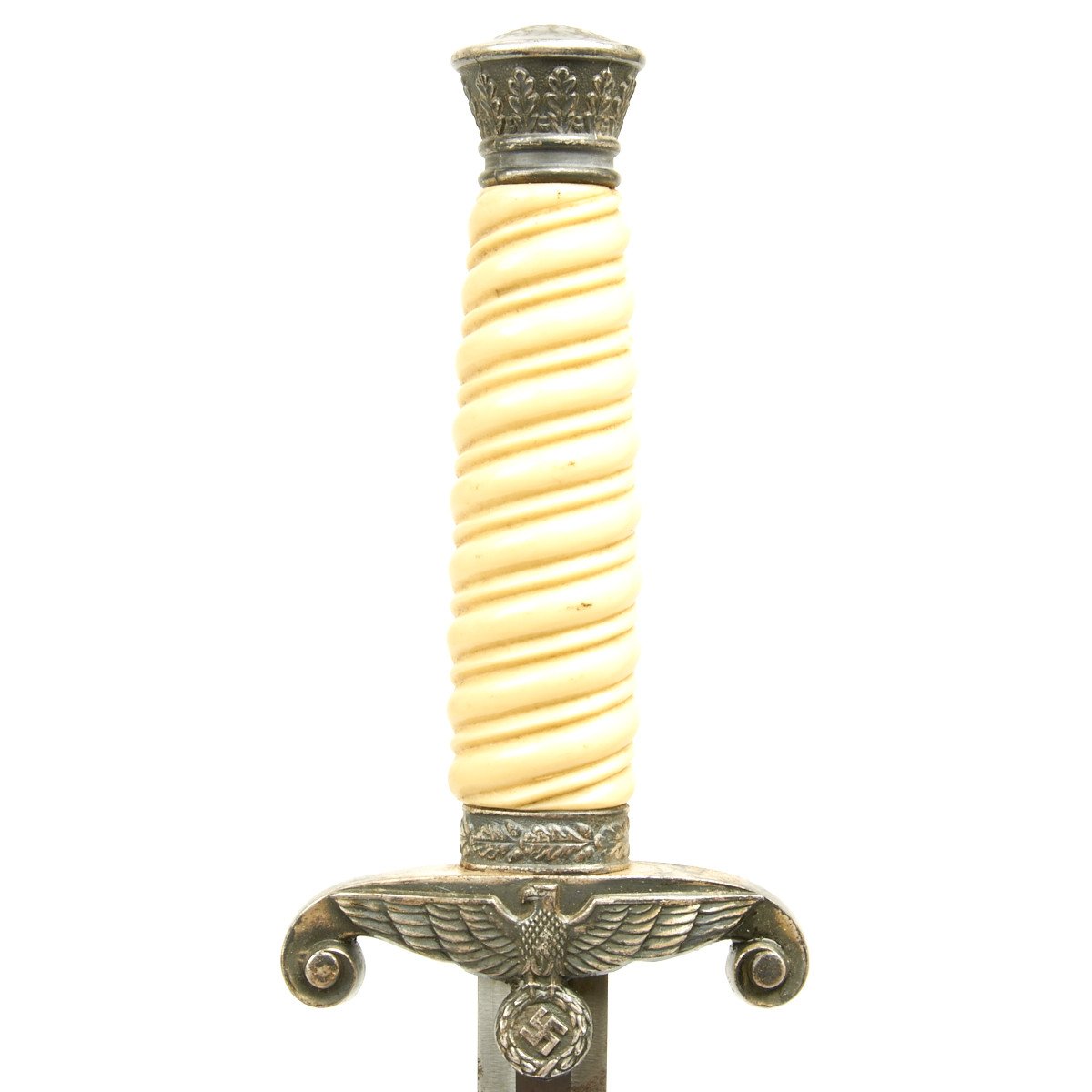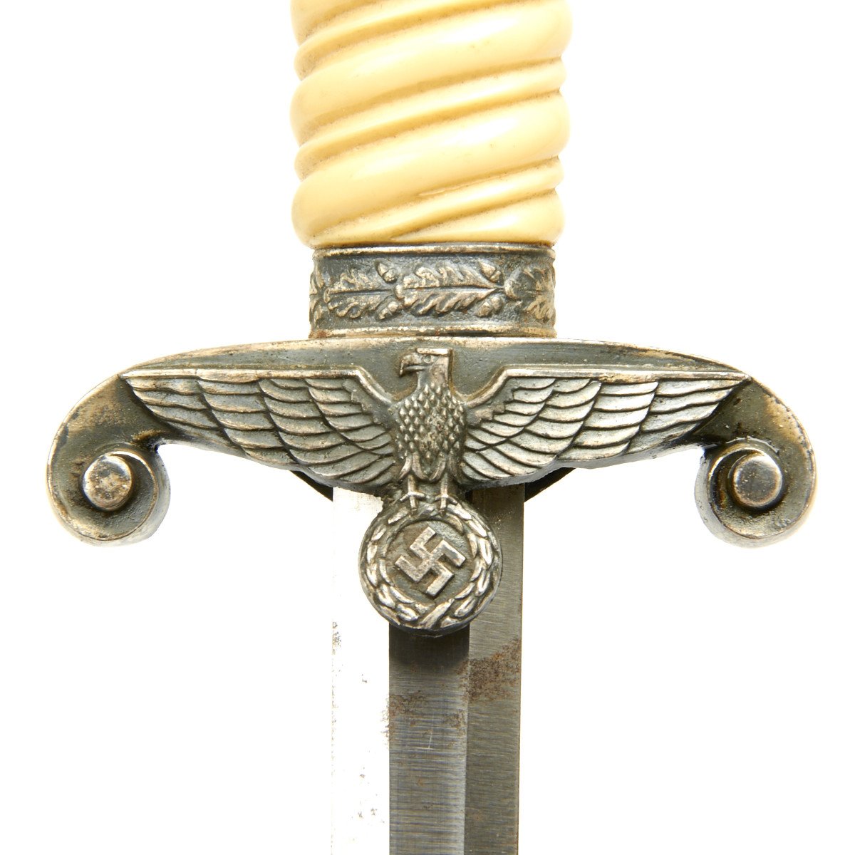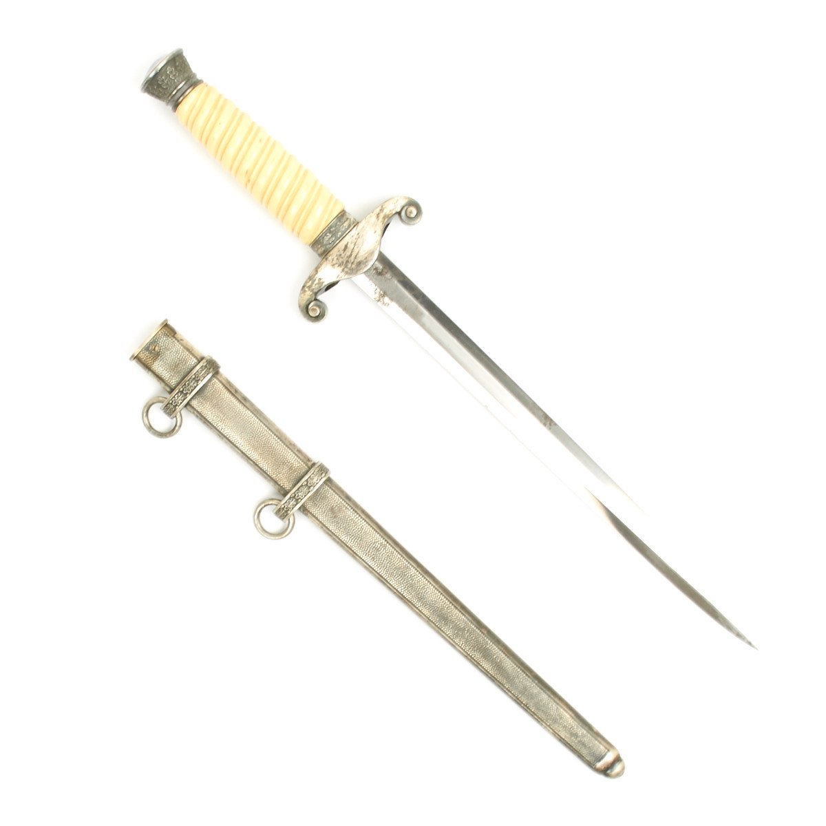 This dagger is equipped with one of the rarely seen simulated ivory grips which were introduced by Höller. This grip has a beautiful ivory tone throughout, and if you look closely at the ribs you will see a simulated grain running through them, more prominent on the reverse than it is on the obverse. We don't see this much, but it is a most attractive and desirable variation. These grips were still the late plaster filled type, but that is the way things were done after the war started.