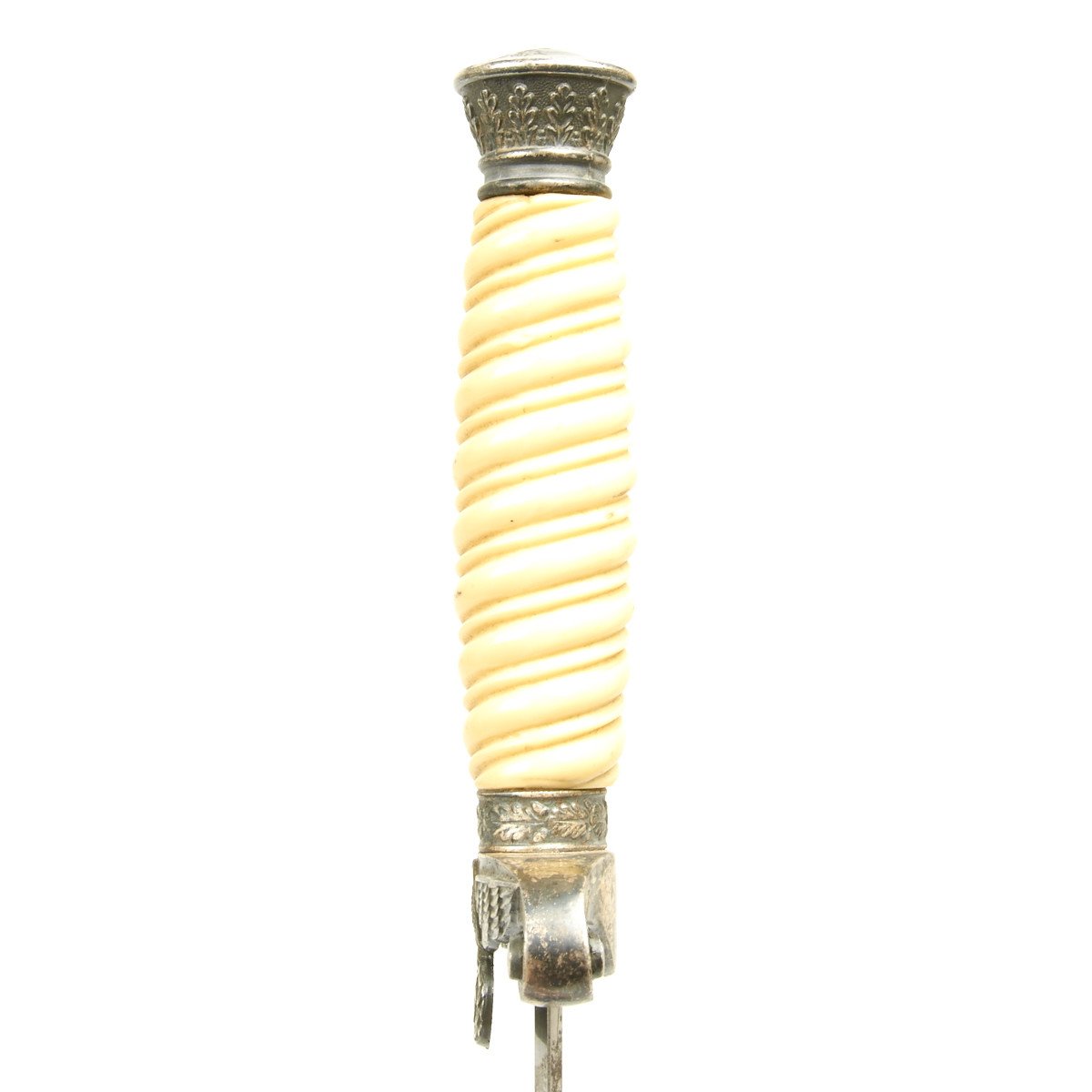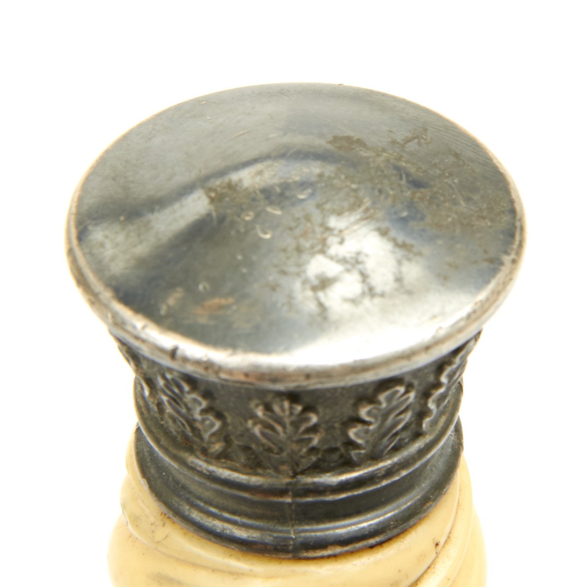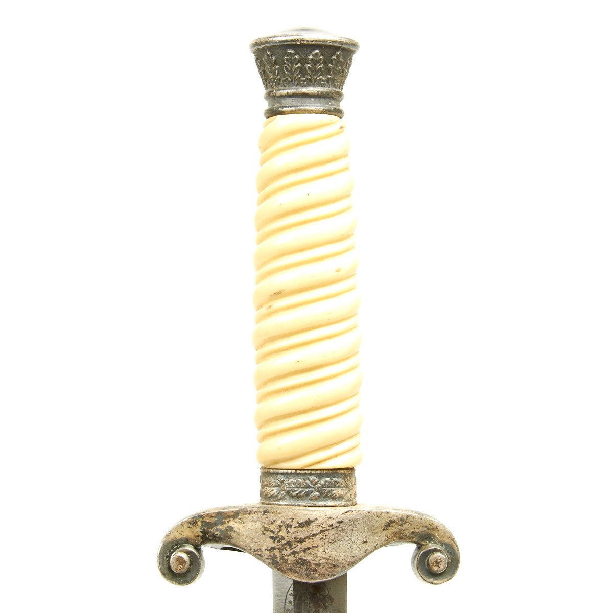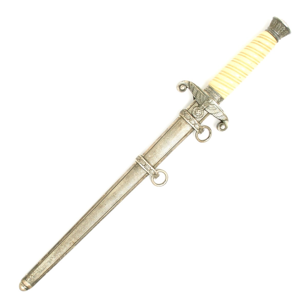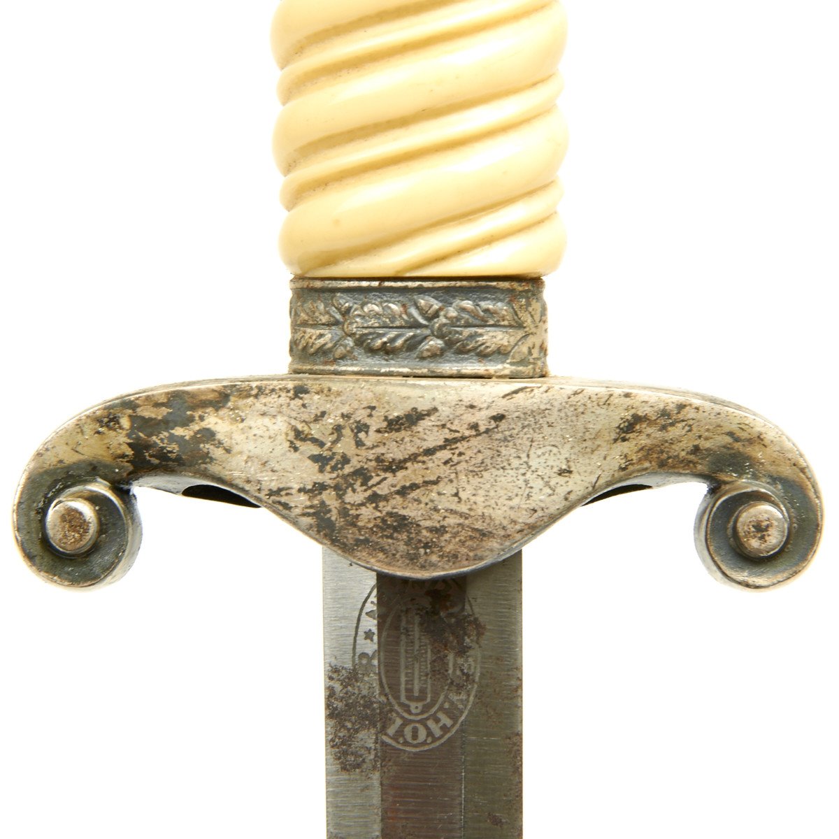 This dagger is equipped with one of the rarely seen simulated ivory grips which were introduced by Höller. This grip has a beautiful ivory tone throughout, and if you look closely at the ribs you will see a simulated grain running through them, more prominent on the reverse than it is on the obverse. We don't see this much, but it is a most attractive and desirable variation. These grips were still the late plaster filled type, but that is the way things were done after the war started.