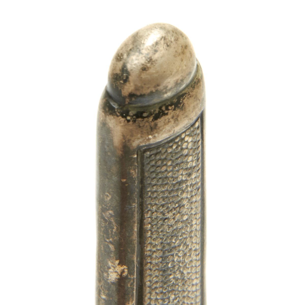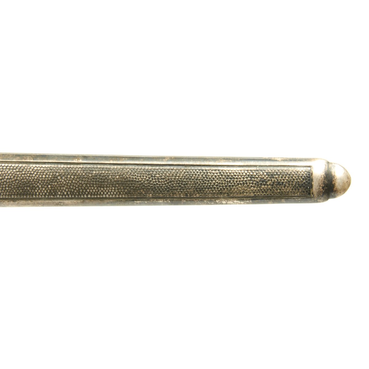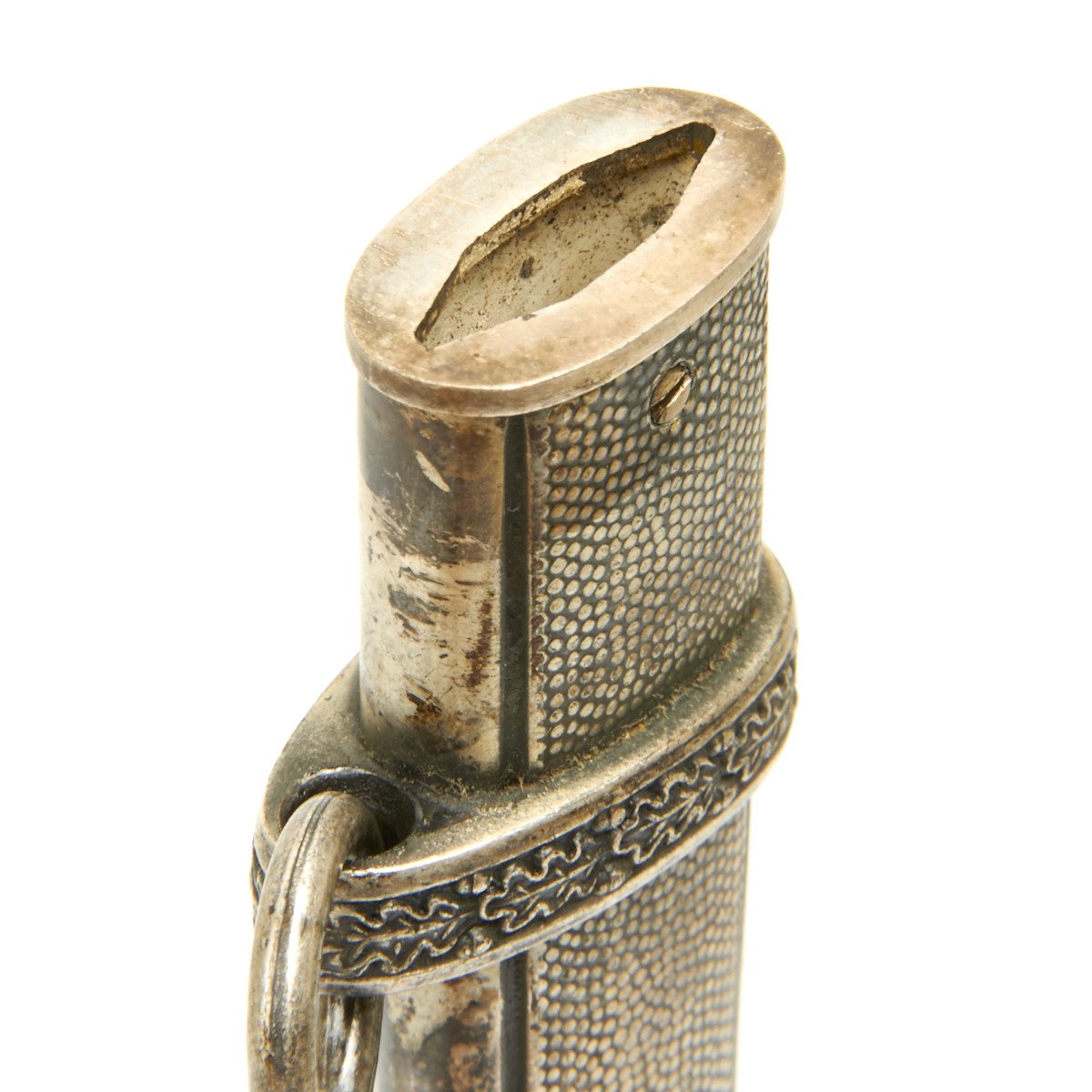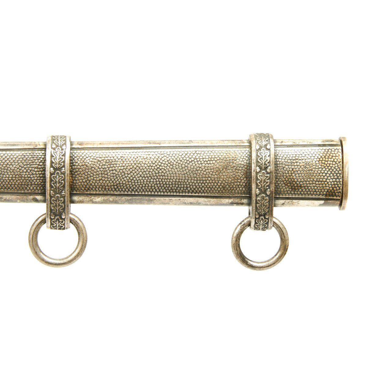 The scabbard is also a beauty, exactly matching the patination and frosted finish traces of the hilt mounts. Höller frequently used the generic scabbard with their product. This scabbard is wonderful, with finely pebbled panels. The carrying bands feature a decoration of raised oak leaves separated by parallel acorns. The throat is a thinner type, retained by a single headless screw in the reverse center. A choice scabbard here!