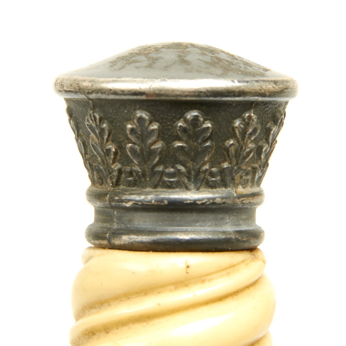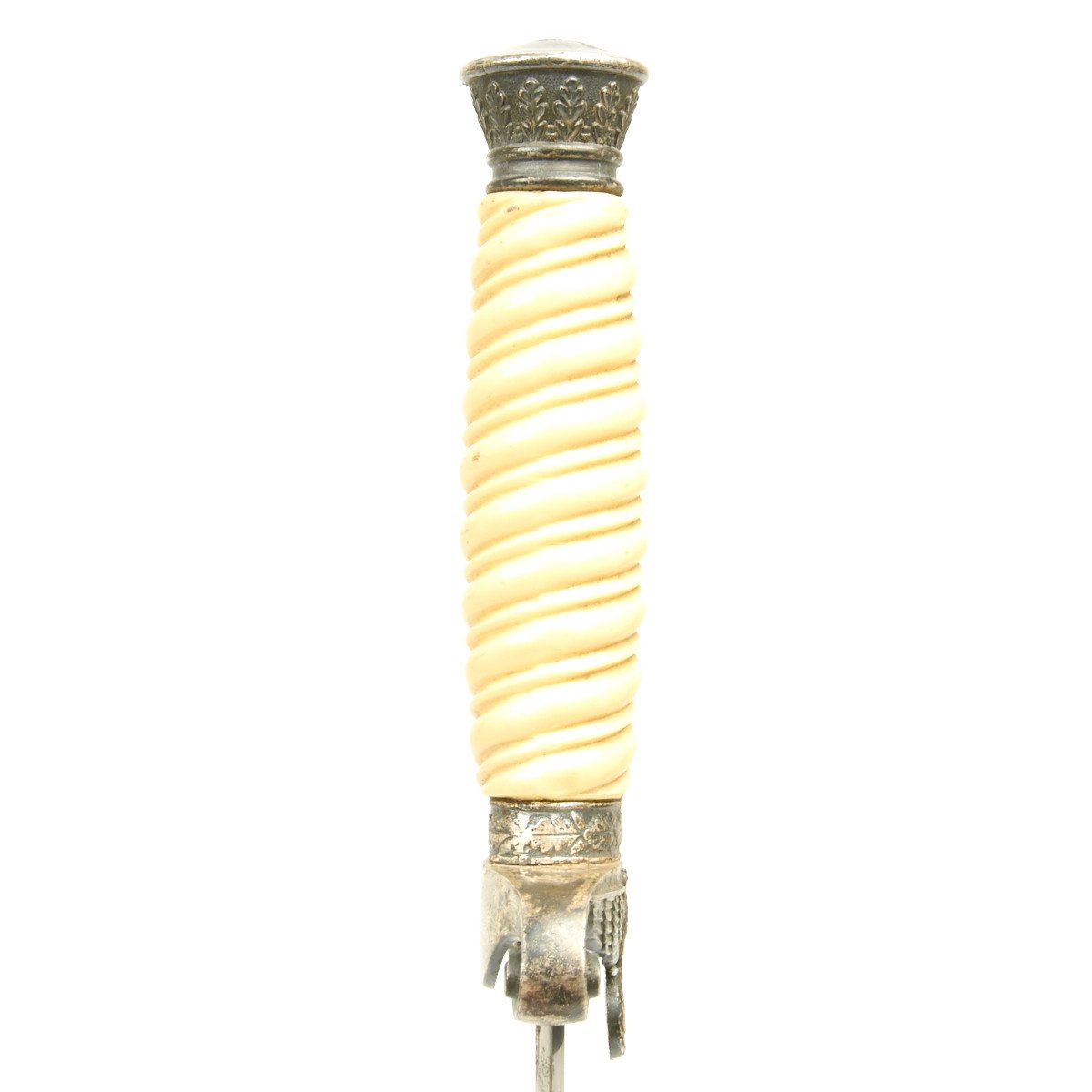 The pommel is in totally perfect condition, having a nice black patination with frosting signs evident around the upper area. The pommel features twelve raised oak leaves separated by acorns. The detail is excellent throughout.
