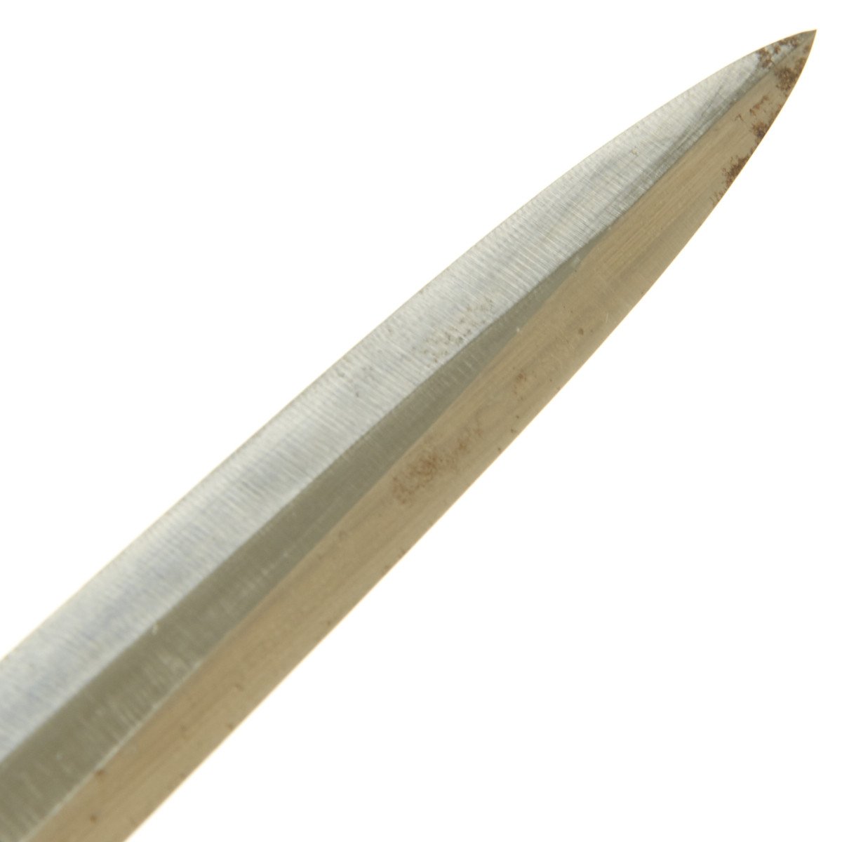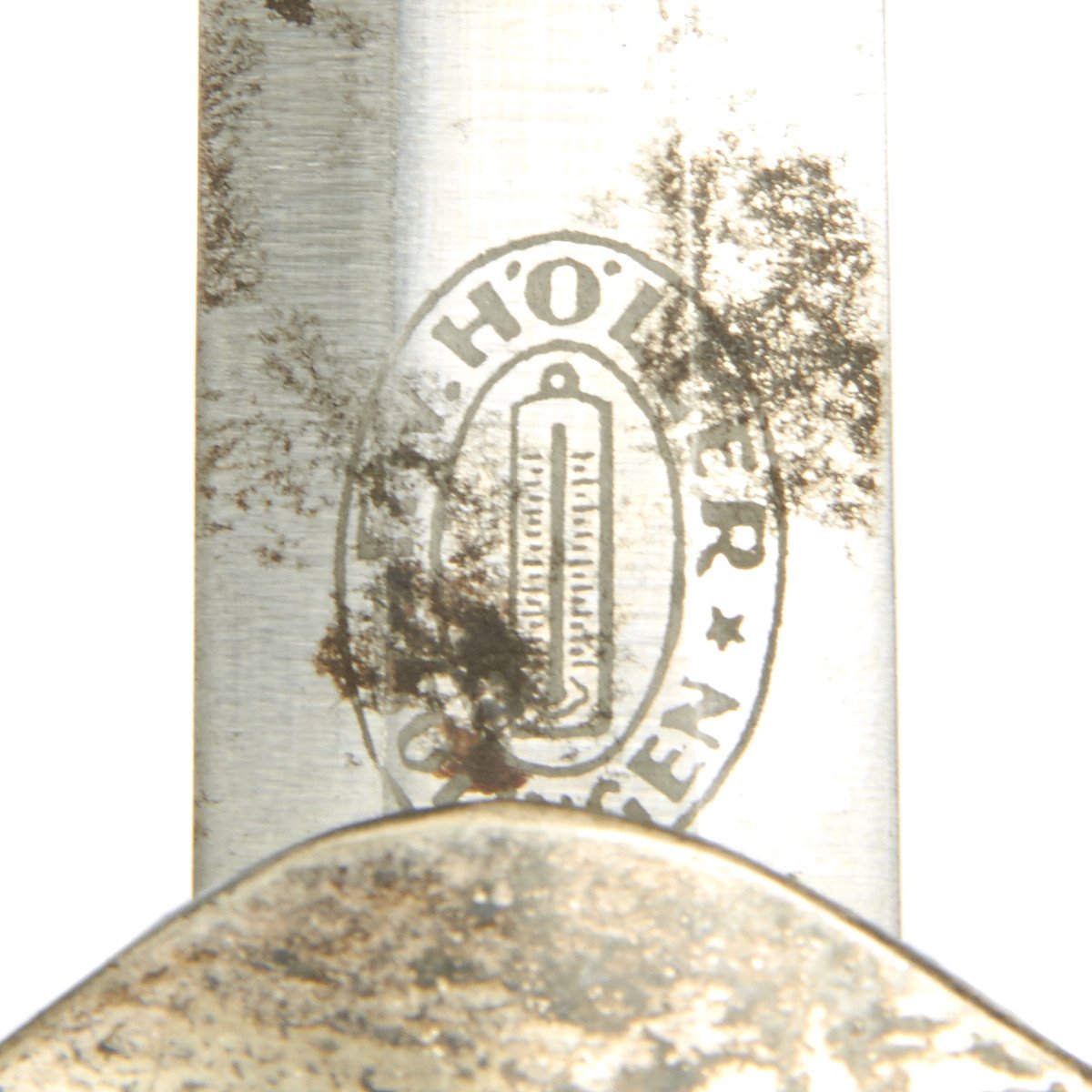 The blade of this dagger is in very nice condition. This blade is mirror-bright, having 80% grain and a needle-like tip with a few pathces of minor surface rust. The reverse ricasso is darkly etched with the familiar double ovals of the Höller firm, as well as the thermometer logo, having too many digits to ever count. The small style leather blade buffer is in place.