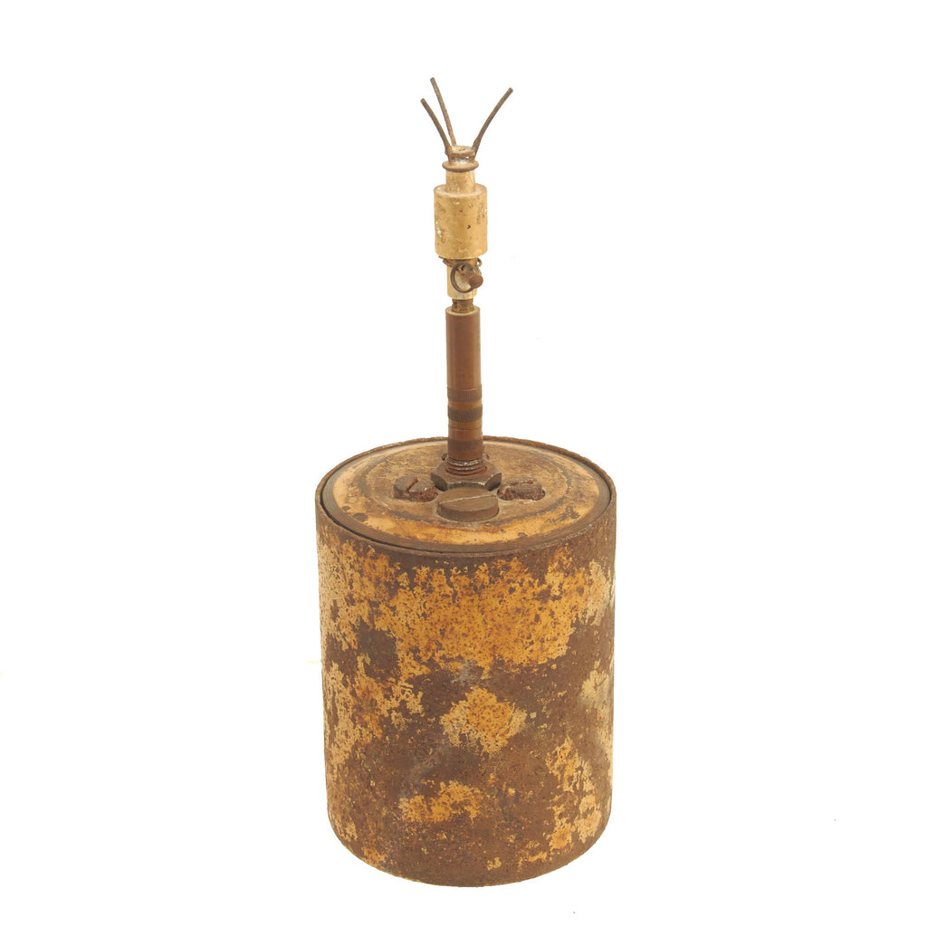Original Item: Only One Available. This is an incredible, totally inert, BATF compliant original German WWII SMi.-35 S-Mine, with one pressure activated fuse that was designed to resemble blades of grass. The space between the inner and outer housing is filled with shrapnel which we believe to be original to the device, giving it a nice weight to it.