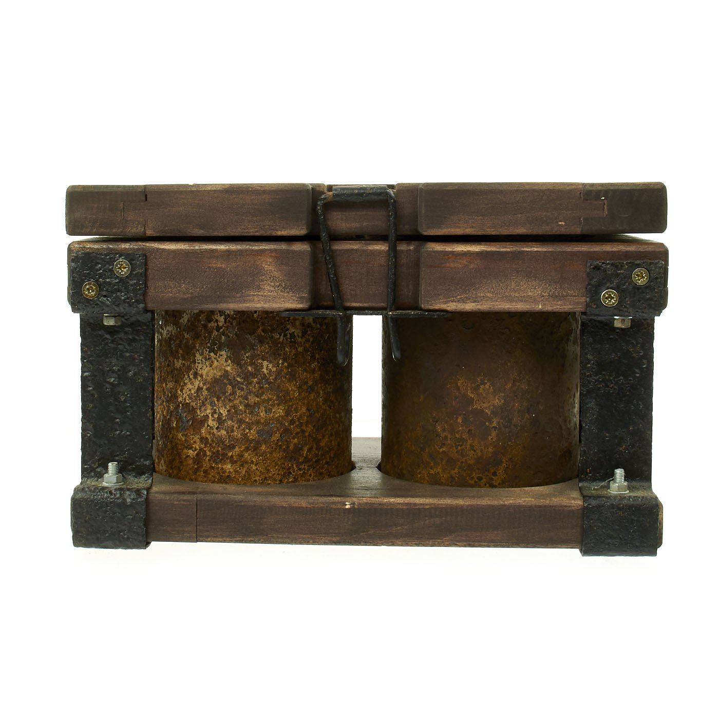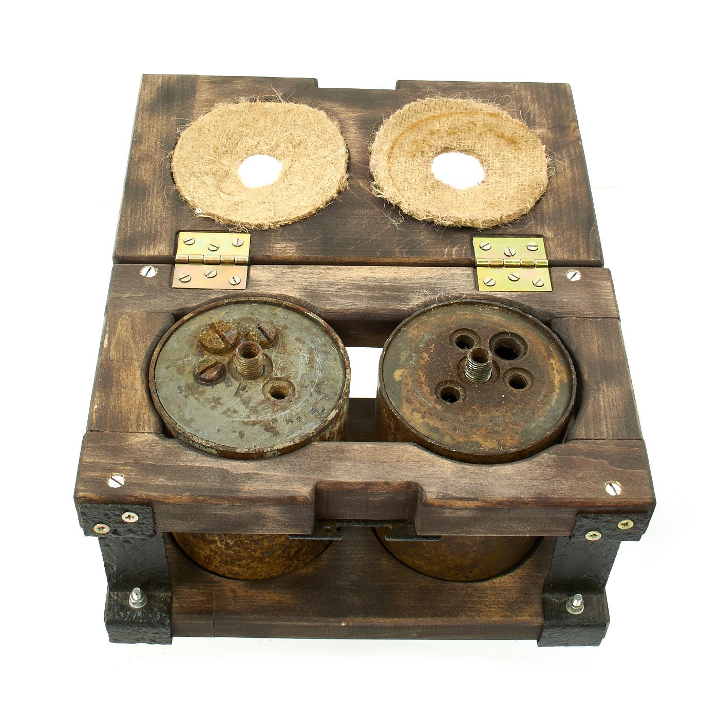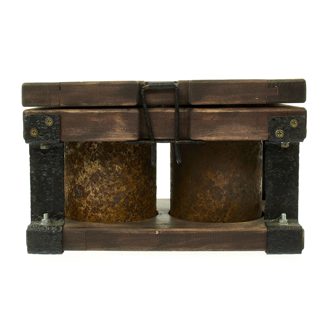 Original Item: Only One Set Available. Incredible inert set of two original German WWII S-Mines. Mines come with multiple fuses which are contained in an original bakelite fuze box. Both mines are contained in the original transit frame with locking claps. The metal frame is original WWII which has been restored and painted. The wood is newly added as is the black paint stenciling which is marked on the top SMi-35.