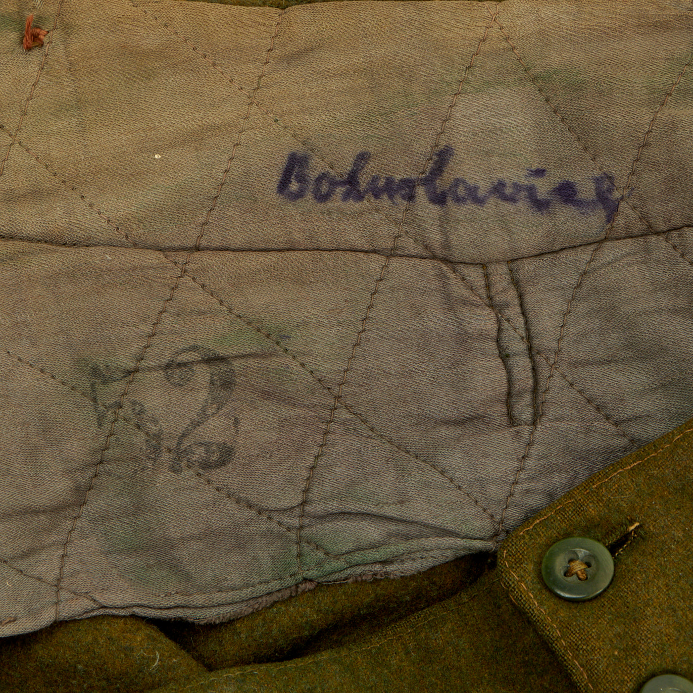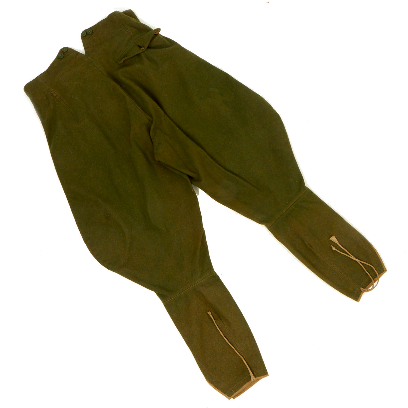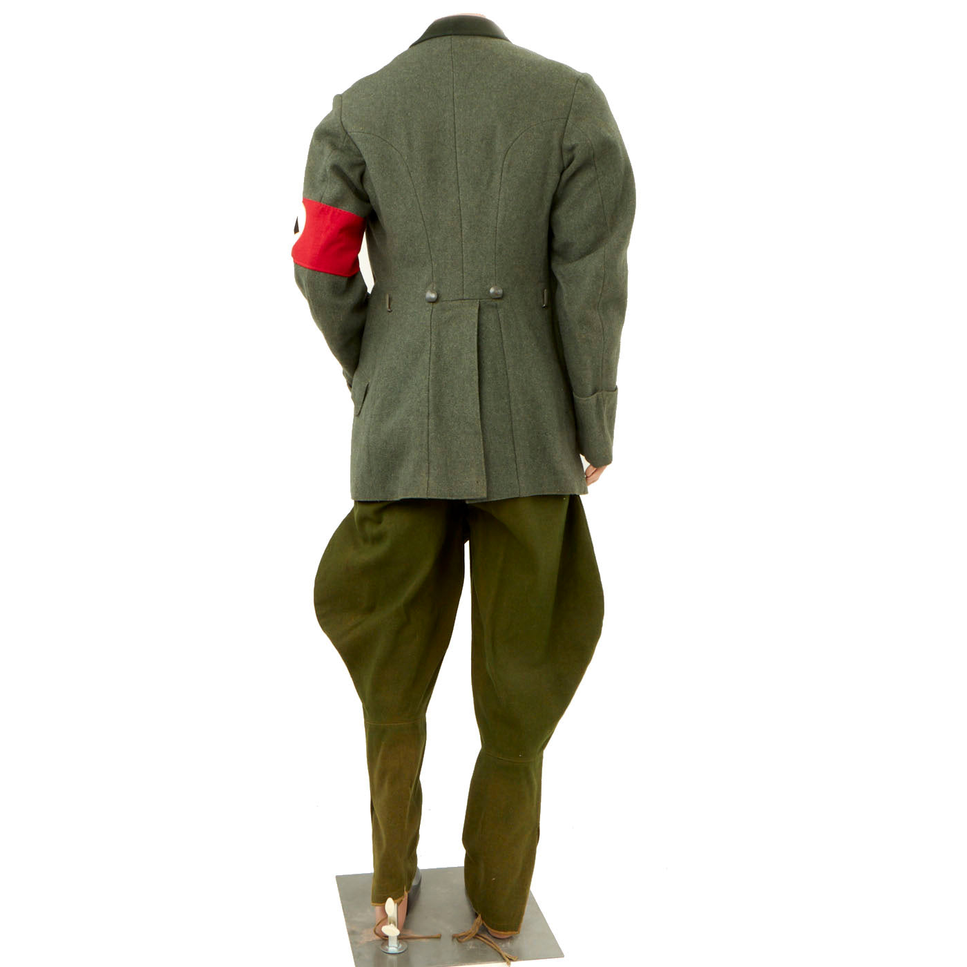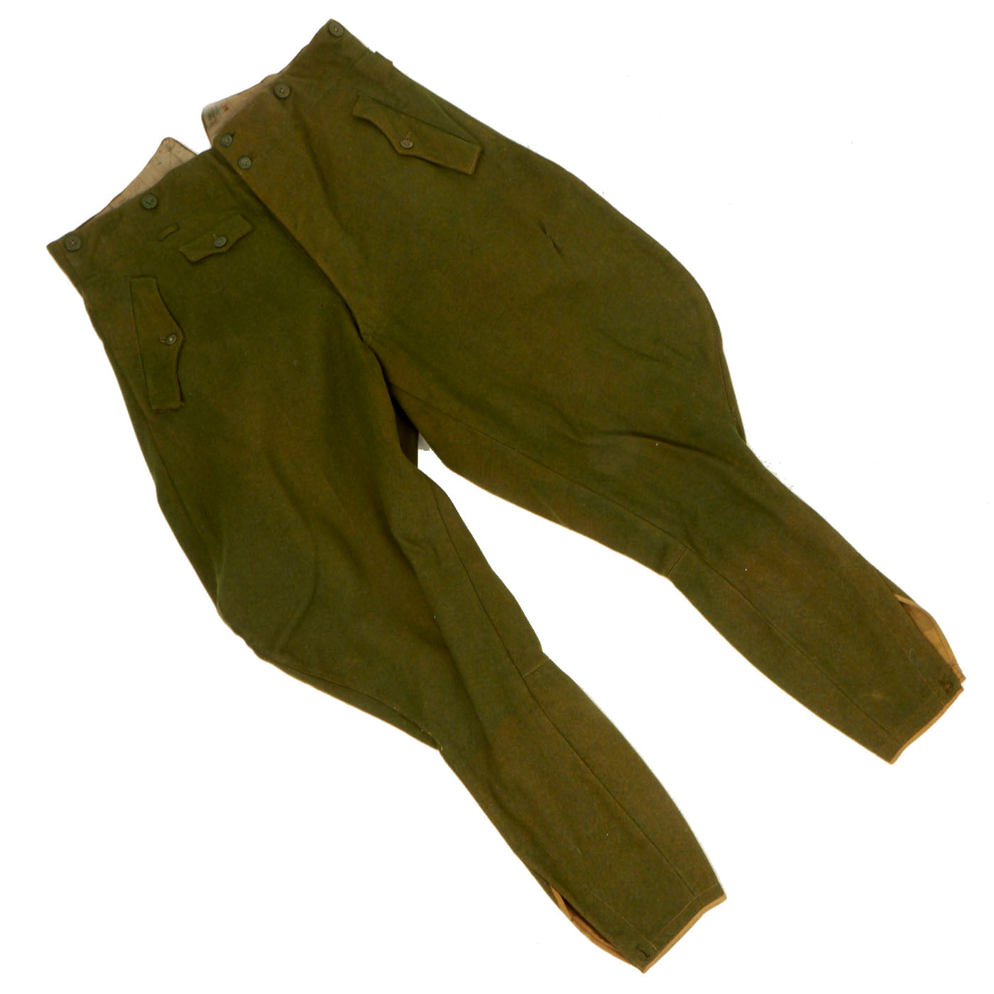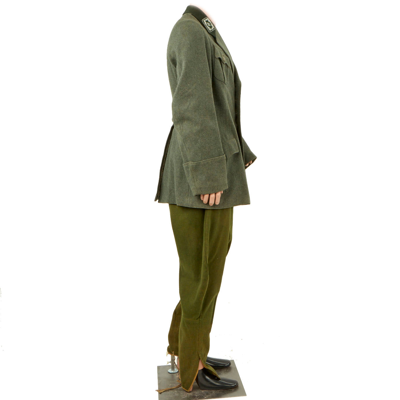 There is no damage to the tunic and it is in excellent shape. It also comes with straight-leg wool trousers. These trousers are also in a good shape with no visible damage to it. There is a name written on the waistband but we can’t make it out. The size of the trousers are stamped 52.