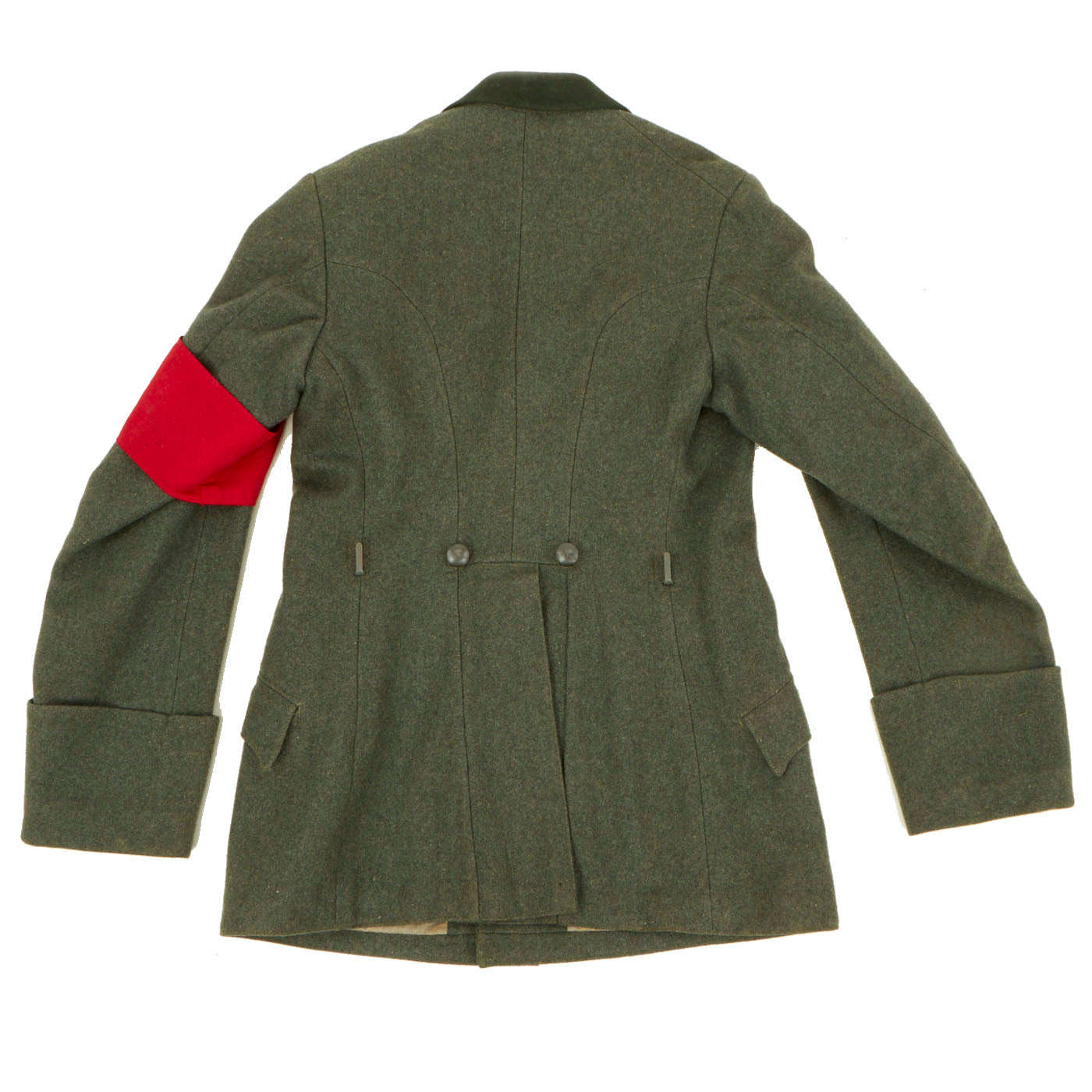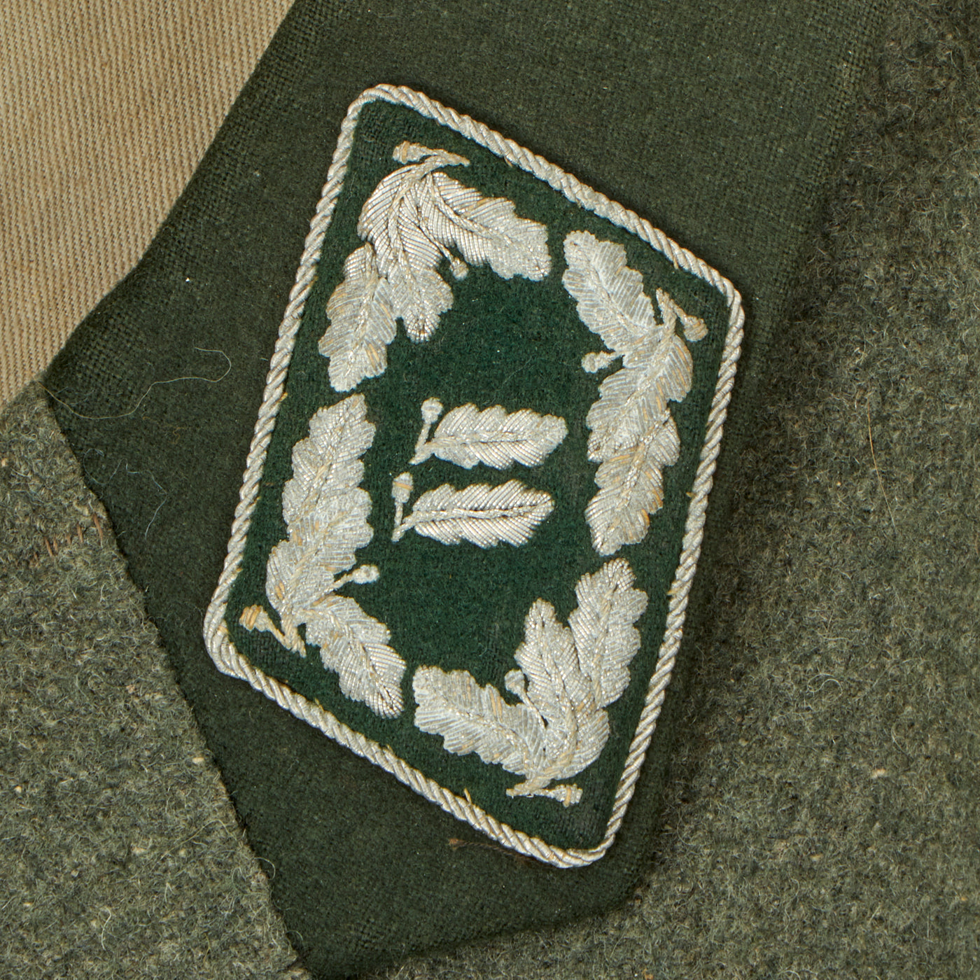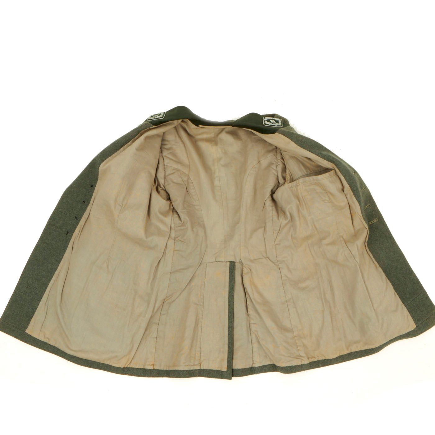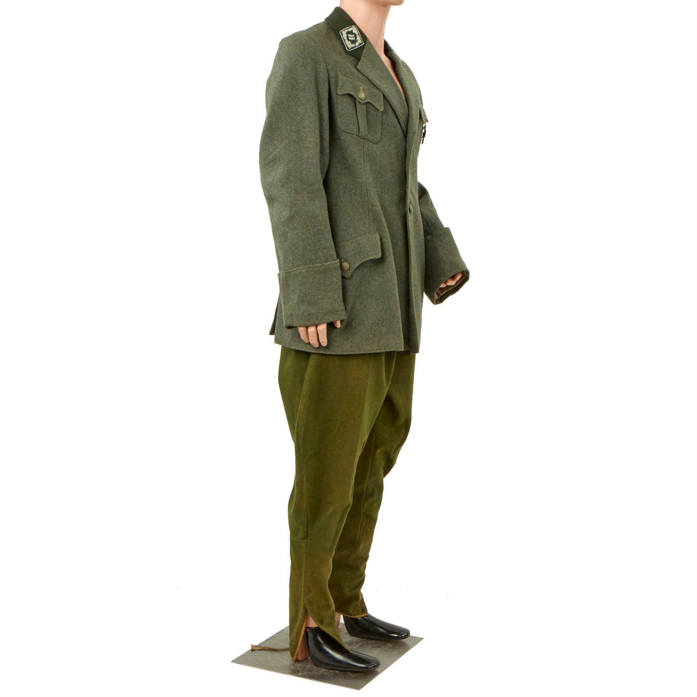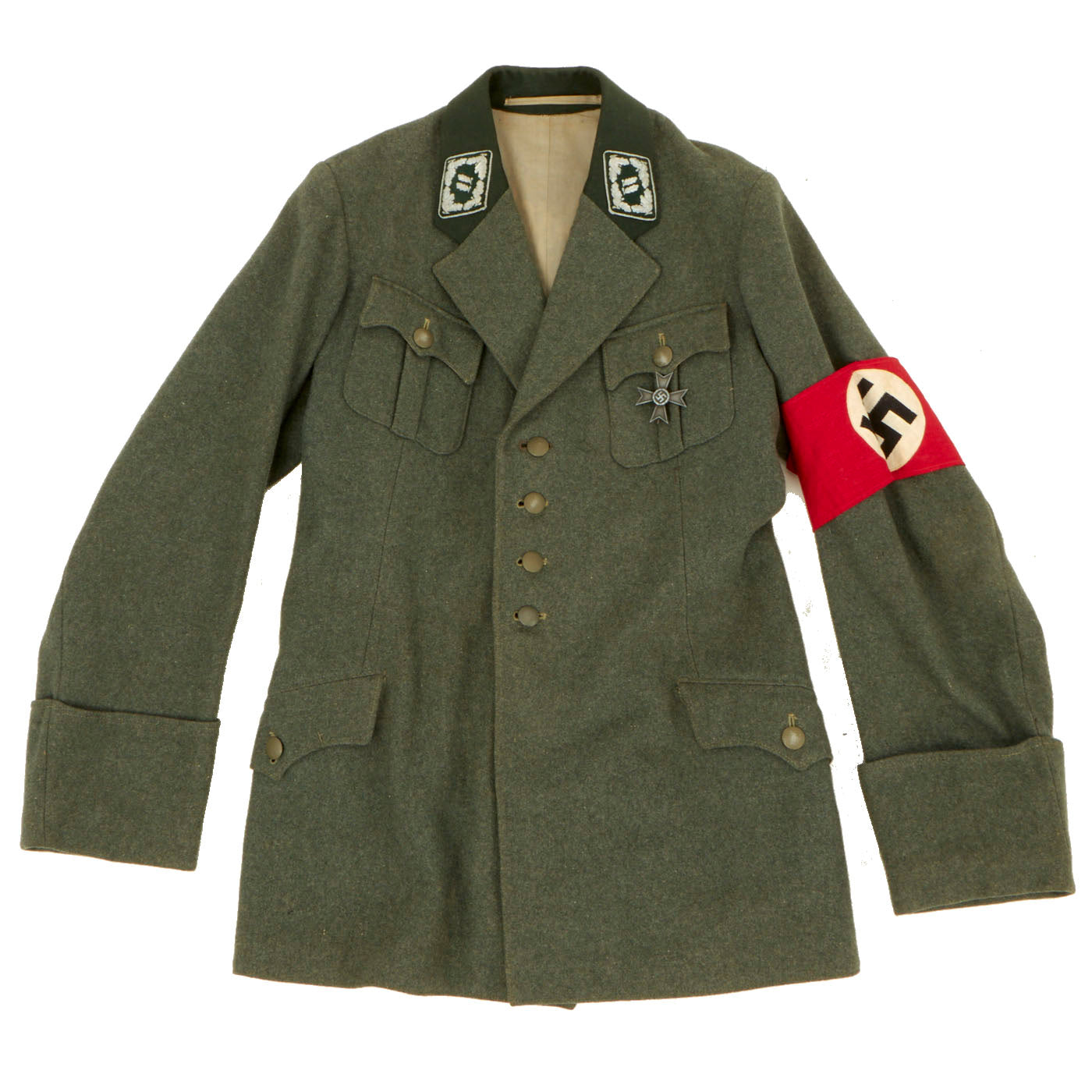 Original Item: Only one Available. This is an original WW2 uniform for German Forestry officers during WWII. The tunic has a velvet green collar with silver twist cord piping and is made of fine quality green wool. The tabs are Velvet green with silver twist cord piping and silver bullion wire weave for the leaves and acorn on the collar. The silver bullion shows that the rank of this officer was Oberforstmeister. This loosely translates as senior forestry officer and is a high-ranking position. The tunic features a War Merit Cross 1st Class without swords on the left breast pocket and an original 2 piece constructed NSDAP armband with the Swas stitched onto the white circle. The tunic collar is the standard velvet green. All of the silver pebbled buttons are the same and retain their original finish. Rather than the usual medal loops, there are two sewn holes for two medals on the pocket.