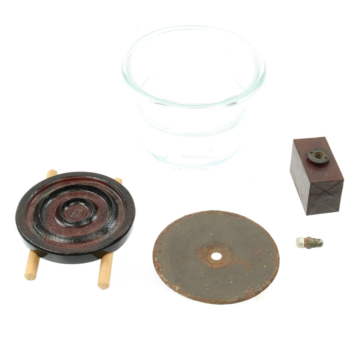 - Brown glass pressure plate marked 40 with reproduction wooden spacers.