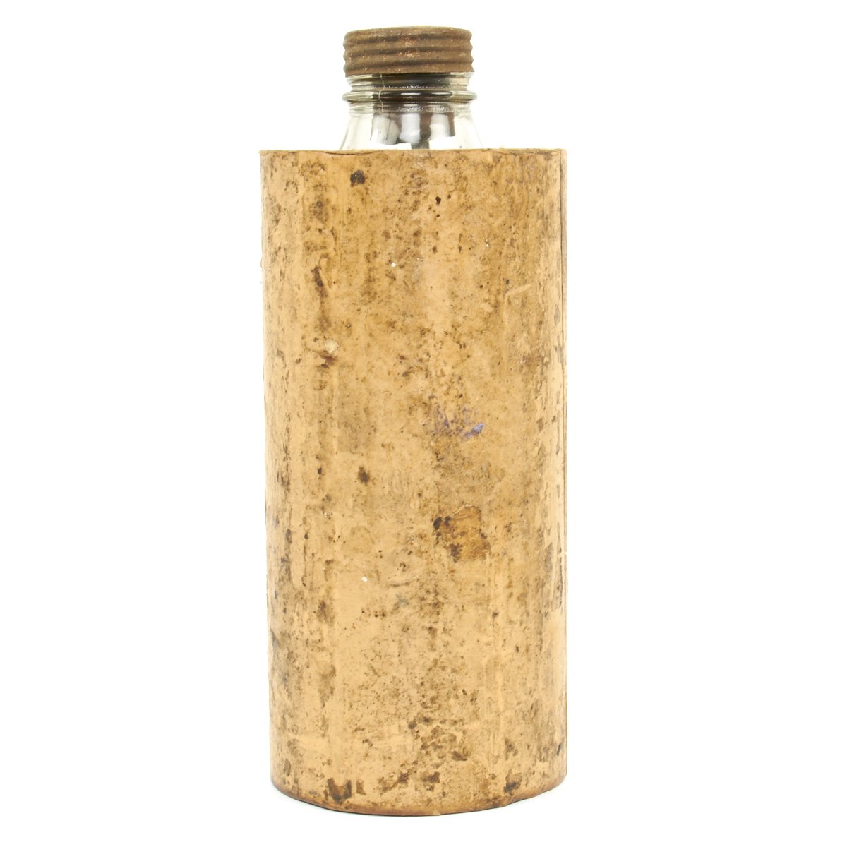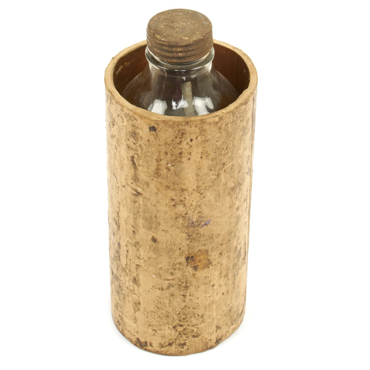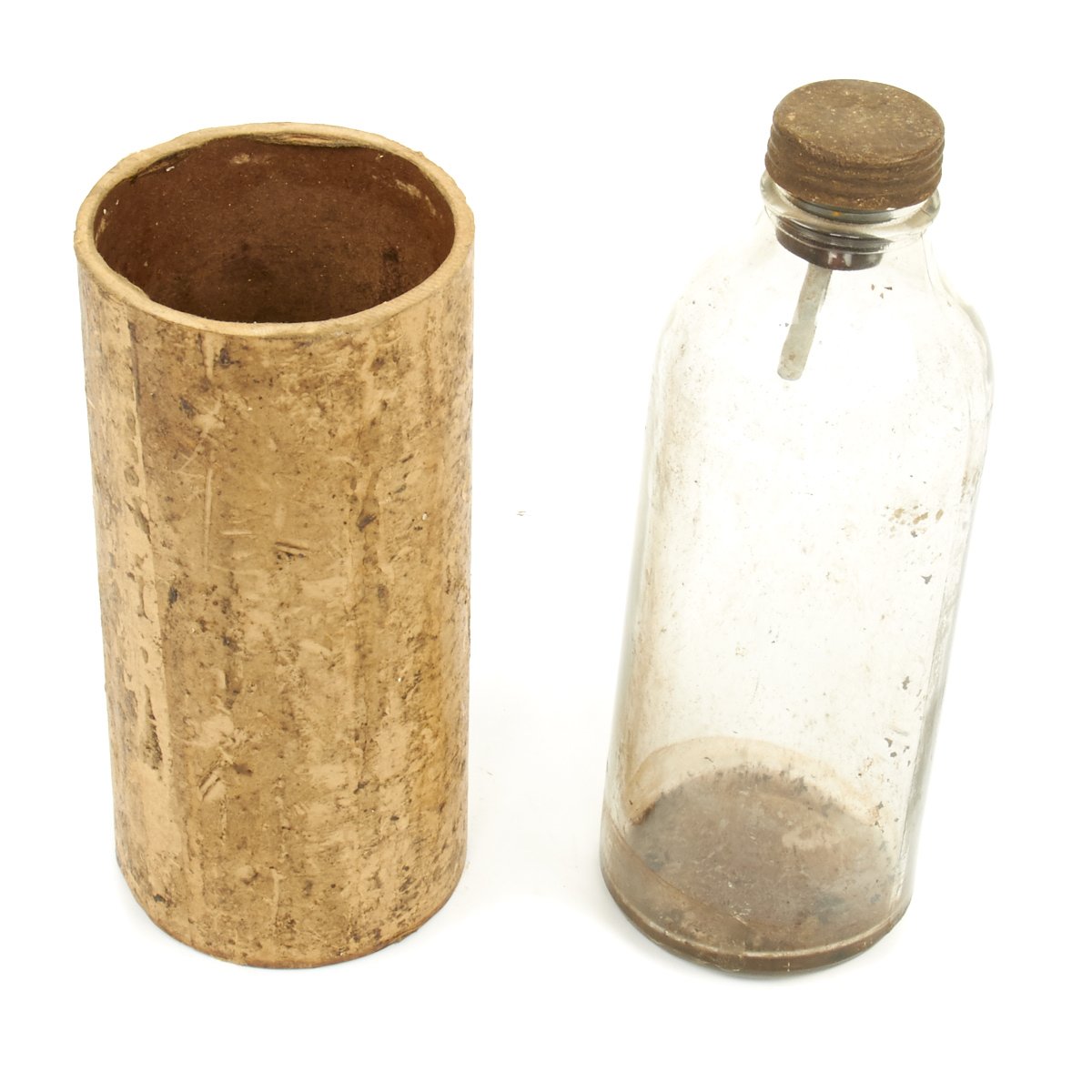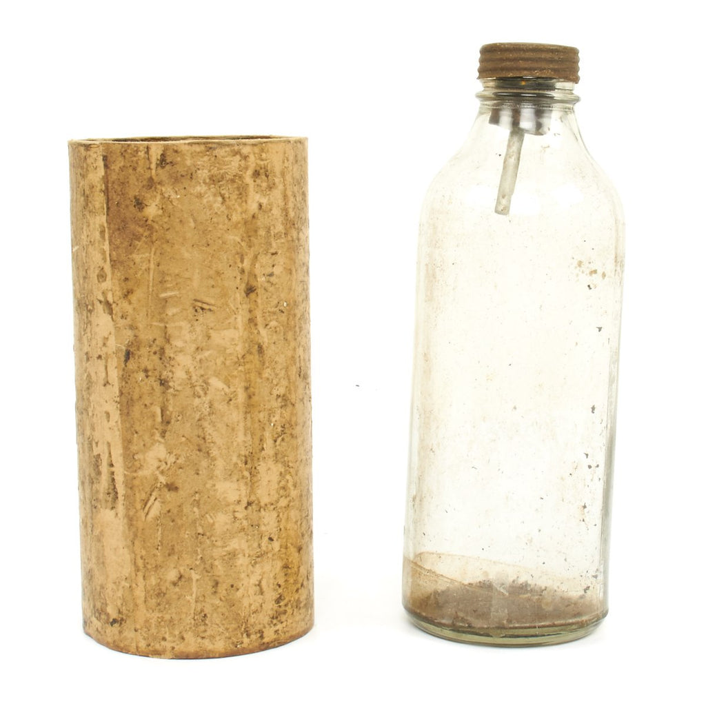Original Item: Only One Available. These are so rare that we've never actually seen another example. This is a purpose built glass bottle with stopper and removable fuse all contained in the original waxed cardboard transit tube. There are no visible markings which would typically be on the screw cap but due to age and wear the markings are not visible. Most theorize that these were very late war production for the Volkssturm and were based off blood transfusion bottles but these were made with only one central hole for the fuse as opposed to two openings. The bottle measures 10 inches tall with a 4 inc diameter.