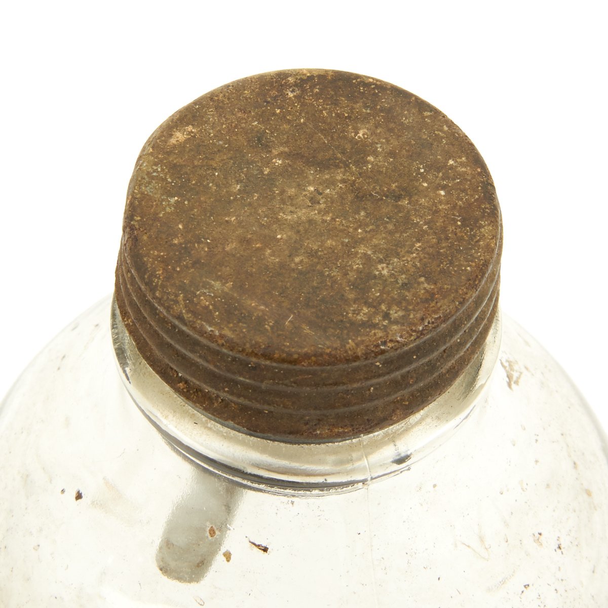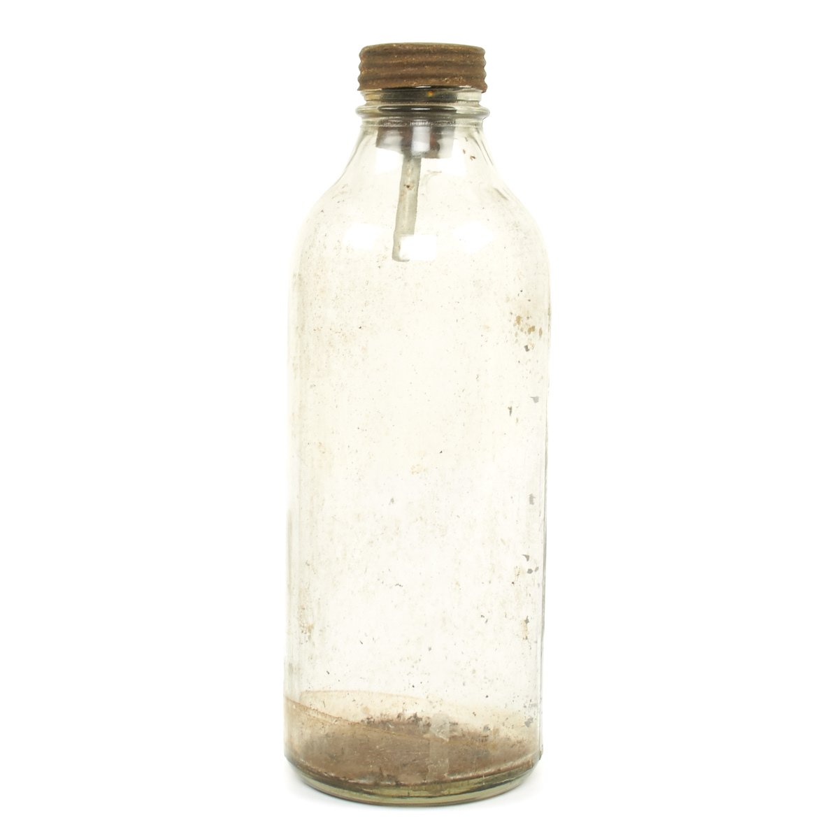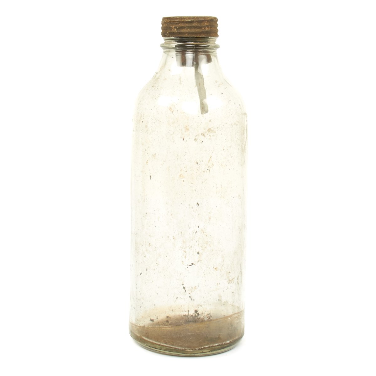 Original Item: Only One Available. These are so rare that we've never actually seen another example. This is a purpose built glass bottle with stopper and removable fuse all contained in the original waxed cardboard transit tube. There are no visible markings which would typically be on the screw cap but due to age and wear the markings are not visible. Most theorize that these were very late war production for the Volkssturm and were based off blood transfusion bottles but these were made with only one central hole for the fuse as opposed to two openings. The bottle measures 10 inches tall with a 4 inc diameter.