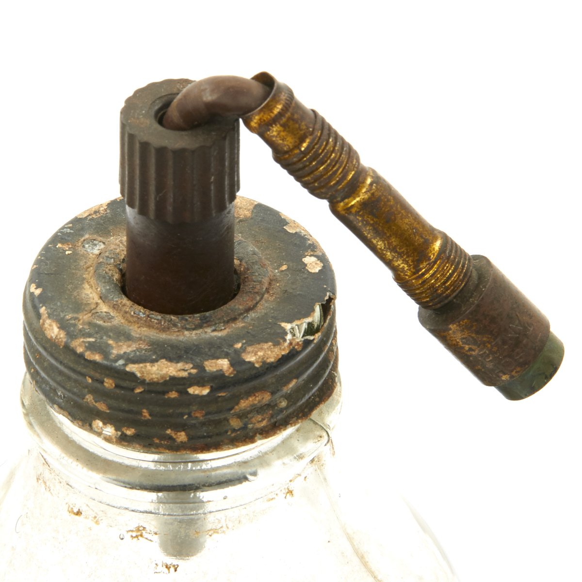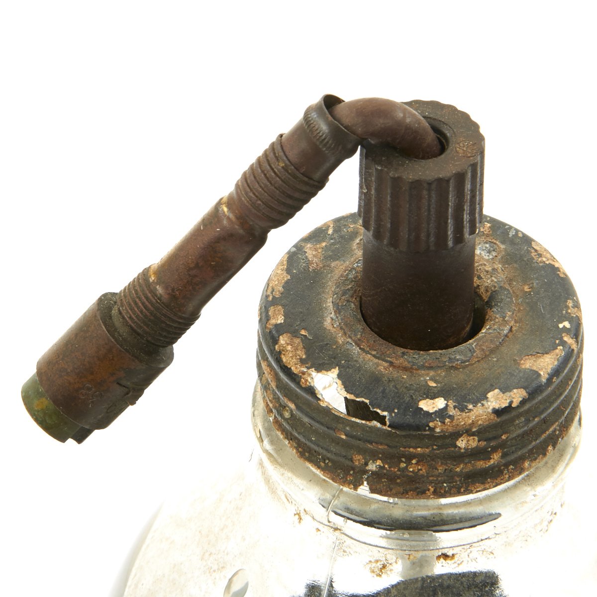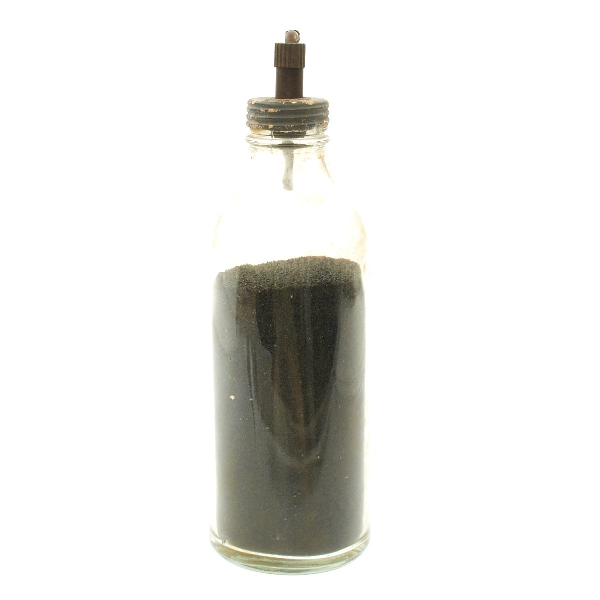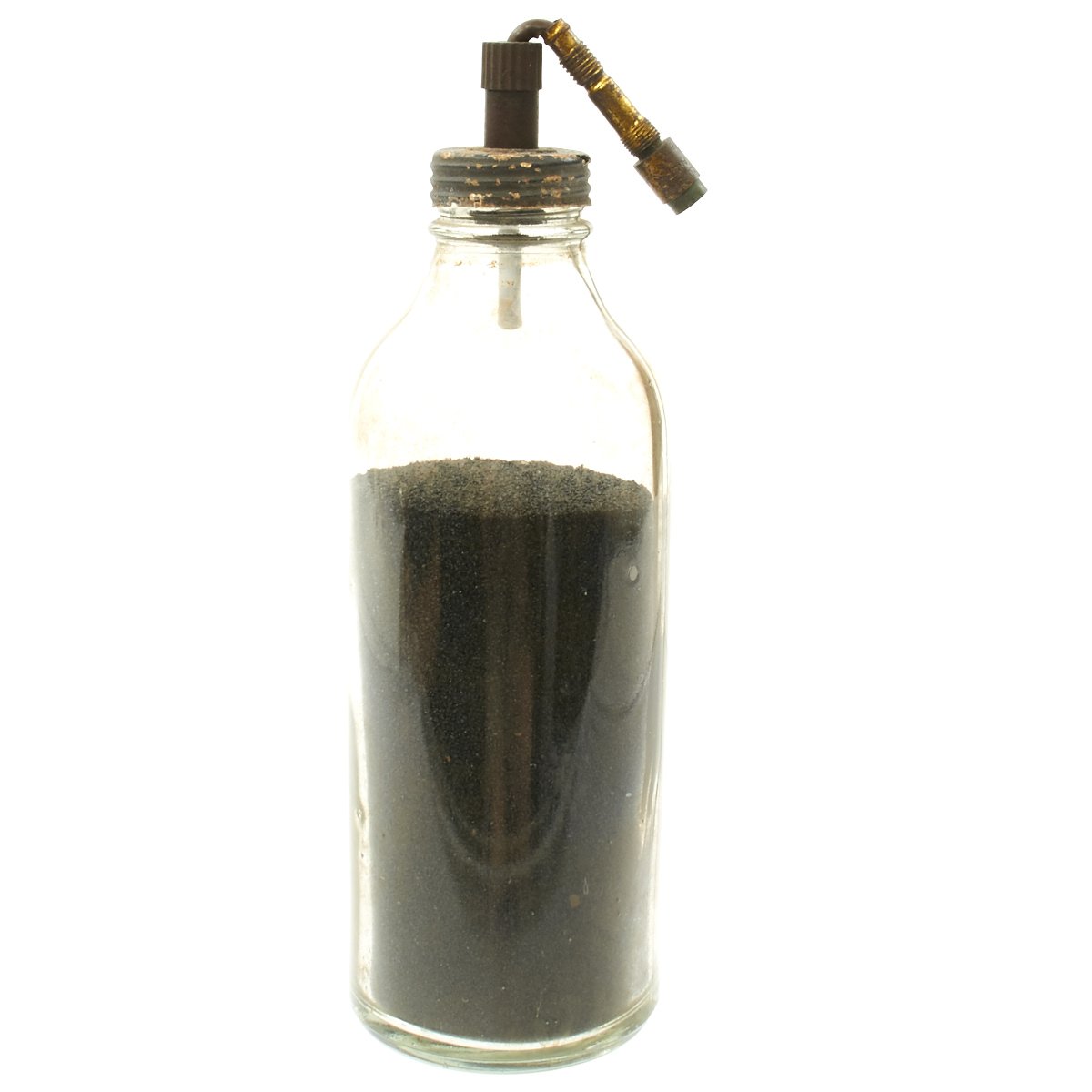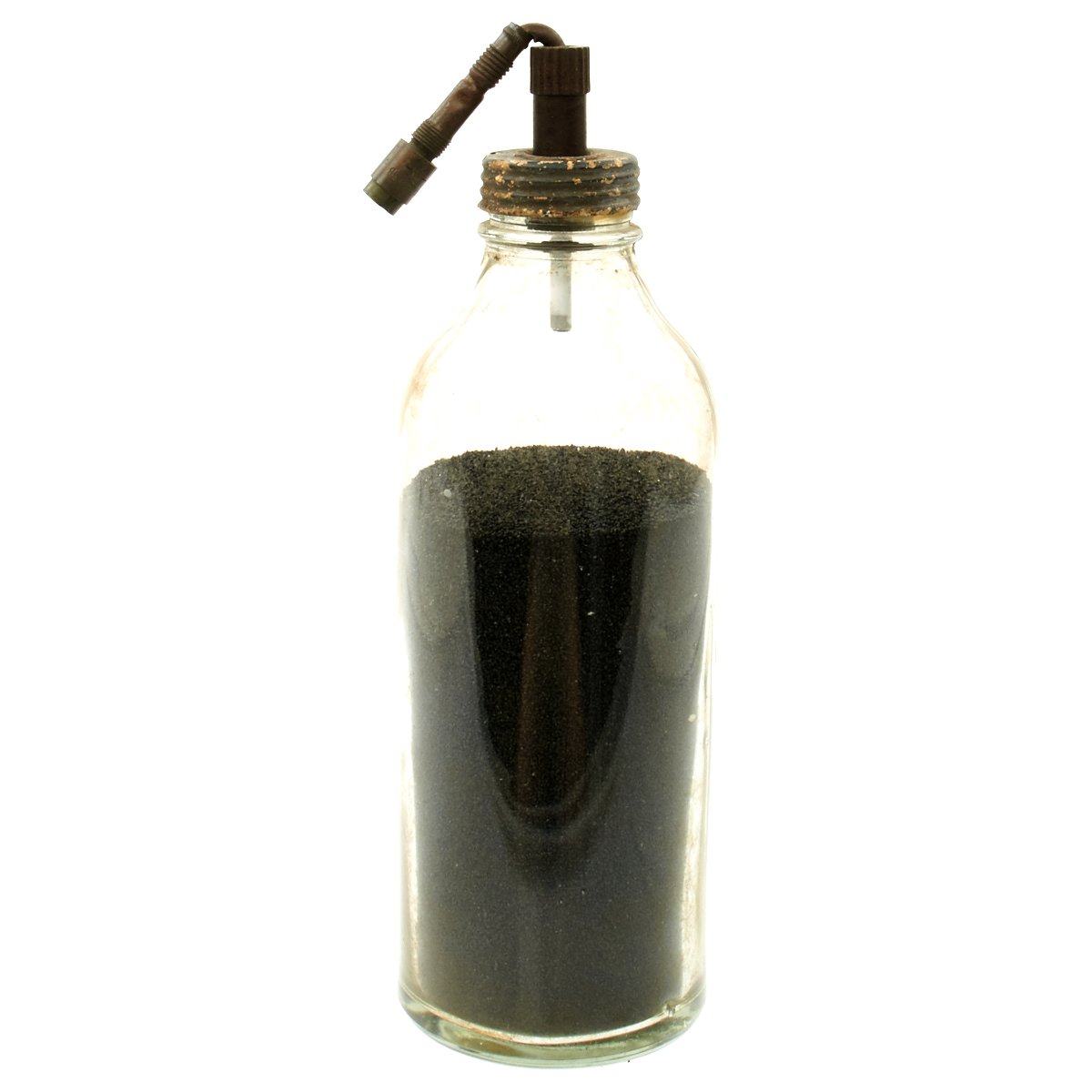 Original Item: Only One Available. These are so rare that we've only seen one other example. This is a purpose built glass bottle with stopper and removable fuse. There are no visible markings which would typically be on the screw cap but due to age and wear the markings are not visible. Most theorize that these were very late war production for the Volkssturm and were based off blood transfusion bottles but these were made with only one central hole for the fuse as opposed to two openings. The bottle measures 10 inches tall with a 4 inch diameter. Its been filled with black sand for display purposes.
