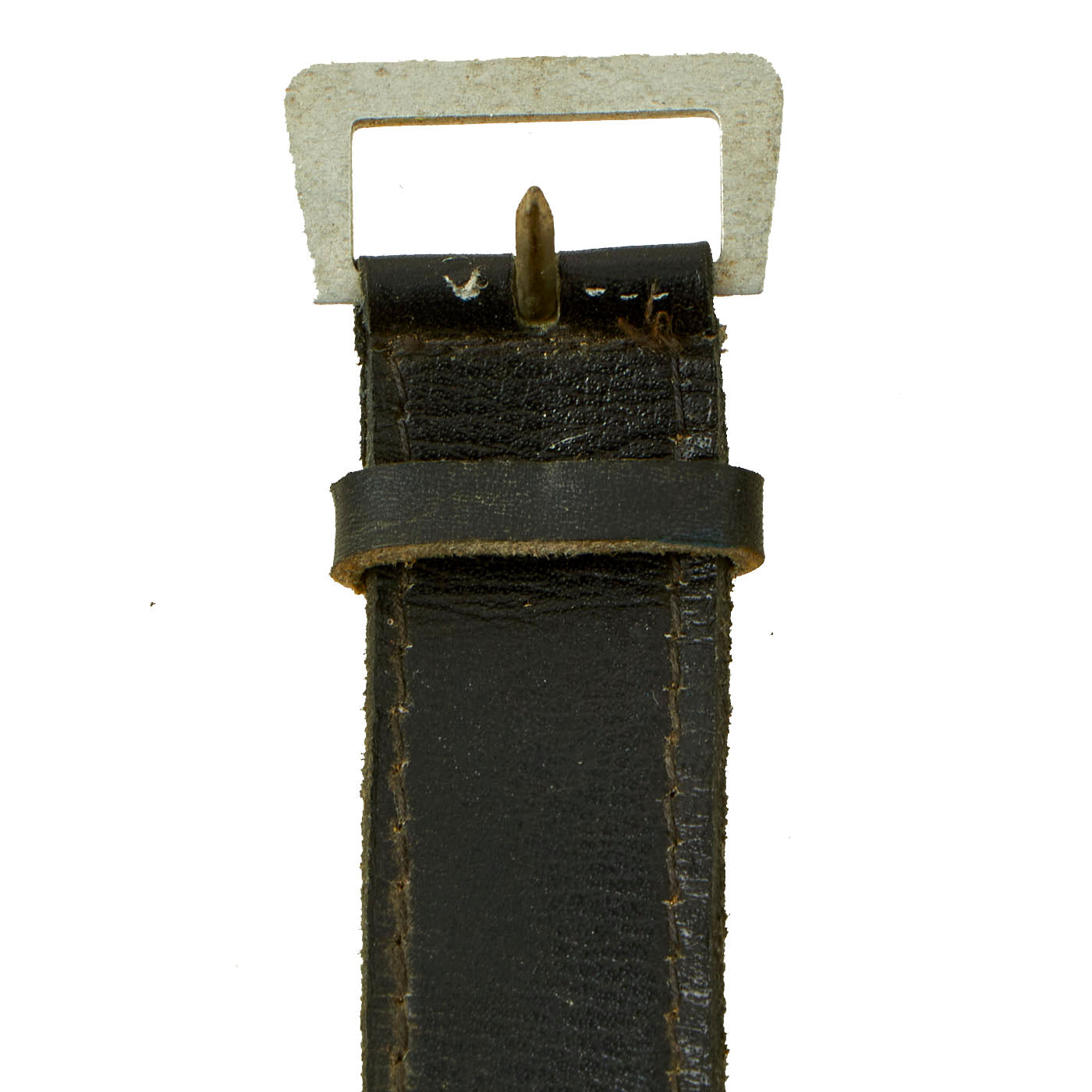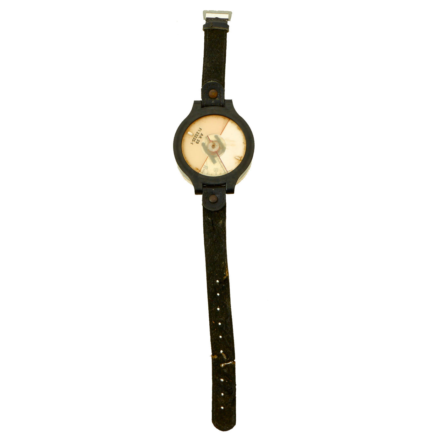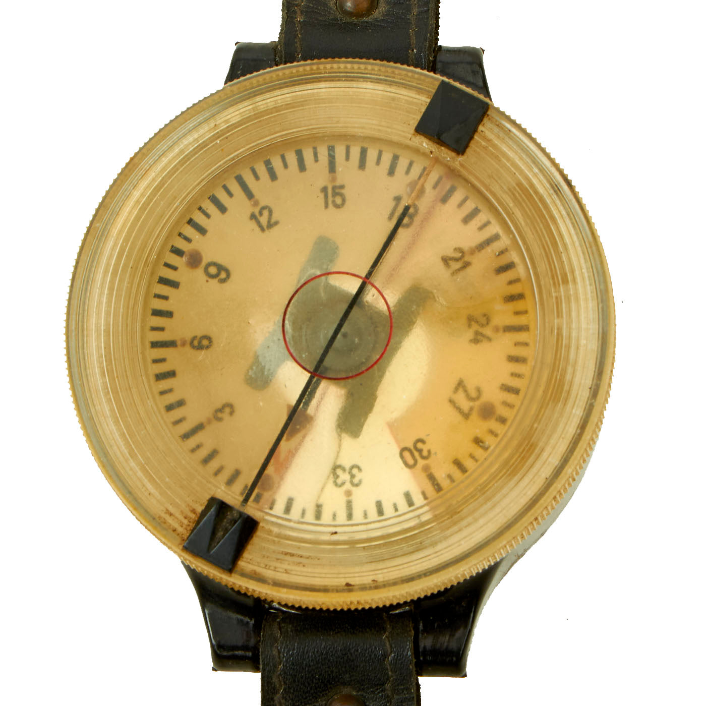 This model allowed the setting of a course by means of two white rotating semi-circular sheets located at the underside. Moreover, rifle-type sighting aids allowed the taking of a bearing (on the ground if downed). Red sighting aids date the compass to the 1942-1944 period of the war. Offered in good condition with a slightly torn arm band.