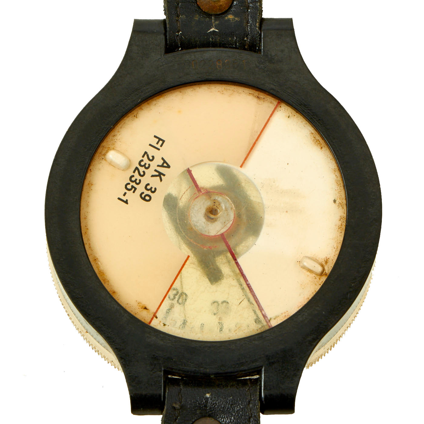 Original Item: Only One Available. This is a lovely, service worn wrist compass that was utilized by German pilots during WWII. Made by Kadlec in Czechoslovakia and introduced as AK-39 Armband-Kompass 1939 (wrist compass) to the Luftwaffe. The Luftwaffe register number is Fl 23235-1 with Fl standing for Fliegermaterial i.e. aeronautical materiel. The diameter is 60 mm. The liquid inside is present and pure petroleum (kerosene), which can be exchanged or refilled during inspection.