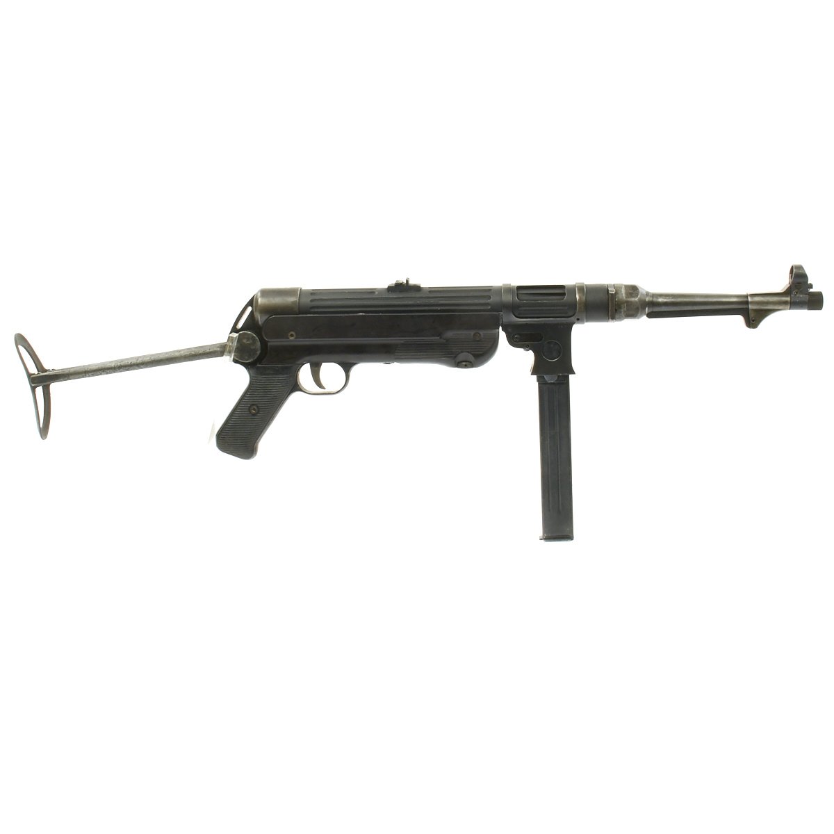 Both MP-38 and MP-40 submachine guns are blowback operated weapons that fired from open bolt. Both weapons were full-automatic only, but relatively slow rate of fire permitted for single shots with short trigger pulls. The proprietary bolt system with telescoped return spring guide served as a pneumatic recoil buffer, helping to decrease rate of fire to a very manageable level. The bolt handle was permanently attached to the bolt on early MP-38's; on late production MP-38's and MP-40's bolt handle was made as a separate part and also served as a safety- pushing the head of bolt handle inward locked the bolt either in cocked or forward position. Lack of such feature on early MP-38's resulted in field expedients such as leather harnesses with small loop, used to hold the bolt in forward position. One unusual feature on most MP-38 and MP-40 submachine guns was an aluminum or plastic rail under the barrel, which served as a barrel support /protector when firing over the board of armored personnel carrier. The short handguard was made from plastic and was located between magazine housing and pistol grip; barrel lacked any heat insulation, which often caused burns for supporting hand. Folding shoulder stock resulted for compact weapon when folded, but it was insufficiently durable for combat use and hand-to-hand combat. Single-feed, double-row box magazine was another weak point of the design; it was hard to load without additional help, and often caused jams.