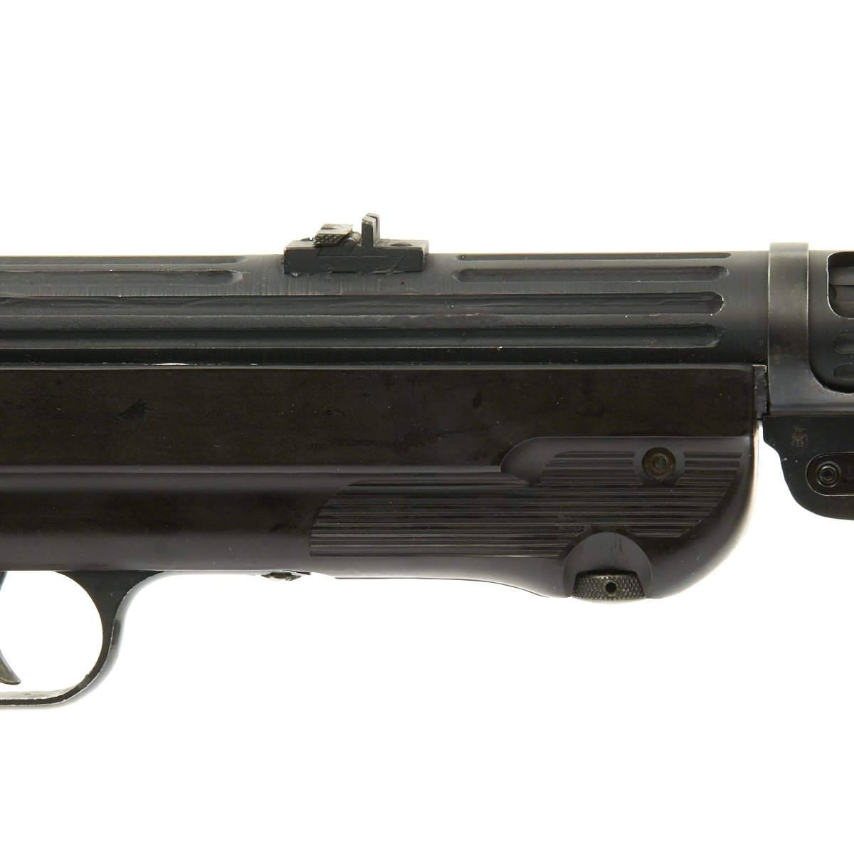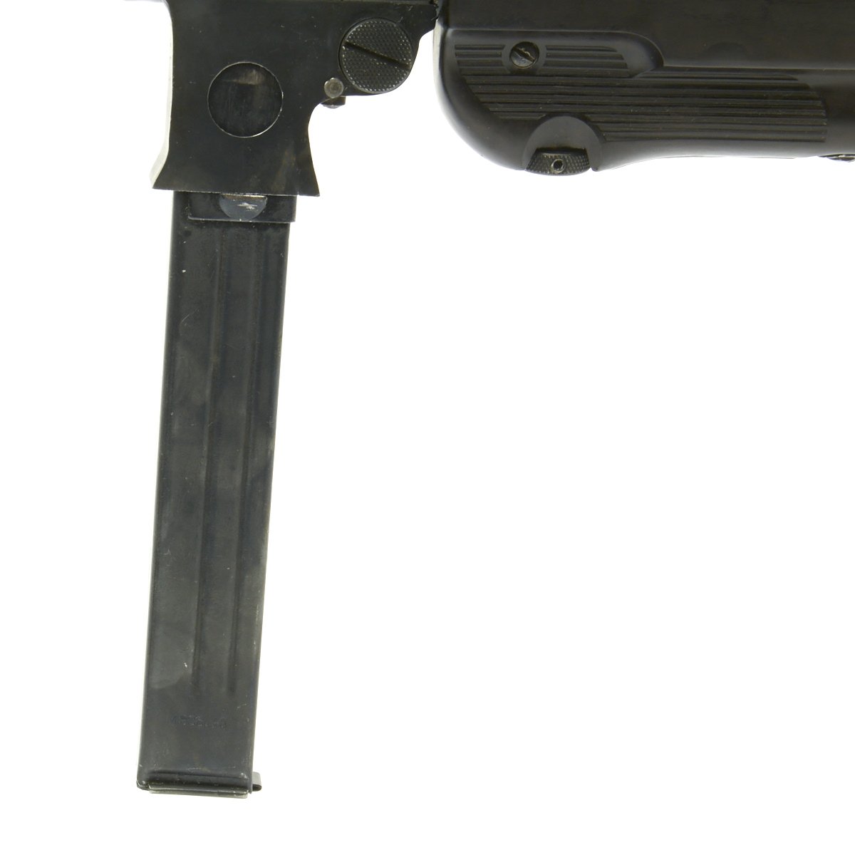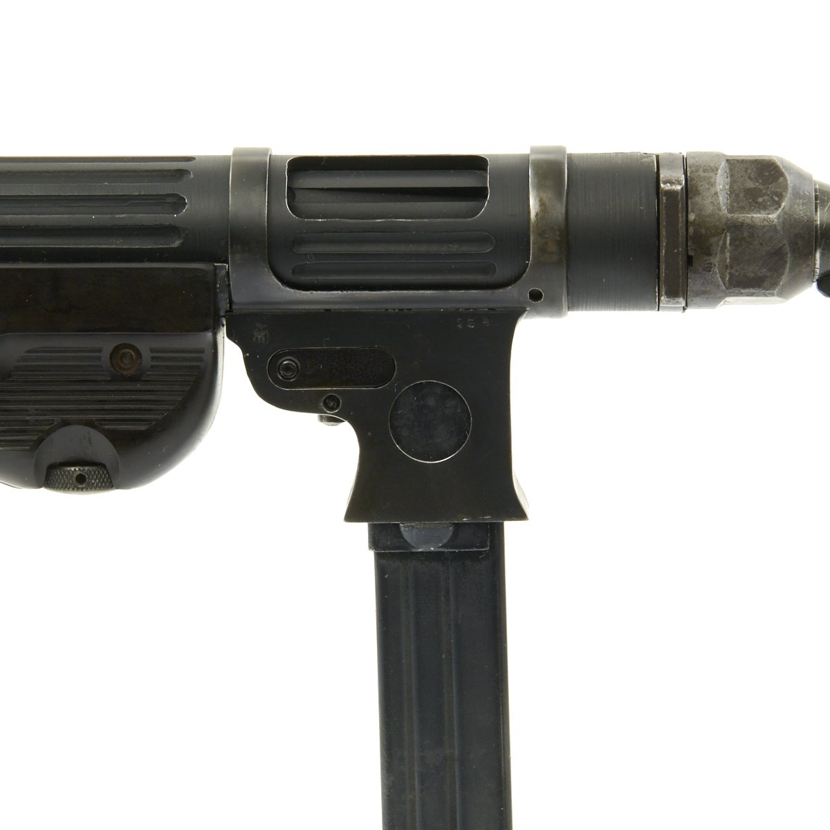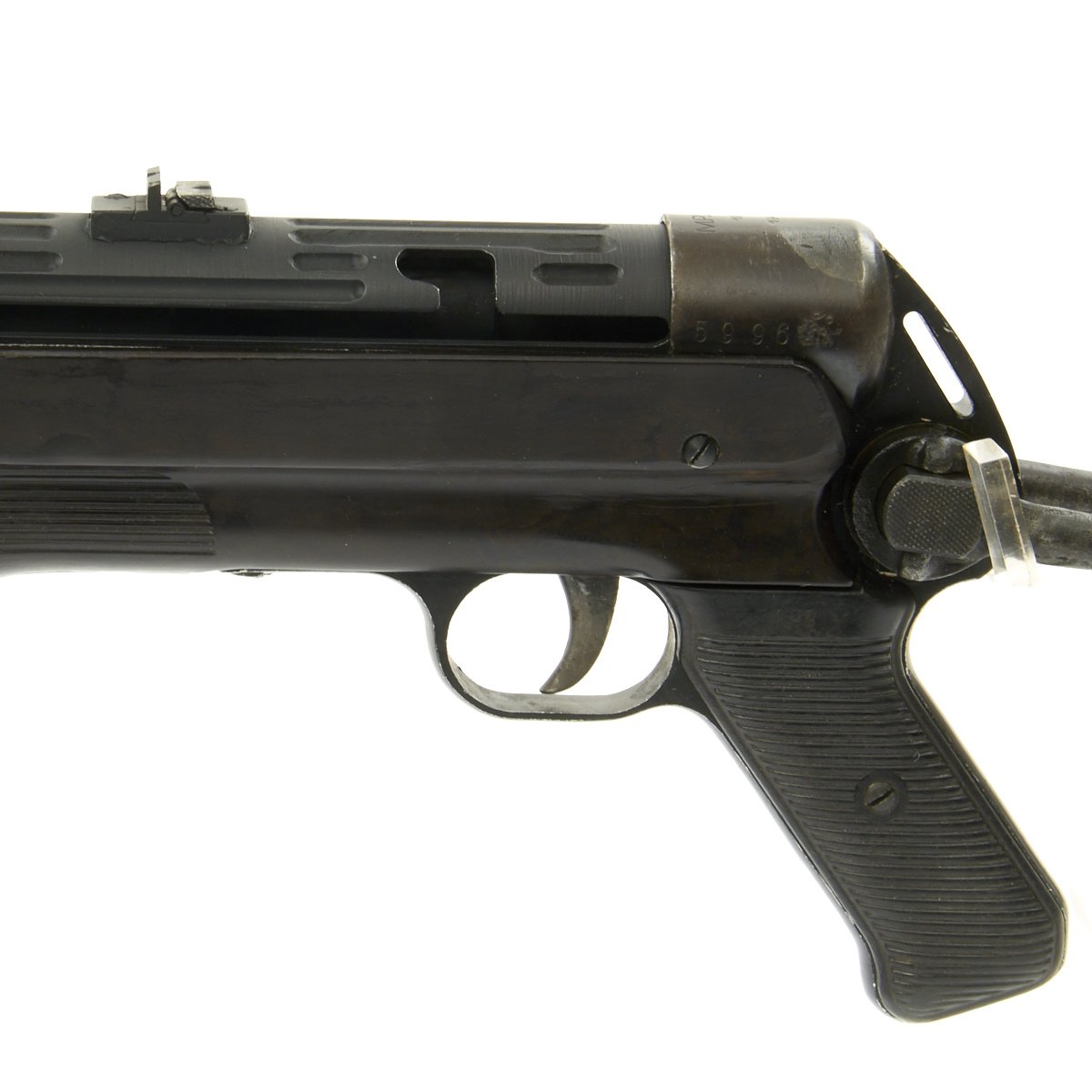 This MP 38 with correct MP38 features of aluminum pistol grip frame, correct rear receiver housing with markings, holed magazine housing and with wonderful replicated MP 38 fluted display receiver and fitted with the original MP 38 upgraded "push/pull" safety bolt handle. All parts are in excellent condition and bear serial numbers (unmatched). The barrel is live having been imported in the 1970s. Magazine is also fully functional but will be deactivated in order to ship to States where prohibited.