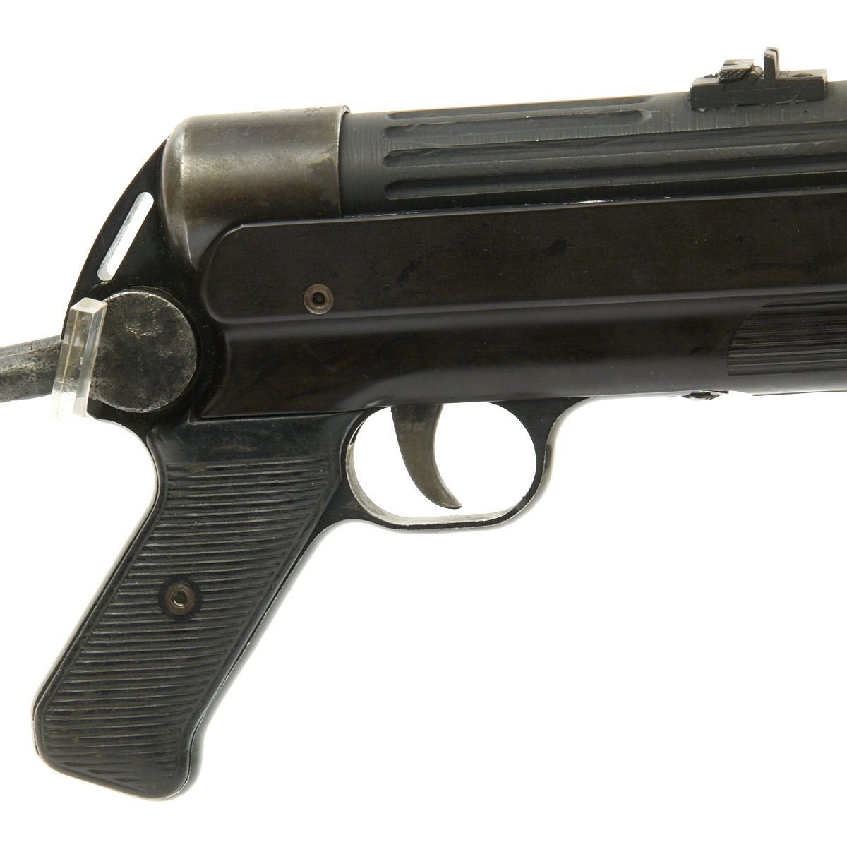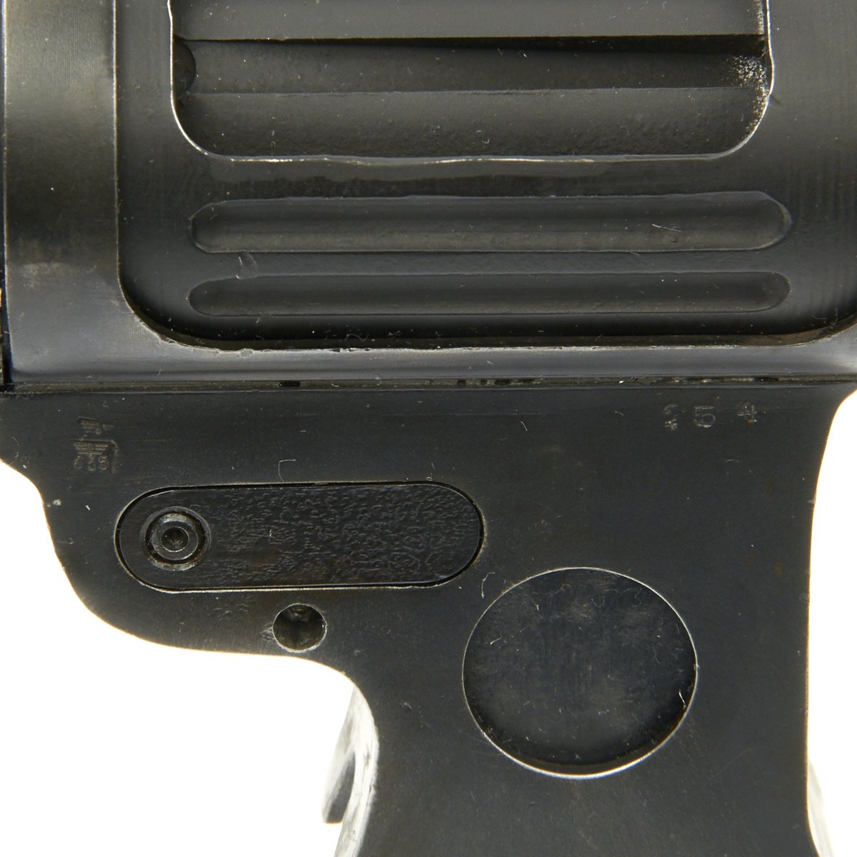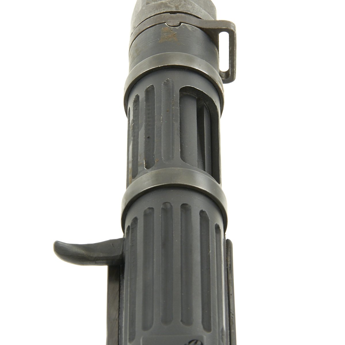 This MP 38 with correct MP38 features of aluminum pistol grip frame, correct rear receiver housing with markings, holed magazine housing and with wonderful replicated MP 38 fluted display receiver and fitted with the original MP 38 upgraded "push/pull" safety bolt handle. All parts are in excellent condition and bear serial numbers (unmatched). The barrel is live having been imported in the 1970s. Magazine is also fully functional but will be deactivated in order to ship to States where prohibited.